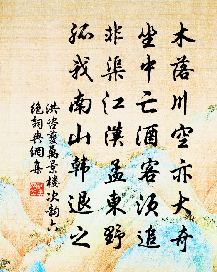 詩詞名句歷史字典書法欣賞書法字典國語詞典說文解字康熙字典古漢語字典標 題 作 者 詩 句 萬景樓次韻六絕作者:洪咨夔 朝代:宋代萬景樓次韻六絕原文木落川空亦大奇,坐中亡酒客須追。非渠江漢孟東野,孤我南山韓退之。詩詞問答問:萬景樓次韻六絕的作者是誰?答:洪咨夔問:萬景樓次韻六絕寫於哪個朝代?答:宋代洪咨夔萬景樓次韻六絕書法欣賞萬景樓次韻六絕書法作品詩詞推薦題梅山雲悅樓鍾訧〔宋代〕我匪悅云云悅我,雲兮與我一無心。知君只愛雲中隱,不肯出山無處尋。山中敘志王績〔唐代〕物外知何事,山中無所有。風鳴靜夜琴,月照芳春酒。直置百年內,誰論千載後。張奉娉賢妻,老萊藉嘉偶。孟光答臨淄公見招韓維〔宋代〕帝思元老付關西,公受兵符與命圭。應識疲羸須鎮撫,便期愚散豫招攜。漢家宮殿看龍首,秦地山川入馬蹄。自愧紹興十四年奉上徽宗冊實三首真宗〔宋代〕於鑠徽考,如天莫名。迨茲丕揚,擬純粹精。溫玉鏤文,來至於祊。有嚴奕奕,禮備樂成。送高學士知越陳知微〔宋代〕會稽新命剖魚符,又向蓬山鎖直廬。林壑縈迴多洞府,人煙高下半樓居。知音好采柯亭竹,博物應探禹穴書。公暇和林寶文吹暑軒二絕王炎〔宋代〕木末長風送雨來,田家遠近稻花開。披襟燕坐黃堂靜,一笑江山爽氣回。八月八日發潭州後得絕句四十首趙蕃〔宋代〕晚日才能度兩灘,詰朝應復又成乾。從來但說溯流苦,到我順流良亦難。行飯暮歸陸游〔宋代〕宿疾去如掃,出門芒屨輕。菊叢寒蝶鬧,楓葉夕陽明。結陣看鴉集,銜衣喜犬迎。踟躇搔白首,詩句入經營。謝韓孔惠見訪劉克莊〔宋代〕千林黃落澗冰堅,應是江湖作雪天。偶有客過居士室,絕無人識孝廉船。繡衣二使交章薦,黃冊諸郎律賦傳。莫向別趙惟直李流謙〔宋代〕邂逅都城一笑休,卻來萬里共羈游。關河地迥仍分首,桃李春深已放舟。詩卷長留開倦目,酒杯盡嚼豁離居。追風隆興書堂自警三十五首陳淳〔宋代〕茫茫八極內,何莫非斯人。苟非富道義,何異彼黔民。跋劉敏叔畫楊誠齋先生探梅圖鄧剡〔宋代〕夜起詩翁吟骨健,雪寒梅瘦月初生。誰教霜月閒描畫,景物和人成五清。隱居耕吳〔宋代〕得失雨忘機,何心問是非。難求斬馬劍,且守釣魚磯。鶴瘦添新料,兒寒補舊衣。詩成興飄逸,天外片雲飛。和劉與幾悟昔吳芾〔宋代〕先生豈是傲當時,知向名場是識機。擾擾半生蝴蝶夢,休休今日綠蓑衣。筆端信有江山助,醉里從教日月飛。應笑送董伯和西歸陳著〔宋代〕葉葉青霞衣,來赴山中期。相看到忘言,日夜春風吹。昨夜雨瀟瀟,今日君欲歸。人生如夢寐,世道正嶮巇。我發嘉定庚辰正月二日楊尚書率同年團拜於西湖之崔與之〔宋代〕雪裡同騎白玉鰲,湖山人物一時高。銀潢下瀉波千頃,寶鑑帝開水半篙。我欲乘風驚老大,誰將翦水戲兒曹。梅花秋思絕句陸游〔宋代〕黃蛺蝶輕停曲檻,紅蜻蜓小過橫塘。老人未肯殺風景,睡起熏籠重炷香。出都赴鄭作宋庠〔宋代〕初免鴻樞任,無庸白髮身。衰年雖去國,榮路尚妨人。官借荀池舊,恩加漢節新。鳴鐃先繡幰,彀騎挾朱輪。梁雪和百塔寺四首水閣黃庶〔宋代〕山僧聽泉心不足,鑿池汲引為蟾泓。自言猶欲洗俗耳,夜靜為聞蛙黽聲。贈風鑒神眼徐元傑〔宋代〕世道支撐盡要人,閱人多後眼通神。一朝相去三丞相,今昔同歸識認親。名句推薦親所好,力為具。親所惡,謹為去。李毓秀《弟子規·入則孝》 我亦飄零久!顧貞觀《金縷曲二首》 馬蹄濃露,雞聲淡月,寂歷荒村路。張榘《青玉案·被檄出郊題陳氏山居》 天蒼蒼,野茫茫。風吹草低見牛羊。佚名《敕勒歌》 書無不可讀者!魏徵《隋書·列傳·卷四十一》 芳樹無人花自落,春山一路鳥空啼。李華《春行即興》 魯酒不可醉,齊歌空復情。李白《沙丘城下寄杜甫》 小娃撐小艇,偷采白蓮回。白居易《池上》 審知四度,可以定天下,可安一國。佚名《黃帝四經·經法·四度》 深知身在情長在,悵望江頭江水聲。李商隱《暮秋獨游曲江》