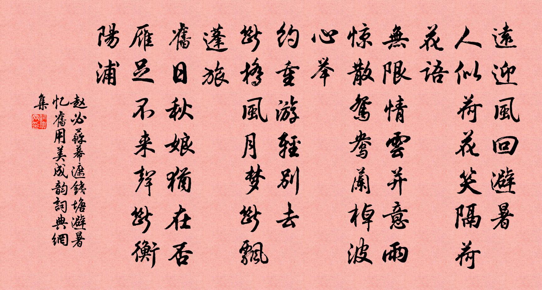 詩詞名句歷史字典書法欣賞書法字典國語詞典說文解字康熙字典古漢語字典標 題 作 者 詩 句 蘇幕遮(錢塘避暑憶舊用美成韻)作者:趙必 朝代:宋代原文遠迎風,迴避暑。人似荷花,笑隔荷花語。無限情雲並意雨。驚散鴛鴦,蘭棹波心舉。約重遊,輕別去。斷橋風月,夢斷飄蓬旅。舊日秋娘猶在否。雁足不來,聲斷衡陽浦。詩詞問答問:《蘇幕遮(錢塘避暑憶舊用美成韻)》的作者是誰?答:趙必問:該詩寫於哪個朝代?答:宋代問:該詩是什麼體裁?答:詞書法欣賞蘇幕遮(錢塘避暑憶舊用美成韻)書法作品詩詞推薦六月二十四日病起,喜雨聞鶯,與大兒議秋涼楊萬里〔宋代〕病勢初來敵頗強,排山倒海也難當。老夫笑把東西玉,堅子難藏上下盲。酒陣時聞報三捷,詩壇元不費單槍。夜來銅江程九萬〔宋代〕飛鳥投林去復還,臨風恆憶舊家山。平生杖履經行處,杳在雲煙仿佛間。紹熙壬子勸耕妙勝四首陳造〔宋代〕勝日乘閒覺半仙,笑摩老眼向風煙。平章春事禽能語,媚嫵韶光柳未眠。促織王安石〔宋代〕金屏翠幔與秋宜,得此年年醉不知。只向貧家促機杼,幾家能有一絇絲。眼兒媚黃公度〔宋代〕羊,嘗遺示梅詞。公依韻和之。初公被召命而西過分水嶺,有詩云:“嗚咽泉流萬仞峰,斷腸從此各西東。誰知不靠袋睡贊釋紹曇〔宋代〕弄盡千般死伎,布袋全身靠倚。尋思總是虛花,不如打覺瞌睡。挽太學正節先生徐應鑣何夢桂〔宋代〕國破君亡一死宜,絕憐兒女死如飴。龍池久負媧皇誓,蛙坎空遺烈士悲。洗骨不污唐門館,瀝心無愧趙孤兒。北行七十八詠六言十首劉克莊〔宋代〕早退似見幾者,晚繆可追悔哉。已戴華陽巾去,肯扶靈壽杖來。自詠蔡權〔宋代〕故居薦山東,十載去不還。故人廬峰北,一念長周旋。風波既渺藐,歲月空推延。園地益新好,亭館故依然。憶昔葛興祖輓辭王安石〔宋代〕憶隨諸彥附青雲,場屋聲名看出群。孫寶暮年猶主簿,卜商今日更修文。山川凜凜平生氣,草木蕭蕭數尺墳。欲寫行次德清張鎡〔宋代〕浮圖立處覓天低,迎我船行十里時。不是前山明復暗,那知頭上白雲移。津亭胡宿〔唐代〕津亭欲闋戒棠舟,五兩風來不暫留。西北浮雲連魏闕,東南初日滿秦樓。層城渺渺人傷別,芳草萋萋客倦遊。平樂題日涉園吳芾〔宋代〕幽園足佳趣,散策日經行。歲久禽魚熟,人來自不驚。次韻張著作文潛飲王舍人才元家時坐客戶部李晁補之〔宋代〕霜雪埋百花,及時斗春陽。城南有高士,買屋入花藏。經時不出門,為花日日忙。我居在何許,近止東數坊。亦有先世藏減筆盡馬甚精妙因亂失之追悼賦比汪炎昶〔宋代〕無韓妙筆見無由,一馬長鳴塞草秋。敗素煙昏誰解惜,監車獨自困驊騮。禪人並化主寫真求贊釋正覺〔宋代〕剎剎塵塵,隨應現身。百川之月,百華之春。阿你隨宜手眼快,更誰敢議骨頭貧。道交德鄰,主主賓賓。三世混融題畫蘭卷兼梅花王冕〔元代〕湘江雲盡湘山青,秋蘭花開秋露零。三閭已矣喚不起,□蕕蕭艾春娉婷。次飈吹香散郊坰,山蜂野蝶何營營?幽人和韓錄事送宮人入道李商隱〔唐代〕星使追還不自由,雙童捧上綠瓊輈。九枝燈下朝金殿,三素雲中侍玉樓。鳳女顛狂成久別,月娥孀獨好同游。當時岳陽樓晚眺即事疊韻四首高善濂〔宋代〕危樓縹緲倚闌斜,無數殘陽噪亂鴉。過客揚帆沖雪浪,漁人舉網出銀花。子聲落紙間聽奕,舌本留香為別茶。巫峽春芳曲楊維楨〔元代〕春容不再芳,春華不再揚。我欲倩遊絲,花前系春陽。春陽不可長,遊絲徒爾長。飛來雙蛺蝶,綴我羅衣裳。頓足名句推薦春去秋來也,愁心似醉醺。歐陽炯《巫山一段雲·春去秋來也》 兵久則力屈,人悉則變生。范曄《後漢書·列傳·桓譚馮衍列傳上》 夜來能有幾多寒,已瘦了、梨花一半。黃升《鵲橋仙·春情》 昔時人已沒,今日水猶寒。駱賓王《於易水送人 / 於易水送別》 山河破碎風飄絮,身世浮沉雨打萍。文天祥《過零丁洋》 日月忽其不淹兮,春與秋其代序。屈原《離騷》 寒食後,酒醒卻咨嗟。蘇軾《望江南·超然台作》 長江萬里東注,曉吹卷驚濤。吳潛《水調歌頭·焦山》 玉人初上木蘭時。懶妝斜立澹春姿。吳文英《浣溪沙·題李中齋舟中梅屏》 獨上江樓思渺然,月光如水水如天。趙嘏《江樓舊感》