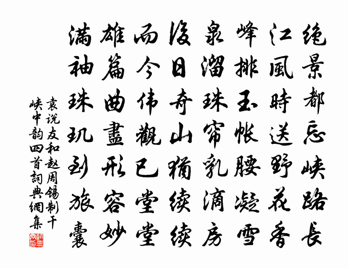 詩詞名句歷史字典書法欣賞書法字典國語詞典說文解字康熙字典古漢語字典標 題 作 者 詩 句 和趙周錫制乾峽中韻四首作者:袁說友 朝代:宋代和趙周錫制乾峽中韻四首原文絕景都忘峽路長,江風時送野花香。峰排玉帳腰凝雪,泉溜珠簾乳滴房。後日奇山猶續續,而今偉觀已堂堂。雄篇曲盡形容妙,滿袖珠璣到旅囊。詩詞問答問:和趙周錫制乾峽中韻四首的作者是誰?答:袁說友問:和趙周錫制乾峽中韻四首寫於哪個朝代?答:宋代袁說友和趙周錫制乾峽中韻四首書法欣賞和趙周錫制乾峽中韻四首書法作品詩詞推薦滿江紅(和虞土胥·惠生日)魏了翁〔宋代〕月上南箕,還認得、去年星曆。知誰把、一天星象,盪摩朝昔。若使平生渾自棄,如今老大何嗟及。更年來、偏得送程尊師之晉陵羅隱〔唐代〕棟間雲出認行軒,郊外陰陰夏木繁。高道乍為張翰侶,使君兼是世龍孫。溪含句曲清連底,酒貰餘杭淥滿樽。莫見和陳叔易見寄晁說之〔宋代〕終日焚香卻袢暑,只此於君愧典刑。莫怪殷勤問元朗,此心要自渴滄溟。羅漢寺白玉蟾〔宋代〕林閒一徑似驚蛇,中有禪關閉紫霞。煙鎖蒼松遮寺額,風搖翠竹撼檐牙。客來寂寞盤香穗,飯後從容瀹 花。到此喜山甫相過舒岳祥〔宋代〕夢回春草遠,病起故人來。耿耿孤燈話,沈沈細雨杯。千愁雙鳥過,一笑百花開。世事渺煙水,相攜臥綠苔。虞使君示春日喜雨六絕和韻程公許〔宋代〕引袂天負幾席傍,滿城無處不甘棠。定知丹雀銜書近,趣擁弓旌入帝鄉。黃寬夫示詩不已自和前二首答之劉克莊〔宋代〕精思巧斬詩家事,繆敬陽尊市道交。杜說新詩猶費改,韓評推字不如敲。衣傳曾飲先師乳,弦絕今無異域膠。欲引游金精山黎宙〔宋代〕不到金精久,山空花自香。殿梁唐歲月,石鼓漢文章。洞杳多雲氣,崖高易夕陽。酌泉消世慮,吾亦正徜徉。旅懷文天祥〔宋代〕天地雖寬靡所容,長淮誰是主人翁。江南父老還相念,只欠一帆東海風。鴨湖盧廷輔〔宋代〕並山終日艤孤舟,深入桃蹊訪阮劉。流水落花無問處,居人云是古瀛洲。約周希稷游湖上園張鎡〔宋代〕句法參同李翰林,風流依約謝宣城,放懷應喜醉三日,聽曲知無誤一聲。箬葉露方高石室,桂枝香譜度銀笙。西湖山中自述於鵠〔唐代〕三十無名客,空山獨臥秋。病多知藥性,年長信人愁。螢影竹窗下,松聲茅屋頭。近來心更靜,不夢世間游。送楊伯子知南昌縣周必大〔宋代〕往年餞尊公,出宰新吳縣。仁愛馴桑雉,聖明遇禾絹。君今治南昌,家學世其官。密令行教化,明庭集孔鸞。煌煌溪行陸龜蒙〔唐代〕晚天寒雨上灘時,他已揚舲我尚遲。自是檣低帆幅少,溪風終不兩般吹。梁國惠康公主輓歌詞二首(駙馬即司空於公之子)羊士諤〔唐代〕湯沐成陳跡,山林遂寂寥。鵲飛應織素,鳳起獨 * 。玉殿中參罷,雲輧上漢遙。皇情非不極,空輟未央朝。授冊召旻佚名〔先秦〕旻天疾威,天篤降喪。瘨我饑饉,民卒流亡。我居圉卒荒。天降罪罟,蟊賊內訌。昏椓靡共,潰潰回遹,實靖夷我鷓鴣天 過新樂縣李齊賢〔元代〕宿雨連明半未晴。跨鞍聊復問前程。野田立鶴何山意,驛柳鳴蜩是處聲。千古事,百年情。浮雲起滅月虧盈。詩成宴城東莊崔敏童〔唐代〕一年始有一年春,百歲曾無百歲人。能向花前幾回醉,十千沽酒莫辭貧。滿庭芳 贈醴泉縣任公馬鈺〔元代〕任公決裂,也待風流。專心道上搜求。子細研窮,何者名為真修。認正即心是佛,除心外、匪是良由。無別法,便詠畫屏風詩 十五庾信〔南北朝〕河流值淺岸。斂轡暫經過。弓衣濕濺水。馬足亂橫波。半城斜出樹。長林直枕河。今朝遊俠客。不畏風塵多。名句推薦薄霧濃雲愁永晝,瑞腦銷金獸。李清照《醉花陰·薄霧濃雲愁永晝》 春田龜坼苗不滋,猶賴立春三日雪。王士禎《春不雨》 不近人情,舉世皆畏途;不察物情,一生俱夢境。陳繼儒《小窗幽記·集醒篇》 亂點碎紅山杏發,平鋪新綠水蘋生。白居易《南湖早春》 蟬鳴空桑林,八月蕭關道。王昌齡《塞下曲四首》 陪都歌舞迎佳節,遙祝延安景物華。 * 《元旦口占用柳亞子懷人韻》 春風春雨花經眼,江北江南水拍天。黃庭堅《次元明韻寄子由》 傷心莫語,記那日旗亭,水嬉散盡,中酒阻風去。納蘭性德《摸魚兒·午日雨眺》 莫笑農家臘酒渾,豐年留客足雞豚。陸游《游山西村》 此生誰料,心在天山,身老滄洲。陸游《訴衷情·當年萬里覓封侯》