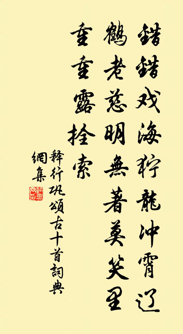 詩詞名句歷史字典書法欣賞書法字典國語詞典說文解字康熙字典古漢語字典標 題 作 者 詩 句 頌古十首作者:釋行鞏 朝代:宋代頌古十首原文錯錯,戲海獰龍,沖霄遼鶴。老慈明,無著莫,笑里重重露拴索。詩詞問答問:頌古十首的作者是誰?答:釋行鞏問:頌古十首寫於哪個朝代?答:宋代釋行鞏頌古十首書法欣賞頌古十首書法作品詩詞推薦雨杜牧〔唐代〕連雲接塞添迢遞,灑幕侵燈送寂寥。一夜不眠孤客耳,主人窗外有芭蕉。送二郎君歸長安劉兼〔唐代〕我兒辭去淚雙流,蜀郡秦川兩處愁。紅葉滿山歸故國,黃茅遍地住他州。荷衣曉掛慚官吏,菱鏡秋窺訝鬢髹。好向初夏六首方回〔宋代〕茂密逾千樹,深幽僅一家。新蟬初蛻殼,稚菊始分椏。潤氣青陰石,晴光白濕沙。晚涼督園叟,添竹引籬瓜。減字木蘭花(送別)蘇軾〔宋代〕天台舊路。應恨劉郎來又去。別酒頻傾。忍聽陽關第四聲。劉郎未老。懷戀仙鄉重得到。只恐因循。不見如今勸酒寄李公達韓維〔宋代〕早為書殿同遊客,嘗貳侯藩共理臣。流景又逢 * 節,狂歡猶記紫荊春。浮生幾度花前飲,訪舊多為柏下人。聞說夜行船侯善淵〔元代〕*雪囊中無俗物。恣疏慵、有誰拘束。不患虛名,無榮無辱。佻佻幾人相逐。獨坐弦歌*盈卮。昂簪看、斷雲相續和續古蜜木洪咨夔〔宋代〕參桂齊名骨自香,百花釀醑助甘涼。含金咀玉風標別,消得肩吾為發揚。句范雍〔宋代〕清涼萬杉下,蒼翠五峰前。春晚客懷 其三王冕〔元代〕衣袖露兩肘,難留俠客槌。對山長發嘯,得酒忽忘詩。樹濕吳雲重,花殘越鳥悲。酸辛甘自受,襤褸愧妻兒。步王盧溪韻胡夢昱〔宋代〕新來時事不相關,贏得蠻荒日月間。豐陬凡戊照碧漢,任他黃口鬧清班。非求美譽傳千古,不欲浮生愧兩間。天亦送宮人入道歸山於鵠〔唐代〕十歲 * 入漢宮,看修水殿種芙蓉。自傷白髮辭金屋,許著黃衣向玉峰。解語老猿開曉戶,學飛雛鶴落高松。定知已亥雜詩 82龔自珍〔清代〕龍樹靈根派別三,家家楖栗不能擔。我書喚作三椏記,六祖天台共一龕。出入二嶺行舒岳祥〔宋代〕出童公,入童公,一嶺二水分西東。前山萬竹入新路,新路蒼海通方蓬。入黃甘,出黃甘,一山二水分北南。北南見征客始還遇獵詩庾信〔南北朝〕貳師新受詔。長平正凱歸。猶言乘戰馬。未得解戎衣。上林遇逐獵。宜春蹔合圍。漢帝熊猶憤。秦王雉更飛。故人卜運算元馬鈺〔元代〕乾祿已無心,唯應三清舉。鍾呂天差作試官,取捨非詩賦。考校實修持,功行三千數。相應希夷得自然,名錄神仙留別盧玄休歸荊門朱慶餘〔唐代〕江邊離別心,言罷各沾襟。以我去帆遠,知君離恨深。雲開孤鳥出,浪起白鷗沈。更作來年約,陽台許伴尋。過窮頭嶺洪皓〔宋代〕驅車陟峻阪,牛斃轍亦敗。羊腸雖雲險,茲險最奇怪。千里無爨煙,四顧多障礙。菸草何茫茫,信是要荒外。平生西江月楊冠卿〔宋代〕論行藏。盍在凌煙閣上。”因次其韻妙墨龍蛇飛動,新詞雪月交光。論文齒頰帶冰霜。鳳閣從來宮樣。壽菊叢開三望蓬萊王哲〔元代〕猿馬住,性命自然知。一粒刀圭開四象,兩般槍法殺三屍。神水溉華池。,公看取,便是坎和離。土馬趕回金虎子和吳{左山右肅}岩韻朱南傑〔宋代〕春回筆底露潛機,為怯高吟且遁肥。又見牛鞭春到日,羞披鶉結舊來衣。雪隨著處分單厚,梅不關人自密稀。歸計名句推薦內外相應也,言行相稱韓非及後人《韓非子·解老》 皎皎窗中月,照我室南端。潘安《悼亡詩三首》 但信己,不信人,此取敗之由也。王永彬《圍爐夜話·第八五則》 窮猿投林,豈暇擇木!房玄齡《晉書·列傳·第六十二章》 遠與君別者,乃至雁門關。江淹《古離別》 西北望長安,可憐無數山辛棄疾《菩薩蠻·書江西造口壁》 幽微靈秀地,無可奈何天。曹雪芹《紅樓夢·第五回》 任力者故勞,任人者故逸。呂不韋《呂氏春秋·論·開春論》 殘日東風,不放歲華去。吳文英《祝英台近·除夜立春》 雖有戈矛之刺,不如恭儉之利也。荀子《荀子·榮辱》