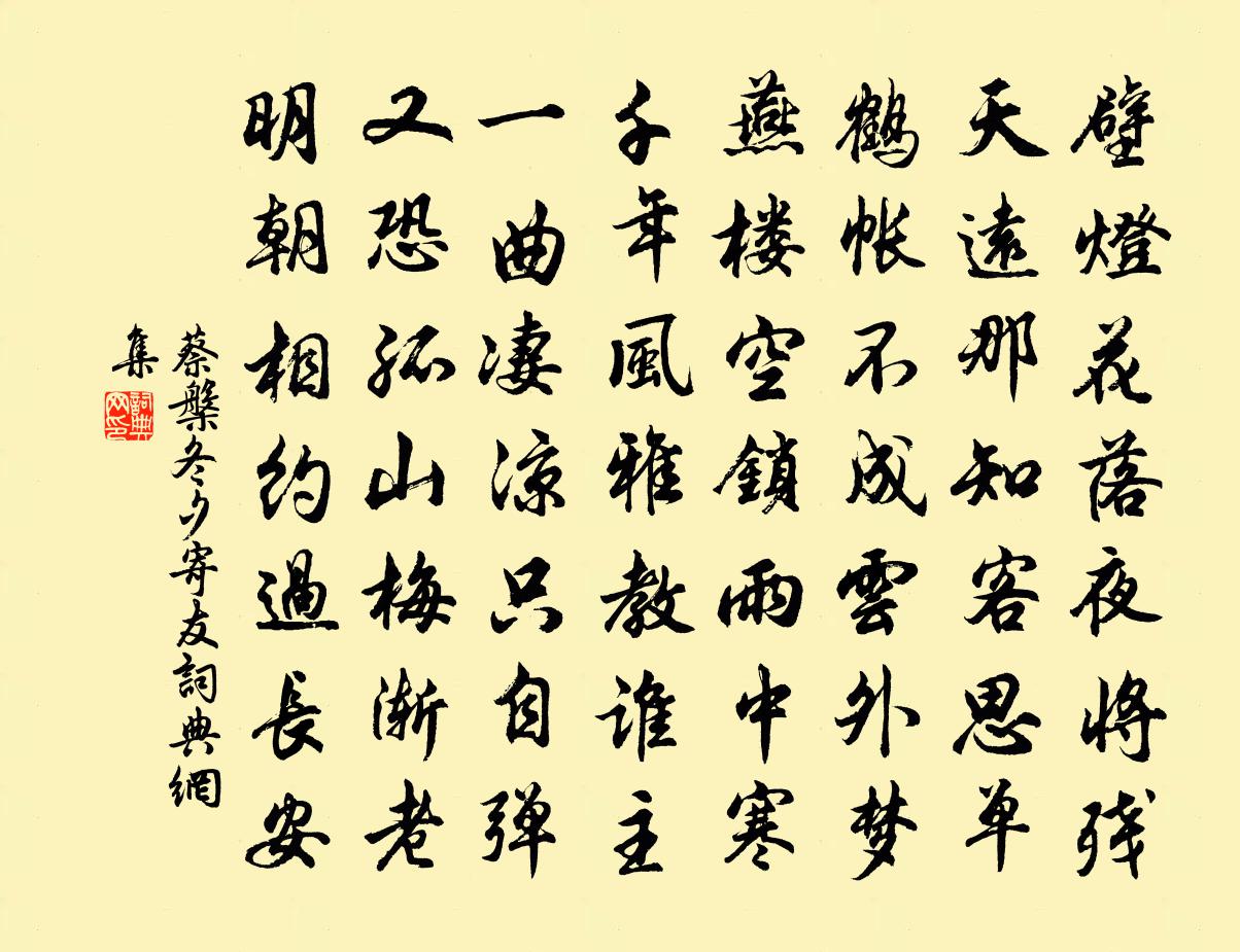 詩詞名句歷史字典書法欣賞書法字典國語詞典說文解字康熙字典古漢語字典標 題 作 者 詩 句 冬夕寄友作者:蔡槃 朝代:宋代冬夕寄友原文壁燈花落夜將殘,天遠那知客思單。鶴帳不成雲外夢,燕樓空鎖雨中寒。千年風雅教誰主,一曲淒涼只自彈。又恐孤山梅漸老,明朝相約過長安。詩詞問答問:冬夕寄友的作者是誰?答:蔡槃問:冬夕寄友寫於哪個朝代?答:宋代蔡槃冬夕寄友書法欣賞冬夕寄友書法作品詩詞推薦送楊主簿項安世〔宋代〕書生歲晚亦無餘,朝作新詩暮看書。書為送人知免矣,詩仍隨子獨何歟。欄憑罨畫山光曉,船剌湘羅日影初。可是念奴嬌 寄蕭善雲吳景奎〔元代〕絳河明月,到中秋、不比尋常三五。神女夢,寒生嫉妒,特地行雲行雨。天上嬋娟,人間陰晦,悵望成淒楚。金尊臘日出獵因游梅山蘭若梅堯臣〔宋代〕我與二三騎,爭馳孤戍旁。逐麋逢野寺,息馬據胡床。鷹想支公好,人思濡上狂。歸來何薄暮,煙火照溪光。偈頌九首釋如淨〔宋代〕跳出淨慈牛欄,撞入太白馬廄。一團罪業黑漫,風吹日炙薰天。禪人並化主寫真求贊釋正覺〔宋代〕功轉密藏,尋蹤跡以無方。影現益彰,歷因緣而有常。身分塵剎普,舌拄梵天長。心心不觸菩提用,法法無依般若臨江仙 張光甫家兒子咬驢元好問〔金代〕膝上添丁郎小小,*雛彩鶴初勻。書堂合與孟家鄰。誦詩琴解□,論學墨沾唇。頭玉**眉刷翠,更將秋水為神。雪中偶書鄭剛中〔宋代〕幾日同頭臘雪飛,人生悲樂自隨宜。抱衾萬感客無寐,踏濕孤燈僧夜歸。哭山中友人張籍〔唐代〕入雲遙便哭,山友隔今生。繞墓招魂魄,鐫岩記姓名。犬因無主善,鶴為見人鳴。長說能屍解,多應別路行。舍轎馬而步孔武仲〔宋代〕嚴風駕雪霜,吾轎頗溫燠。白日暖郊原,吾馬快馳逐。二者皆得用,翩如兩黃鵠。馬驕倦提策,橋狹厭攣束。何以漁家傲黃庭堅〔宋代〕百丈峰頭開古鏡。馬駒踏殺重甦醒。接得古靈心眼淨。光炯炯。歸來藏在袈裟影。好個佛堂佛不聖。祖師沈醉猶看間步劉過〔宋代〕山徑無人鳥篆沙,杖藜間看摘新茶。錦級委地筍翻籜,黃玉滿林松帶花。齊世家李覯〔宋代〕莫以荒淫便責君,大都危亂為無臣。若教管仲身長在,何患夫人更六人。次韻張濟川二首李若水〔宋代〕父老霑襟訟不平,千岩鬼哭亂泉聲。烏鳶誤飽忠義肉,點檢戰功誰眼明。卜運算元郭應祥〔宋代〕春事到清明,過了三之二。穠李夭桃委路塵,太半成泥滓。只有海棠花,恰似楊妃醉。折向銅壺把燭看,且莫教渠金剛隨機無盡頌福智無比分第二十四釋印肅〔宋代〕無為福勝田,頓覺如來禪。阿鼻剎那滅,八萬及四千。池上小宴問程秀才白居易〔唐代〕洛下林園好自知,江南境物暗相隨。淨淘紅粒罯香飯,薄切紫鱗烹水葵。雨滴篷聲青雀舫,浪搖花影白蓮池。停杯送鄭端州劉克莊〔宋代〕想入漳潮境,牙旗夾路紅。帝方憂瘴俗,君可惠清風。海有沉珠戶,岩無斬硯工。它年循吏傳,要雜古人中。紹熙癸丑二月二十六日蔣助教言正招游陽華婆李長庚〔宋代〕我識陽華六十年,當時面目故依然。清泉白石都無恙,華發蒼顏只自憐。歸舟衛宗武〔宋代〕回艇臨塘路,撁夫欣路平。歸鴻千里近,過鳥一身輕。溪派分頭去,山光戀眼明。松江水雲際,屈指不多程。送胡邦衡之新州貶所王庭珪〔宋代〕大廈元非一木支,欲將獨力拄傾危。痴兒不了公家事,男子要為天下奇。當日奸諛皆膽落,平生忠義只心知。端能名句推薦將順其美,匡救其惡,故上下能噲親也司馬遷《史記·管晏列傳》 懷家寒食夜,中酒落花天。趙長卿《臨江仙·暮春》 辜負我,悔憐君,告天天不聞。牛嶠《更漏子·春夜闌》 夕陽西下,斷腸人在天涯。馬致遠《天淨沙·秋思》 四寸之管無當,必不滿也。授官、予爵、出祿不以功,是無當也。商鞅《商君書·靳令》 楚水辭魚窟,燕山到雁家裴說《塞上曲》 山遠近,路橫斜,青旗沽酒有人家。辛棄疾《鷓鴣天·陌上柔桑破嫩芽》 天下無難事,只怕有心人。曹雪芹《紅樓夢·第四十九回》 蘭有秀兮菊有芳,懷佳人兮不能忘。劉徹《秋風辭》 秋空明月懸,光彩露沾濕。孟浩然《秋宵月下有懷》
