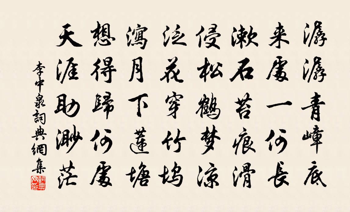 詩詞名句歷史字典書法欣賞書法字典國語詞典說文解字康熙字典古漢語字典標 題 作 者 詩 句 泉作者:李中 朝代:唐代泉原文潺潺青嶂底,來處一何長。漱石苔痕滑,侵松鶴夢涼。泛花穿竹塢,瀉月下蓮塘。想得歸何處,天涯助渺茫。詩詞問答問:泉的作者是誰?答:李中問:泉寫於哪個朝代?答:唐代問:泉是什麼體裁?答:五律李中泉書法欣賞泉書法作品注釋全唐詩:卷750-23詩詞推薦黃兵部生辰仲並〔宋代〕地上泉流府庫充,艱難天與歲時豐。他時若論關中漕,合數蕭何第一功。春日雜詠九首李彌遜〔宋代〕不作觚稜夢,長閒地角身。南冠欲從楚,西笑取懷秦。鴻雁猶千里,牛羊絕四鄰。門羅今可設,更恐白頭新。八月章孝標〔唐代〕徙倚仙居繞翠樓,分明宮漏靜兼秋。長安夜夜家家月,幾處笙歌幾處愁。木蘭花慢 題倪都運南塘蓮社廬山社蘭亭會後胡祗遹〔元代〕知前代尊俎風流,猶為人永永景慕。其於善行名言,豐功懋烈,誰得而廢之。去歲夏,仆忝與賓末,僅贅一闋,庶九月十日陸游〔宋代〕不須扇障庾公塵,散地翛然學隱淪。風帽可憐成昨夢,菊花已覺是陳人。昏昏但苦餘酲在,草草久無佳句新。嘆息偶成陳著〔宋代〕生計何曾問有無,心安便是邵堯夫。攙春菜奉清饕味,耐凍梅呈本相癯。閉戶茶香浮雪屋,推窗山影落冰壺。終朝浣溪沙黃機〔宋代〕日轉雕欄午漏分。井梧落盡小窗明。寶床絲索懶關心。愁壓春山應脈脈,困凝秋水想沈沈。低頭時露一灣金。阻風宿大信口梅堯臣〔宋代〕東梁如印蠶,西梁如游魚。二山夾大江,早暮潮吸噓。解舟辭姑熟,速欲還吾廬。風逆未可前,泊浦近煙墟。波中送人之漢上周弼〔宋代〕木落千山怨別離,自知難駐馬行蹄。上書季子窮歸路,獻賦荀卿老向齊。驛店破旗秋雨細,戍樓殘角夕陽低。袖藏減字木蘭花周紫芝〔宋代〕西山岩桂。常恨香聞煙雨外。何似君家。戲彩堂前早試花。黃金千粟。風撼芳條香馥馥。一剪無多。桃李漫山奈俗江岸春日董嗣杲〔宋代〕見易園中春艷時,千朵萬朵好花枝。樓台只有提壺叫,晴雨能無蛺蝶知。鉛山寫懷曹松〔唐代〕天涯兵火後,風景畏臨門。骨肉到時節,團圓因夢魂。池塘營水眼,嶺嶠結花根。耳縱聽歌吹,中心不可論。秋日馬上周弼〔宋代〕本無謀略強談兵,每愧臨邊病未能。筋力豈知猶可喜,一鞍千里到江陵。春山文同〔宋代〕岡原草木秀,溪谷雲霞媚。君筆誰所傳,獨解吐和氣。兒寬徐鈞〔宋代〕射策明經亦巨儒,巧迎封禪意何如。相如未死猶知恥,卻了相如死後書。臥龍潭孔武仲〔宋代〕已登臥龍庵,更看臥龍瀑。來從不盡山,奔入無底谷。谷中鳴百雷,林外漱寒玉。雄豪與清泚,上下相接續。陽崖木芙蓉劉兼〔唐代〕素靈失律詐風流,強把芳菲半載偷。是葉葳蕤霜照夜,此花爛熳火燒秋。謝蓮色淡爭堪種,陶菊香穠亦合羞。誰道葉大卿輓詞三首梅堯臣〔宋代〕自古賢才少,滔滔豈足雲。善人安得見,清譽久來聞。器隕龍文鼎,魂歸馬鬣墳。豐碑幾當立,籍甚著遺芬。故蕭尚書癭柏齋前玉蕊樹,與王起居吏部孟員外同賞羊士諤〔唐代〕柏寢閉何時,瑤華自滿枝。天清凝積素,風暖動芬絲。留步蒼苔暗,停觴白日遲。因吟茂陵草,幽賞待妍詞。駕部鄭郎中三十八丈尹貳東周榮加金紫谷以末派…因賀送鄭谷〔唐代〕香浮玉陛曉辭天,袍拂蒲茸稱少年。郎署轉曹雖久次,京河亞尹是優賢。縱游雲水無公事,貴買琴書有俸錢。今日名句推薦息徒蘭圃,秣馬華山。嵇康《贈秀才入軍·其十四》 荊山長號泣血人,忠臣死為刖足鬼李白《鞠歌行》 秋娘渡與泰娘橋,風又飄飄,雨又蕭蕭。蔣捷《一剪梅·舟過吳江》 直道相思了無益,未妨惆悵是清狂。李商隱《無題·重幃深下莫愁堂》 朝聞遊子唱離歌,昨夜微霜初渡河。李頎《送魏萬之京》 南朝千古傷心事,猶唱後庭花。吳激《人月圓·南朝千古傷心事》 仁之實,事親是也;義之實,從兄是也。孟子《孟子·離婁章句上·第二十七節》 風也蕭蕭,雨也蕭蕭,瘦盡燈花又一宵。納蘭性德《採桑子·誰翻樂府淒涼曲》 八百里分麾下炙,五十弦翻塞外聲。辛棄疾《破陣子·為陳同甫賦壯詞以寄之》 坐開桑落酒,來把菊花枝。杜甫《九日楊奉先會白水崔明府》
