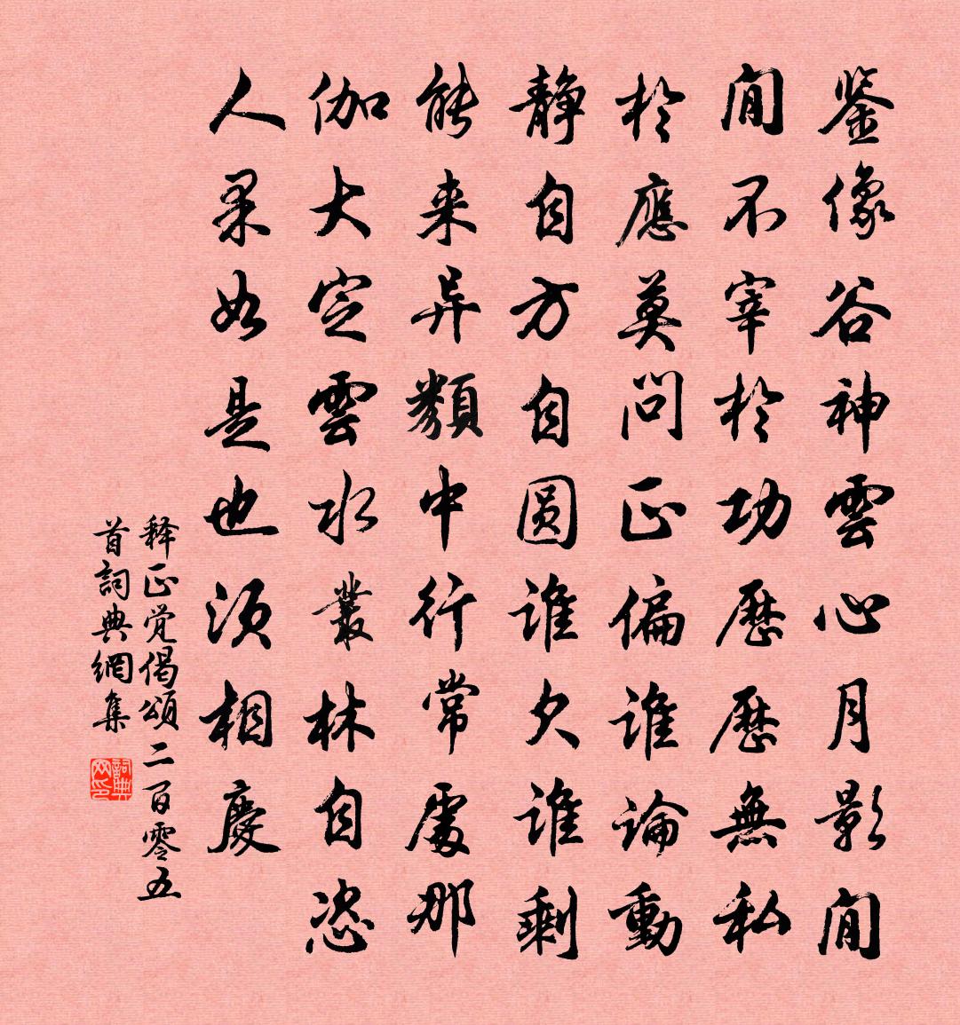 詩詞名句歷史字典書法欣賞書法字典國語詞典說文解字康熙字典古漢語字典標 題 作 者 詩 句 偈頌二百零五首作者:釋正覺 朝代:宋代偈頌二百零五首原文鑒像穀神,雲心月影。閒閒不宰於功,歷歷無私於應。莫問正偏,誰論動靜。自方自圓,誰欠誰剩。能來異類中行,常處那伽大定。雲水叢林自恣人,果如是也須相慶。詩詞問答問:偈頌二百零五首的作者是誰?答:釋正覺問:偈頌二百零五首寫於哪個朝代?答:宋代釋正覺偈頌二百零五首書法欣賞偈頌二百零五首書法作品詩詞推薦官舍書懷呈羅思純王禹偁〔宋代〕同年事分幾船同,墨綬逶迤一郡中。仙桂並枝攀月魄,縣花交影笑春風。分莎種就尋僧逕,借竹編成養鶴籠。公暇荊巫夢思徐凝〔唐代〕楚水白波風裊裊,荊門暮色雨蕭蕭。相思合眼夢何處,十二峰高巴字遙。代佳人寄翁參樞先輩李白〔唐代〕等閒經夏復經寒,夢裡驚嗟豈暫安。南家風光當世少,西陵江浪過江難。周旋小字桃燈讀,重迭遙山隔霧看。真是午睡起遇急雨陸游〔宋代〕揩眼捫髯破晝眠,闌邊小立獨幽然。叢花雨打無飛蝶,高柳風驚有墮蟬。才略本居元子下,功名那計祖生先?今朝丞相信庵趙公哀詩五首劉克莊〔宋代〕粵從宣靖至炎興,粉飾湖山苑圃增。列聖久無師入洛,三京初有使朝陵。摧鋒指日酋傳首,返旆終身氣拂膺。逸少還山宅楊師道〔唐代〕暮春還舊嶺,徙倚玩年華。芳草無行徑,空山正落花。垂藤掃幽石,臥柳礙浮槎。鳥散茅檐靜,雲披澗戶斜。依然讀邸報陳杰〔宋代〕戰骨如山血未乾,補瘡遮眼肉都剜。向來手詔真哀痛,間者人言已治安。夜訪宰臣憂臥榻,晝延學士論危竿。祖宗館宿晁補之〔宋代〕殘雪封條未乾,蘭台幞被春寒。斜日房櫳吏散,鳴鳩飛下欄乾。迎候艮翁二首劉克莊〔宋代〕恰則含香文德殿,俄而攬轡祝融峰。得非麟角驚凡目,或是蛾眉妒冶容。六丈一勾非惡意,兩翁非對少歡悰。西山詠史上光武祭遵陳普〔宋代〕琤琤壺矢柳營春,十萬貔貅不動塵。世祖功臣三十六,誰為韋褲布衣人。仆坐釣磯季野弟寄詩來因次韻喻良能〔宋代〕湖岸柳根半欹側,柳邊仍有陂陀石。不因斧鑿成漁磯,燕坐未妨鉤餌垂。磬湖寧待他山錯,白波分影涵翠幄。翠幄春霽憶洛陽韓維〔宋代〕少年結客洛陽時,閒傍車風駐馬蹄。山色遠饒潘岳宅,波光輕撼窈娘堤。花繁到處紅如堵,酒好尋常醉似泥。賴有挽吳明可給事陳傅良〔宋代〕諸老俱淪落,流風日轉移。獨懷憂國意,長說渡江時。姓字誰如此,功名早不疑。卻收湖海氣,燕坐雪垂頤。翠蛟亭和鞏栗齋韻趙彥假〔宋代〕天下名洞天,有山必有水。餘杭山水窟,神仙所棲止。仙人乘雲玉,玉蛟留潭底。至今雷雨夕,蛟睡時驚起。爪劈病中書事上集賢錢侍郎王禹偁〔宋代〕力疾奉期謁,歸來倦送迎。老為儒術誤,瘦愛道裝輕。羅藥幽香散,移琴細韻生。晨餐漸有味,筍蕨倍關情。句諶祜〔宋代〕鳳城色映紅雲見,龍袞香飄紫氣浮。廉村族人命賦唐補闕薛公墓薛嵎〔宋代〕何處青山無白骨,先生高節死猶存。古今人物一抔土,閩浙詩書百世孫。鄉邑有祠尊往哲,樵芻知禁避荒垣。斷碑秋夜舒岳祥〔宋代〕院靜泉聲合,夜深蟲語多。近窗移素榻,欹枕見星河。幽居張詠〔宋代〕落花時節掩關初,請絕江城舊酒徒。滿屋煙霞春睡足,一溪風雨夜燈孤。易中有象閒訊息,身外無求免嘆吁。多謝舍弟觀赴藍田取妻子到江陵,喜寄三首杜甫〔唐代〕汝迎妻子達荊州,訊息真傳解我憂。鴻雁影來連峽內,鶺鴒飛急到沙頭。嶢關險路今虛遠,禹鑿寒江正穩流。朱紱名句推薦不似天涯,捲起楊花似雪花。蘇軾《減字木蘭花·立春》 日長唯鳥雀,春遠獨柴荊。杜甫《春遠 / 春運》 香聞流水處,影落野人家。道源《早梅》 琵琶金翠羽,弦上黃鶯語。韋莊《菩薩蠻》 松竹翠蘿寒,遲日江山暮。曹組《卜運算元·蘭》 午醉未醒紅日晚,黃昏簾幕無人卷。蘇軾《蝶戀花·蝶懶鶯慵春過半》 老來情味減,對別酒,怯流年。辛棄疾《木蘭花慢·滁州送范倅》 青山綠水,白草紅葉黃花。白樸《天淨沙·秋》 萬里寒光生積雪,三邊曙色動危旌。祖詠《望薊門》 死別已吞聲,生別常惻惻。杜甫《夢李白二首·其一》