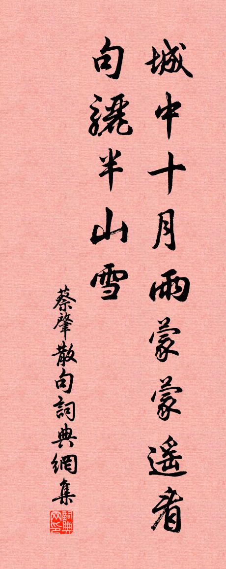 詩詞名句歷史字典書法欣賞書法字典國語詞典說文解字康熙字典古漢語字典標 題 作 者 詩 句 句作者:蔡肇 朝代:宋代句原文城中十月雨濛濛,遙看句驪半山雪。詩詞問答問:句的作者是誰?答:蔡肇問:句寫於哪個朝代?答:宋代蔡肇句書法欣賞句書法作品詩詞推薦言懷貽寓居曾幾〔宋代〕郊居麥風涼,佛屋梅雨潤。縈簾一炷香,隱几百念盡。時從黃卷語,坐看青燈燼。昏昏花亂眼,種種雪侵鬢。懷哉題湖山清隱真德秀〔宋代〕西湖南山和靖廬,西山東湖清隱居。皇天從來具老眼,勝地不肯棲凡夫。眼中西時風月景,胸次萬古皇王書。夫君即事陳造〔宋代〕泛蟻醪敷且命斟,中年節物自關心。風前千柳競春態,煙際一鳩啼晏陰。急景絕憐添鬢雪,芳辰猶阻盍朋簪。年時召伯停舟辟雨陳造〔宋代〕窗度荷芰風,舟艤鴛鴦浦。落帆憩篙師,辟此白淙雨。長征取愜快,留滯不雲苦。適喜縣麻勢,為盪鑠石暑。去年禮牧護和尚定身塔釋智遇〔宋代〕牧牧純來歲月多,至今殼漏未消磨。莫嫌截斷蘇溪水,尚有禪岩掛綠蘿。浣溪沙韓淲〔宋代〕霜後黃花尚自開。老年情緒為何哉。株株渾是手親栽。秋際有言揮玉塵,冬來無夢繞金釵。相思一夜發窗梅。點絳唇(復自和)向子諲〔宋代〕不掛一裘,世間萬事如風過。忘緣兀坐。皮袋非真我。隨色摩尼,朱碧如何和。還知麽。從來只個。千古撲不破。登薊丘樓送賈兵曹入都陳子昂〔唐代〕東山宿昔意,北征非我心。孤負平生願,感涕下沾襟。暮登薊樓上,永望燕山岑。遼海方漫漫,胡沙飛且深。峨眉頤軒詩六首黃庭堅〔宋代〕金石不隨波,松竹知歲寒。冥此芸芸境,回向自心觀。寓舍書懷陸游〔宋代〕借得茅齋近筰橋,羈懷病思兩無聊。春從豆蔻梢頭老,日向樗蒱齒上消。叢竹曉兼風力橫,高梧夜挾雨聲驕。書生送康洽入京進樂府歌李頎〔唐代〕識子十年何不遇,只愛歡游兩京路。朝吟左氏嬌女篇,夜誦相如美人賦。長安春物舊相宜,小苑蒲萄花滿枝。柳色贈鏡湖處士方乾二首曹松〔唐代〕包含教化剩搜羅,句出東甌奈峭何。世路不妨平處少,才人唯是屈聲多。雲來島上便幽石,月到湖心忌白波。後輩送韓太祝宋祁〔宋代〕雲陣星躔促傳車,長安初日望儲胥。金閨引籍中天闕,玉字藏家上帝書。祖道泛萍觴易釂,賦園飛雪席應虛。承明呈齡叟二首陳著〔宋代〕老師神用笑談中,不但能降大小空。自謂我心頑似鐵,也隨柳絮舞春風。王縣尉輓詞樓鑰〔宋代〕幹蠱恢才刃,誰能貨殖私。人皆競毫髮,我獨破藩籬。風雨空殘夢,池台愴昔時。板輿臨穴處,行道亦興悲。昌英知縣叔作歲坐上,賦瓶里梅花,時坐上九楊萬里〔宋代〕寒盡春生夜未央,酒狂狂似醒時狂。吾人何用餐煙火,揉碎梅花和蜜霜。田倉曹東亭夏夜飲得春字韓翃〔唐代〕薛公門下人,公子又相親。玉佩迎 * ,金壺醉老春。葛衣香有露,羅幕靜無塵。更羨風流外,文章是一秦。玉蝴蝶(叔高書來戒酒用韻)辛棄疾〔宋代〕貴賤偶然,渾似隨風簾幌,籬落飛花。空使兒曹,馬上羞面頻遮。向空江、誰捐玉珮,寄離恨、應折疏麻。暮雲多雜題陸游〔宋代〕山光染黛朝如濕,川氣熔銀暮不收。詩料滿前誰領略,時時來倚水邊樓。魚籃婦贊二首釋祖欽〔宋代〕行步輕盈,梳裝濟楚。示大慈悲,救眾生苦。智眼堪憐盡不明,只道籃中賣錦鱗。名句推薦痴兒不知父子禮,叫怒索飯啼門東。杜甫《百憂集行》 不知何日始工愁。記取那回花下一低頭。王國維《虞美人·弄梅騎竹嬉遊日》 不興其藝,不能樂學。戴聖《禮記·學記》 桃花塢裏桃花庵,桃花庵裏桃花仙。唐寅《桃花庵歌》 殘酒憶荊高,燕趙悲歌事未消。陳維崧《南鄉子·邢州道上作》 愁腸已斷無由醉,酒未到,先成淚。范仲淹《御街行·秋日懷舊》 莫道讒言如浪深,莫言遷客似沙沉。劉禹錫《浪淘沙九首》 別裁偽體親風雅,轉益多師是汝師。杜甫《戲為六絕句》 背若泰山,翼若垂天之雲。莊周《逍遙遊(節選)》 靈台無計逃神矢,風雨如磐暗故園。魯迅《自題小像》