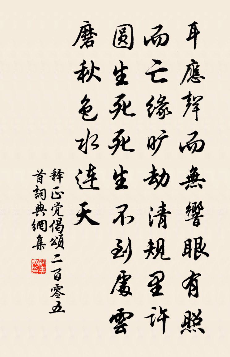 詩詞名句歷史字典書法欣賞書法字典國語詞典說文解字康熙字典古漢語字典標 題 作 者 詩 句 偈頌二百零五首作者:釋正覺 朝代:宋代偈頌二百零五首原文耳應聲而無響,眼有照而亡緣,曠劫清規里許圓。生死死生不到處,雲磨秋色水連天。詩詞問答問:偈頌二百零五首的作者是誰?答:釋正覺問:偈頌二百零五首寫於哪個朝代?答:宋代釋正覺偈頌二百零五首書法欣賞偈頌二百零五首書法作品詩詞推薦送俞尚寺丞知蘄春縣梅堯臣〔宋代〕應見言風物,於今有貢蛇。潛蹤遠蛙黽,飲露上蒹葭。清潔一如此,傷殘都莫涯。君惟修職業,男耒女繰車。鳳口寺釋紹嵩〔宋代〕古柏間松篁,山光接水光。園林春婉娩,雲水日相佯。苒苒花明岸,稍稍竹過牆。冥搜得詩窟,台館曉蒼蒼。宋璟徐鈞〔宋代〕一片剛方鐵石心,梅花冷淡獨知音。君王外貌雖加敬,賣直誰知內忌深。放吟釋文珦〔宋代〕心絕馳競如安流,身逃系屬同虛舟。無車每每跨黃犢,有暇時時盟白鷗。隨分嬉遊隨分樂,可曾計較可曾愁。老吟和人假山蘇軾〔宋代〕上黨攙天碧玉環,絕河千里抱商顏。試觀煙雨三峰外,都在靈仙一掌間。造物何如童子戲,寫真聊發使君閒。何當題詩紫極宮呂岩〔唐代〕宮門一閒入,臨水憑欄立。無人知我來,朱頂鶴聲急。浣溪沙黃庭堅〔宋代〕飛鵲台前暈翠蛾。千金新買帝青螺。最難如意為情多。幾處淚痕留醉袖,一春愁思近橫波。遠山低盡不成歌。齊安郡夫人金氏輓詞樓鑰〔宋代〕避地供湯餅,當筵接縞衣。倉皇奉神版,岩險遜征騑。遇事智尤敏,相夫家寖肥。考終無可憾,蝶夢繞芳菲。夜宴觀妓薛逢〔唐代〕燈火熒煌醉客豪,捲簾羅綺艷仙桃。纖腰怕束金蟬斷,鬢髮宜簪白燕高。愁傍翠蛾深八字,笑回丹臉利雙刀。無因論語絕句一百首張九成〔宋代〕只是人生少琢磨,厄於陳蔡尚弦歌。道之興廢皆由命,雖愬如公奈命何。離亭燕·一帶江山如畫張昪〔宋代〕一帶江山如畫。風物向秋瀟灑。水浸碧天何處斷,翠色冷光相射。蓼岸荻花中,隱映竹籬茅舍。天際客帆高掛。門立春謝司法有詩次韻方岳〔宋代〕草亭亦欲識詩葩,連夜開將雪樹花。清處盡強陶學士,不關羔酒與龍茶。村飲陸游〔宋代〕白稻登場喜食新,太倉月廩厭陳陳。叢祠懹肉有歸遺,官道橫眠多醉人。小市孤村真送老,浩歌起舞最關身。鹽醯柳枝詞十三首司馬光〔宋代〕宣陽門前三月初,家家楊柳綠藏鳥。歡似白花飄蕩去,忍能棄擲博山爐。沁園春 送楊伯可陸文圭〔元代〕雨足江皋,月滿中秋,使客將歸。看扁舟空載,貧無長物,破囊收貯,富有新詩。清白傳家,懷金不受,潔已從來移居偶成曾國藩〔清代〕前人栽藤後人看,我年乾藤未及半。前人種竹青成林,舞影窗月清我心。況有丁香海棠樹,堆砌牡丹亂無數。霜風朝中措侯置〔宋代〕風簾交翠篆香飄。卻暑卷輕綃。最好佳辰相近,壽觴對飲連宵。仙翁未老,雲中跨鳳,台上 * 。看取他年榮事,木蘭花慢姬翼〔元代〕笑平生幻惑,遇牢落,物華秋。對世路羊腸,人心*尾,剛變為柔。紛紜戰酣白蟻,向槐檀、影里覓封侯。一覺黃乞藥有感呈梅聖俞歐陽修〔宋代〕宣州紫沙合,圓若截郫筒。偶得今十載,走宦南北東。持之聖俞家,乞藥戒羸僮。聖俞見之喜,遽以手磨礱。謂此貴遊行韋應物〔唐代〕漢帝外家子,恩澤少封侯。垂楊拂白馬,曉日上青樓。上有顏如玉,高情世無儔。輕裾含碧煙,窈窕似雲浮。良時名句推薦日出東南隅,照我秦氏樓。佚名《陌上桑》 千層石樹遙行路,一帶山田放水聲。姚鼐《山行·布穀飛飛勸早耕》 千磨萬擊還堅勁,任爾東西南北風。鄭燮《竹石》 憶共人人睡魂蝶亂,夢鸞孤。趙長卿《更漏子·燭消紅》 山中一夜雨,樹杪百重泉。王維《送梓州李使君》 西北望鄉何處是,東南見月幾回圓。白居易《八月十五日夜湓亭望月》 揮手自茲去,蕭蕭班馬鳴。李白《送友人》 不知庭霰今朝落,疑是林花昨夜開。宋之問《苑中遇雪應制》 人生不相見,動如參與商。杜甫《贈衛八處士》 白日光天兮無不曜,江左 一隅獨未照。魏收《魏書·列傳·卷四十四》