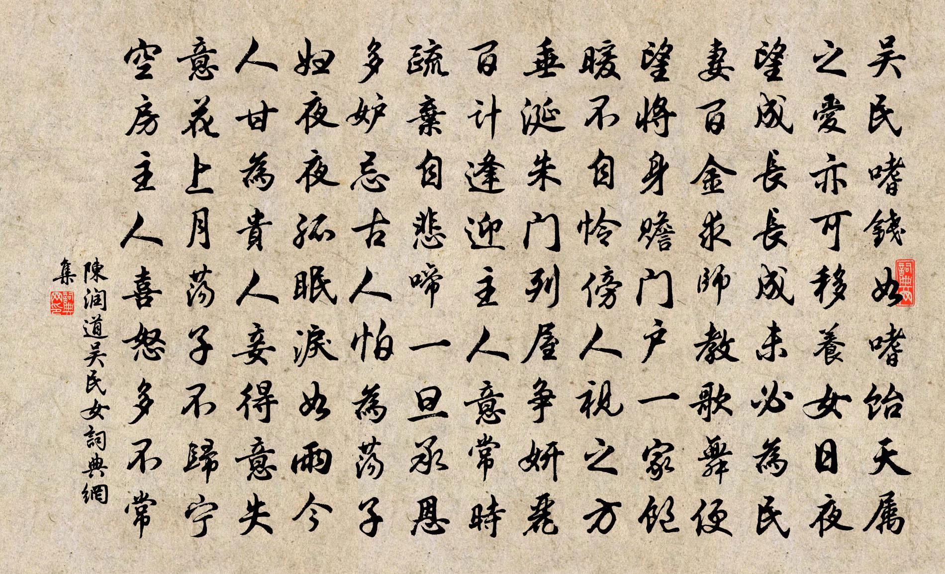 詩詞名句歷史字典書法欣賞書法字典國語詞典說文解字康熙字典古漢語字典標 題 作 者 詩 句 吳民女作者:陳潤道 朝代:宋代吳民女原文吳民嗜錢如嗜飴,天屬之愛亦可移。養女日夜望成長,長成未必為民妻。百金求師教歌舞,便望將身贍門戶。一家飽暖不自憐,傍人視之方垂涎。朱門列屋爭妍麗,百計逢迎主人意。常時疏棄自悲啼,一旦承恩多妒忌。古人怕為盪子婦,夜夜孤眠淚如雨。今人甘為貴人妾,得意失意花上月,盪子不歸寧空房。主人喜怒多不常。詩詞問答問:吳民女的作者是誰?答:陳潤道問:吳民女寫於哪個朝代?答:宋代陳潤道吳民女書法欣賞吳民女書法作品詩詞推薦答孟侍御早朝見寄姚合〔唐代〕河傾月向西,九陌鼓聲齊。塵靜霜華遠,煙生曙色低。禁門人已度,宮樹鳥猶棲。疏懶勞相問,登山有舊梯。白髮嘆盧綸〔唐代〕發白曉梳頭,女驚妻淚流。不知絲色後,堪得幾回秋。別雷國輔之皖山王安石〔宋代〕侍郎憂國最賢勞,太尉西州第一豪。家廟比來聞澤厚,公孫今果見才高。明時尚使龍蛇蟄,壯志空傳虎豹韜。莫厭木蘭花慢陳德武〔宋代〕值昇平海宇,又春色、與俱還。向楊柳樓台,海棠庭院,紅藥闌乾。可人好風良月,都收拾入錦囊間。心事已超塵滿庭芳(楚州上巳萬柳池應監丞領客)戴復古〔宋代〕三日春光,群賢勝踐,山陰何似山陽。鵝池墨妙,曲水記流觴。自許風流丘壑,何人共、擊楫長江。新亭上,山河韓尚書南澗公之從弟德文為東廣常平上幕丙寅曾豐〔宋代〕山鄉仍水國,玉露更金風。置印龜{左冉右龜}上,揚鞭馬首東。勤渠蓮幕客,款曲繡衣翁。言我坐詩累,至今依小雪前三日鍾冠之約余侍老人行山舟發後洪入洪咨夔〔宋代〕止水攪不動,好山邀輒來。松間寒月晚,似角兩翁催。句王隨〔宋代〕孤影漸高雲外月,寒聲特起竹間風。和危府教劉過〔宋代〕天上群仙台望居,芹宮未是辱泥途。莫邪變化須臾事,一點一熔金在爐。蝶戀花·九日和吳見山韻吳文英〔宋代〕明月枝頭香滿路。幾日西風,落盡花如雨。倒照秦眉天鏡古。秋明白鷺雙飛處。 自摘霜蔥宜薦俎。可惜重陽,不採桑子黃庭堅〔宋代〕櫻桃著子如紅豆,不管春歸。聞道開時。蜂惹香須蝶惹衣。樓檯燈火明珠翠,酒戀歌迷。醉玉東西。少個人人暖被生查子(和夏中玉)辛棄疾〔宋代〕一天霜月明,幾處砧聲起。客夢已難成,秋色無邊際。旦夕是重陽,菊有黃花蕊。只怕又登高,未飲心先醉。宿孤館賈島〔唐代〕落日投村戍,愁生為客途。寒山晴後綠,秋月夜來孤。橘樹千株在,漁家一半無。自知風水靜,舟系岸邊蘆。渭河道中 其二王冕〔元代〕披霧青天近,梳頭白髮明。山河千古恨,風雨五更情。塞北浮雲慘,關中王氣清。草廬諸葛在,未得話平生。龍尾洪咨夔〔宋代〕淺磧苕花紫,平畦芋梗紅。暝收漁筏雨,涼入酒帘風。客路三年夢,官身兩鬢蓬。誰知龍尾道,卻在鹿頭東。感懷追和柳子厚郊居歲暮韻晁補之〔宋代〕殘暑夜如炊,曉風 * 索。開門望林木,引蔓修籬落。所欣塵累遠,不恨生涯薄。心事少乾雲,白頭成憶昨。最明寺殿悟道後贈之助道頌五首釋普寧〔宋代〕二十一年曾苦辛,尋經討論枉精神。驚然摸著娘生鼻,翻笑胡僧弄吻唇。贈王漁山釋行海〔宋代〕冷觀天地只浮漚,勝水名山遍去游。書劍傳家拋弟侄,漁樵作隊賤公侯。臥聽瀑布分僧榻,醉插梅花上酒樓。篋里淨居勸農三首陳造〔宋代〕簿書堆里得抽身,梅柳風前觸眼新。報答好春還著語,今朝猶喜是閒人。故宮使待制侍郎陳公輓詞二首韓元吉〔宋代〕政譽京江口,威名峴首山。折衝章貢外,制勝漢淮間。零落金閨彥,淒涼玉筍班。文章與功業,未老竟長閒。名句推薦城上日出群烏飛,鴉鴉爭赴朝陽枝。柳宗元《跂烏詞》 宴爾新婚,以我御窮。佚名《谷風》 何人解賞西湖好,佳景無時。歐陽修《採桑子·何人解賞西湖好》 穠艷一枝細看取,芳心千重似束。蘇軾《賀新郎·夏景》 庸愚足以覆事;精明亦足以覆事。王永彬《圍爐夜話·第五九則》 寄言儔侶,莫負廣寒沈醉。文徵明《念奴嬌·中秋對月》 君埋泉下泥銷骨,我寄人間雪滿頭。白居易《夢微之》 枯楊枯楊爾生稊,我獨七十而孤棲。李白《雉朝飛》 無事如有事時堤防,可以弭意外之變;有事如無事時鎮定,可以銷局中之危。陳繼儒《小窗幽記·集峭篇》 不寶金玉,而忠信以為寶戴聖《禮記·儒行》
