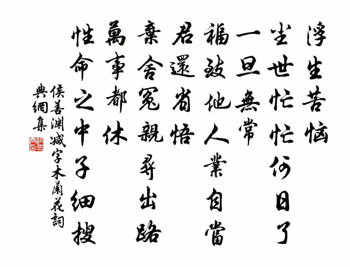 詩詞名句歷史字典書法欣賞書法字典國語詞典說文解字康熙字典古漢語字典標 題 作 者 詩 句 減字木蘭花作者:侯善淵 朝代:元代減字木蘭花原文浮生苦惱。塵世忙忙何日了。一旦無常。福致他人業自當。君還省悟。棄捨冤親尋出路。萬事都休。性命之中子細搜。詩詞問答問:減字木蘭花的作者是誰?答:侯善淵問:減字木蘭花寫於哪個朝代?答:元代問:減字木蘭花是什麼體裁?答:詞侯善淵減字木蘭花書法欣賞減字木蘭花書法作品詩詞推薦戴迪功輓詞樓鑰〔宋代〕好學數仍奇,躬行家遂肥。時將詩自樂,晚悟世俱非。教子惟黃卷,高門看綠衣。阿連悲未泯,無淚為君揮。詩似來石門風少野陳著〔宋代〕出林危世是亨途,道眼相逢菜味腴。愈契大顛非為佛,坡知老印本來儒。攜晴雪瀑藤花路,話舊青鐙柏子廬。萬事搗練子譚處端〔元代〕聽分剖,這風哥。尋常只恁*哩*。*哩*,哩**。些兒話,不須多。交賢會得笑呵呵。*哩*,哩**。落莫張耒〔宋代〕歲晚苦落莫,獨游情易傷。晴溪沙漾碧,秋徑葉鋪黃。幽菊開經雨,疏槐老奈霜。閉門無俗客,攄散有林塘。明發五峰寺初入筠州界高岡鋪楊萬里〔宋代〕歸時路何近,去時路何遠。山路無短長,人心有往返。每因赴官期,一出謁鄉縣。若非人事牽,無柰老身嬾。初心梅花七律張道洽〔宋代〕越疎越澹越幽奇,最是精神與月宜。殘雪軒窗看到曉,冷煙籬落立移時。寄將不驛傳千里,折得寒檐第幾枝。只為木蘭花慢 清明上已同日,亦吾生少遇姚燧〔元代〕暢光風裊裊,轉幽蕙,泛崇蘭。最上已清明,相期一日,百歲逢難。鞦韆自兒女事,快鄰翁、覆手羽觴乾。莫道韶再用喜雨韻三首吳潛〔宋代〕雨腳如奔冒遠岑,須臾六合變層陰。坐回物物昭蘇意,想見村村喜笑音。翁詫稻粱營米棧,婦忠裘褐拂衣砧。定知送葛居士住棲碧庵林景熙〔宋代〕越山巉巉越台孤,井以雙鯉曾走吳。滿坡叢竹遺舊箭,回首霸業空煙蕪。詩人訪古凌絕壁,危棲竟欲老深碧。聲搖偈傾一百六十九首釋智朋〔宋代〕夜半明星,打失眼睛。胡人多詐,未可全憑。遭他冤害,始報不平。憂居文同〔宋代〕憂居向山林,蟲鳥日為伍。形骸乍摧剝,骨肉慣辛苦。蔬盤羞客至,病榻厭人語。地僻誰往還,閒門閉深雨。游慧力寺康與之〔宋代〕天涯芳劃盡綠,路旁柳絮爭飛。啼鳥一聲春晚,落花滿地人歸。宮夏佚名〔宋代〕午漏遲遲漏玉壺,清陰冪冪布庭除。直將底事銷長日,大學中庸兩卷書。挽都大王郎中二首徐元傑〔宋代〕魁望西來職秘丘,年家托好敘綢繆。身為僚友兩三月,公肅皇華百八州。列緯載班清劇耀,高風遽耀,高風遽勇急生查子·輕勻兩臉花晏幾道〔宋代〕輕勻兩臉花,淡掃雙眉柳。會寫錦箋時,學弄朱弦後。今春玉釧寬,昨夜羅被皺。無計奈情何,且醉金杯酒。立春日邂逅周文顯於子暢兄許飲酒論文歡有餘趙蕃〔宋代〕文字追秦漢,簞瓢保賤貧。延英空側席,下里老斯人。傾蓋寧嗟晚,推門莫厭頻。罷談芻狗用,且看土牛春。朝邑蔡主簿期不會二首儲光羲〔唐代〕下位日趨走,久之賓會疏。空遲偶詞賦,所愧比園廬。朝念池上酌,暮逢林下書。方將固封守,暫欲混畋漁。衰柳送李秘校赴太平法掾宋庠〔宋代〕沈臂驚秋肉減分,曉波衰柳對離群。臣飢枉索中都米,卿事猶參下國軍。三襲賦台拋苑雪,一塵鄉樹辨江雲。坐曹木蘭花慢李商英〔宋代〕喜瓊筵乍啟,似王母、宴瑤池。正珠履駢肩,群仙間坐,冰玉交輝。新詞更兼舊曲,聽歌聲、宛轉繞屏幃。一縷龍景陽台懷古徐鉉〔唐代〕後主亡家不悔,江南異工長春。今日景陽台上,閒人何用傷神。名句推薦門外垂楊岸側,畫橋誰系蘭舟。万俟詠《木蘭花慢·恨鶯花漸老》 春眠不覺曉,處處聞啼鳥。孟浩然《春曉》 公乎躍馬揚玉鞭,滅沒高蹄日千里。溫庭筠《拂舞詞 / 公無渡河》 北風利如劍,布絮不蔽身。白居易《村居苦寒》 羈旅長堪醉,相留畏曉鍾。戴叔倫《客夜與故人偶集 / 江鄉故人偶集客舍》 入則無法家拂士,出則無敵國外患者,國恆亡。孟子及其弟子《生於憂患,死於安樂》 白日依山盡,黃河入海流。王之渙《登鸛雀樓》 未覺池塘春草夢,階前梧葉已秋聲。朱熹《偶成》 西湖春色歸,春水綠於染歐陽修《春日西湖寄謝法曹歌》 青山如黛遠村東,嫩綠長溪柳絮風。高珩《春日雜詠》