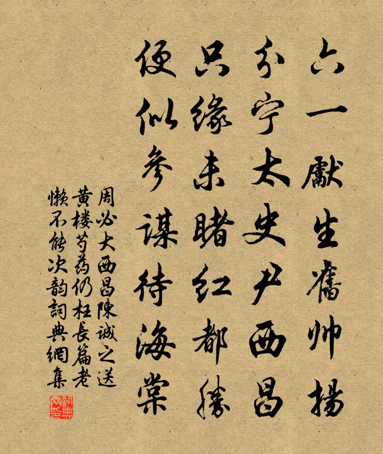 詩詞名句歷史字典書法欣賞書法字典國語詞典說文解字康熙字典古漢語字典標 題 作 者 詩 句 西昌陳誠之送黃樓芍藥仍枉長篇老懶不能次韻作者:周必大 朝代:宋代原文六一先生舊帥揚,分寧太史尹西昌。只緣未睹紅都勝,便似參謀待海棠。詩詞問答問:《西昌陳誠之送黃樓芍藥仍枉長篇老懶不能次韻》的作者是誰?答:周必大問:該詩寫於哪個朝代?答:宋代書法欣賞西昌陳誠之送黃樓芍藥仍枉長篇老懶不能次韻書法作品詩文賞析【原題】:西昌陳誠之送黃樓芍藥仍枉長篇老懶不能次韻戲答二絕句連歲許紅都未至末章及之詩詞推薦歸來王冕〔元代〕湖海飄零久,歸來依舊貧。顧無青眼友,喜有白頭親。籬菊留余色,庭梅奏早春。溪翁密相訪,杯酒接殷勤。送劉士彥赴福建轉運判官黃庭堅〔宋代〕秋葉雨墮來,冥鴻天資高。車馬氣成霧,九衢行滔滔。中有寂寞人,靈府扃鎖牢。西風持漢節,騎從嚴弓刀。惟閩恣逍遙王哲〔元代〕擺脫濁醪,憑傳清水。這滋味、香甜真美。過得重樓,全無滓穢。五門開、澆淋就中忒銳。七寶滋榮,三田溉濟。雨釋智圓〔宋代〕潤物有深功,霏霏下半空。寒聲清入竹,斜勢急因風。苔片添秋碧,花枝損晚紅。山人獨欹枕,靜聽草堂中。贈友人罷舉赴辟命杜荀鶴〔唐代〕連天一水浸吳東,十幅帆飛二月風。好景采拋詩句里,別愁驅入酒杯中。漁依岸柳眠圓影,鳥傍岩花戲暖紅。不是華之高壽魯齋先生七十金履祥〔宋代〕金華之高,其色蒼蒼。維華降神,生何及王。醉太平·譏貪小利者佚名〔元代〕奪泥燕口,削鐵針頭,刮金佛面細搜求,無中覓有。鵪鶉嗉里尋豌豆,鷺鷥腿上劈精肉。蚊子腹內刳脂油,虧老先御筆賜字詩蔡襄〔宋代〕皇華使者臨清晨,手開寶軸香煤新。沿名與字發深旨,宸毫灑落奎鉤文。精神高遠照日月,勢力雄健生風雲。混然餘杭道中曉行連文鳳〔宋代〕曉霧溟濛未見天,山光水影白相連。餘杭不似西川路,六月中旬叫杜鵑。山居詩釋延壽〔宋代〕萬般惟道最堪依,一瞬榮枯恨古悲。強笑低顏何忽忽,忘機絕慮自怡怡。潛龍終要投深浦,巢鳥應須占健枝。名利陌上釋行海〔宋代〕別人楊柳別人花,自對春風感物華。陌上最憐芳草色,王孫多是不還家。南鄉子·溫養象周天蕭廷之〔宋代〕溫養象周天。須要微微火力全。愛護嬰兒惟藉母,三年。運用抽添象缺圓。牛斗會河邊。拾取玄珠種玉田。定意如端午貼子詞皇太后閣六首周麟之〔宋代〕方開八袠慶修齡,又捧榴杯拜紫庭。一歲一添長命縷,擬將萬縷獻茲亭。遇道者張蠙〔唐代〕數裏白雲里,身輕無履蹤。故尋多不見,偶到即相逢。古井生雲水,高壇出異松。聊看杏花酌,便似換顏容。梅花喜神譜爛熳二十八枝宋伯仁〔宋代〕新綠小池沼,田田浮翠錢。雨中珠萬顆,巧婦其能穿。和林尚善讀子云傳夢得詩韻李洪〔宋代〕尚白寧堪眾楚咻,井湄瓶碎愈增愁。後人歸罪美新作,莫污蕭郎文選樓。述志詩 其二嵇康〔兩漢〕斥鷃擅蒿林。仰笑神鳳飛。坎井蝤蛙宅。神龜安所歸。恨自用身拙。任意多永思。遠實與世殊。義譽非所希。往事水口行舟朱熹〔宋代〕昨夜扁舟雨一蓑,滿江風浪夜如何? 今朝試卷孤蓬看?依舊青山綠水多。 送鄭無忌南歸蘇頌〔宋代〕我家本南閩,處世若羈寓。侍親從宦遊,東西遷者屢。因循歷年載,未識南中路。間歲至都城,始與里儒遇。嘗聞病起游近村陸游〔宋代〕老人摧頹絕造請,門設常關草生徑。一年三百六十日,三百五十九日病。一日不病出忘歸,繞村處處扣柴扉。水東名句推薦邯鄲驛里逢冬至,抱膝燈前影伴身。白居易《邯鄲冬至夜思家》 止謗莫如修身徐幹《中論·上卷·虛道》 乍見翻疑夢,相悲各問年。司空曙《雲陽館與韓紳宿別》 時來風送滕王閣,運去雷轟薦福碑。佚名《增廣賢文·上集》 田家占氣候,共說此年豐。孟浩然《田家元日》 喜看稻菽千重浪,遍地英雄下夕煙。 * 《七律·到韶山》 徒把金戈挽落暉,南冠無奈北風吹。虞集《挽文丞相》 大樹底下好遮陰張南莊《何典·第十回》 是他春帶愁來,春歸何處。辛棄疾《祝英台近·晚春》 鬢絲日日添白頭,榴錦年年照眼明;殷堯藩《端午日》