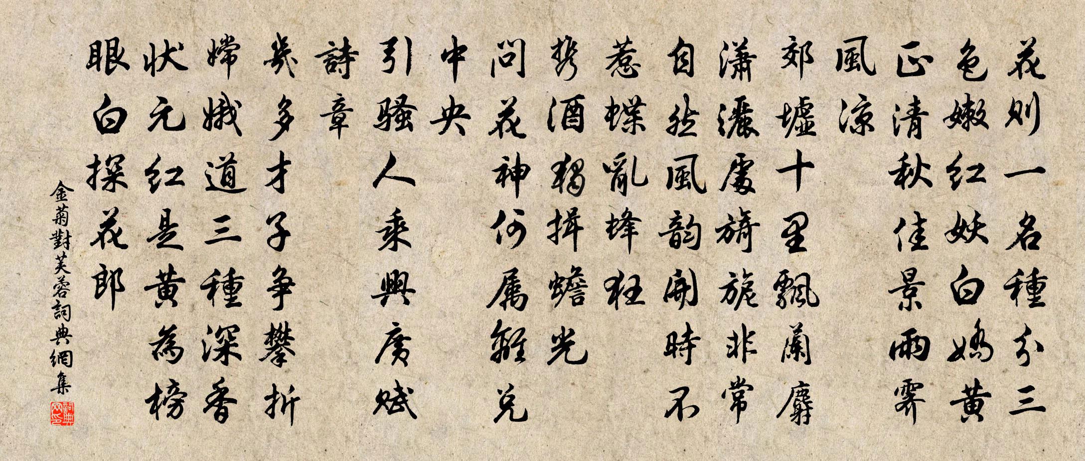 花則一名,種分三色,嫩紅妖白嬌黃。正清秋佳景,雨霽風涼。