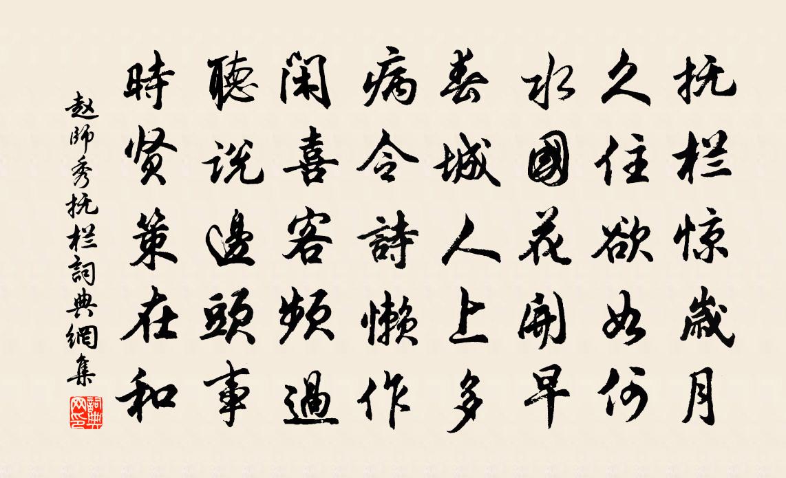 詩詞名句歷史字典書法欣賞書法字典國語詞典說文解字康熙字典古漢語字典標 題 作 者 詩 句 撫欄作者:趙師秀 朝代:宋代撫欄原文撫欄驚歲月,久住欲如何。水國花開早,春城人上多。病令詩懶作,閒喜客頻過。聽說邊頭事,時賢策在和。詩詞問答問:撫欄的作者是誰?答:趙師秀問:撫欄寫於哪個朝代?答:宋代趙師秀撫欄書法欣賞撫欄書法作品詩詞推薦減字木蘭花王觀〔宋代〕角聲三品。銀漏更殘將欲盡。盞盞華筵。玉粒瓊甌散又圓。知君洪量。不用推辭須一上。滿勸殷勤。祝壽如同福祿晨起陸游〔宋代〕晨起梳頭雪滿膺,可憐衰與病相乘。浮名何足欺橫目,真樂聊須付曲肱。仕有俸錢渠亦好,退無耕壟我何憑?具牛姚起居赴兩浙轉運楊億〔宋代〕吳會商功利,蓬邱輟史臣。同僚供祖帳,屬郡望行塵。富國催流馬,編年廢獲麟。橐鞬二千石,襦袴幾州人。名姓贈顓頊山人劉滄〔唐代〕浩氣含真玉片輝,著書精義入玄微。洛陽紫陌幾曾醉,少室白雲時一歸。松雪月高唯鶴宿,煙嵐秋霽到人稀。知君挽高兵部陳宓〔宋代〕蚤得師儒賞識深,明時碩輔盡知音。惠周南海交麾節,疏上中台襆被扆。七帙正宜游桂圃,五言何遽些梅林。鄰鄉厄台寺三首張耒〔宋代〕世味嗟予淡莫加,更將詩句寄煙霞。自憐落筆無好字,不及揚州王謝家。寶華岩趙善嗑〔宋代〕寶色晴光合,浮嵐薄翠微。天開今覺路,洞鎖古神扉。淡拂山僧帽,閒隨野客衣。日斜涼吹起,林壑更依依。同樂天送河南馮尹學士劉禹錫〔唐代〕可憐五馬風流地,暫輟金貂侍從才。閣上掩書劉向去,門前修刺孔融來。崤陵路靜寒無雨,洛水橋長晝起雷。共羨詠雲董思恭〔唐代〕帝鄉白雲起,飛蓋上天衢。帶月綺羅映,從風枝葉敷。參差過層閣,倏忽下蒼梧。因風望既遠,安得久踟躕。壽蹇從叔制乾陽枋〔宋代〕黃鐘大呂播年華,簪盍城南捧九霞。共說賢寮心似鏡,何妨幕府事如麻。紛紛吏坌空迷目,蹇蹇王臣豈計家。共約宿贊公房(京中大雲寺主謫此安置)杜甫〔唐代〕杖錫何來此,秋風已颯然。雨荒深院菊,霜倒半池蓮。放逐寧違性,虛空不離禪。相逢成夜宿,隴月向人圓。隱圃蔣堂〔宋代〕雅得菟裘地,清宜隱者心。綠葵才有甲,青桂漸成陰。獨曳山屐往,無勞車駕尋。湛然常寂處,水月一庵深。題靈岩寺孔舜思〔宋代〕忽從平地出塵籠,親到諸天釋梵宮。卻悟冗宮長役物,爭如大士日談空。山橫青壁千層合,泉迸丹崖一線通。幽鳥瓜洲謝李德載寄蜂兒木瓜筆張耒〔宋代〕瓜洲蕭索秋江渚,西風江岸殘紅舞。津亭永夜守青燈,客睡朦朧聽江雨。青罇曉酌遣懷抱,但恨鬱郁將誰語。敲門送陳眾仲之官翰林應奉錢惟善〔元代〕畫鷁齊飛發棹謳,泛江幾日過揚州。曉雲最白梅花驛,春雨初香杜若洲。一代文章關氣運,十年館閣擅風流。綠波送談執權張南顯歸廣州白玉蟾〔宋代〕七月送我東南道,八月送我西南道。西南江沙黃茫茫,東南海水白浩浩。海水飛作潮頭來,潮頭卷取潮舌回。江沙念奴嬌(落梅)趙長卿〔宋代〕玉龍聲杳,正瑤台曲舞,香山初徹。褪粉掐酥千萬顆,滿地平鋪銀雪。草褥香茵,苔錢買住,留待黃昏月。有人妝加祿道中孔武仲〔宋代〕僕夫疲躓復小休,晴雲澹澹更悠悠。村陂無人鳥聲樂,澗草不動春風柔。長道此去星斗近,後期南來桑枯稠。懷哉郁山主贊釋智遇〔宋代〕略彴蹈翻天地黑,盲驢惡拗弄蹄行。從芘汪以茶川上,溪水自涵山影清。連夕熟睡戲書陸游〔宋代〕投幘塵機息,捐書困味長。早眠猶有日,晚起已無霜。蝶入三更枕,龜榰八尺床。昏昏君莫笑,差勝醉為鄉。名句推薦悲歡離合總無情。一任階前、點滴到天明。蔣捷《虞美人·聽雨》 君子敵小人,亦小人也。小人友君子,亦君子也。來俊臣《羅織經·制敵卷第五》 願得此身長報國,何鬚生入玉門關。戴叔倫《塞上曲二首·其二》 青山依舊在,幾度夕陽紅。楊慎《臨江仙·滾滾長江東逝水》 不覺新涼似水,相思兩鬢如霜。劉辰翁《西江月·新秋寫興》 那堪疏雨滴黃昏。更特地、憶王孫。歐陽修《少年游·欄乾十二獨憑春》 重足而立,側目而視。司馬遷《史記·汲鄭列傳》 北風其涼,雨雪其雱。佚名《北風》 北風捲地白草折,胡天八月即飛雪。岑參《白雪歌送武判官歸京》 酒是燒身硝焰,色為割肉鋼刀馮夢龍《警世通言·卷十一》