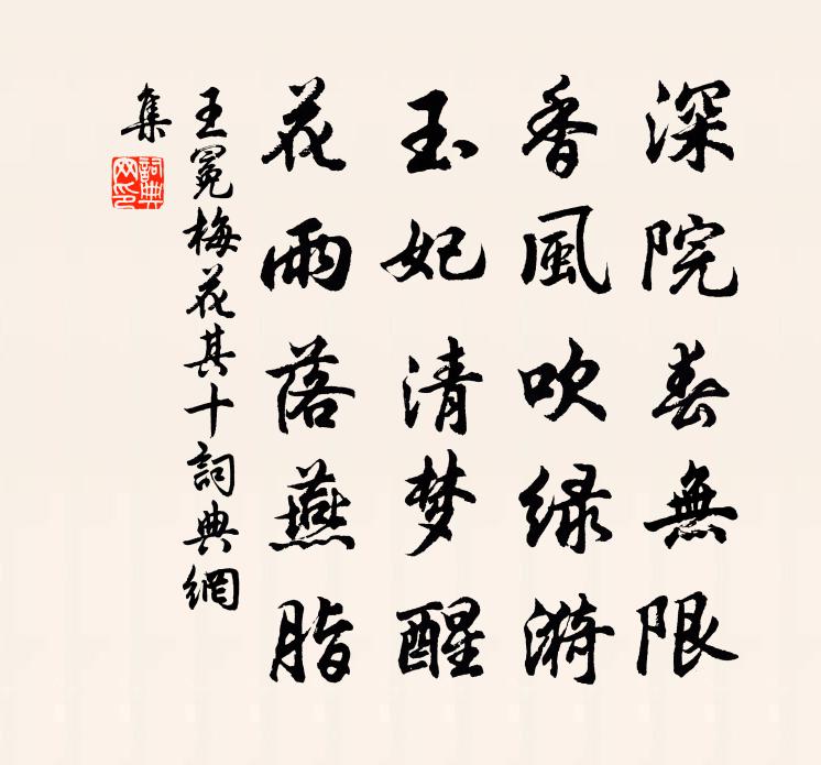 詩詞名句歷史字典書法欣賞書法字典國語詞典說文解字康熙字典古漢語字典標 題 作 者 詩 句 梅花 其十作者:王冕 朝代:元代梅花 其十原文深院春無限,香風吹綠漪。玉妃清夢醒,花雨落燕脂。詩詞問答問:梅花 其十的作者是誰?答:王冕問:梅花 其十寫於哪個朝代?答:元代問:梅花 其十是什麼體裁?答:五絕問:王冕的名句有哪些?答:王冕名句大全王冕梅花 其十書法欣賞梅花 其十書法作品詩詞推薦【南呂】一枝花_詠惜花春起佚名〔元代〕詠惜花春起早花間杜宇啼,柳外黃鶯囀。銀河青耿耿,玉露滴涓涓。潛入花園,露濕殘妝面,風吹雲髻偏。畫閣內侍伯兄宿履庵即事呈本老王柏〔宋代〕朔風蕭騷霜正濃,追隨雁影來城東。樓閣寶門八字啟,一超逕入青蓮宮。老師槌拂活潑潑,臨機一喝開盲聾。舌根奉安神考御容入景靈宮小臣獲睹有感二首張耒〔宋代〕靈風依傘繡輿深,仗外猶疑警蹕音。不似尋常游幸日,樓前鼓吹卻沾襟。晚渡揚子江卻寄江南親故權德輿〔唐代〕返照滿寒流,輕舟任搖漾。支頤見千里,煙景非一狀。遠岫有無中,片帆風水上。天清去鳥滅,浦迥寒沙漲。樹晚呂公像張元乾〔宋代〕巾裹唐裝本布衣,平生唯識一鍾離。此中養得嬰兒就,世上行屍有許悲。次韻林太淵二首劉克莊〔宋代〕時賢多以刻為明,撫字催科鮮並行。聞舊吏民皆向化,喜新令尹不求贏。察簾外事非中道,立路傍碑亦近名。莫比失調名佚名〔宋代〕金吾不禁元宵,漏聲更莫催曉。蓑衣步薛嵎〔宋代〕水浸石根冷,風吹藤葉飛。菰蒲秋影里,長趁釣船歸。繫舟陸游〔宋代〕地曠月明鋪素練,霜寒河淺拂輕綃。手扶萬里天壇杖,夜過前村禹會橋。春朝早起范成大〔宋代〕莫笑眠常早,還憐起不遲。穠香溫夜氣,小雨濕春姿。瘦比中年甚,寒惟病骨知。羨渠兒女健,繞屋探南枝。題劉宗周黃道周集乾隆〔清代〕搜羅四庫事磨研,去取其間公道傳。人各抒忠斯可錄,言雖觸諱忍從捐。寧同仲達吠堯日,不愧觀文報宋年。平日次韻答史太博李覯〔宋代〕驛使將詩訪遠山,發函寧暇正衣冠。秦城未割難論價,燕谷才吹已不寒。佔畢有心忘老至,惰農無罰賀恩寬。一枝和梁簽判潁州西湖十三題去思堂蘇頌〔宋代〕丞相臨人以惠和,三年鄉校起弦歌。至今旌旆曾游處,猶道當時樂事多。次林子長教授韻陳造〔宋代〕伯主或能尊九九,餓錄恐復辦多多。盤姍勃窣不快意,鉛刀一割君謂何。新除水曹郎,答白舍人見賀張籍〔唐代〕年過五十到南宮,章句無名荷至公。黃紙開呈相府後,朱衣引入謝班中。諸曹縱許為仙侶,群吏多嫌是老翁。最幸孝宗明堂前朝獻景靈宮八首真宗〔宋代〕象德之成,有奕有舞。一馳一張,進旅退旅。嚖以管簫,和以鏞鼓。神其樂康,永錫多祜。臨江仙黃人傑〔宋代〕六月炎官收火傘,南薰盡洗煩蒸。十三蓂莢又爭青。問知陳仲舉,元是此時生。別駕功成清暇日,題輿尚帶屏星。幽圃釋文兆〔宋代〕遠與村橋接,深春積雨時。蘭芳人未采,花發蝶先知。草密封間徑,林疏露短籬。別來鋤久廢,身老恨歸遲。九月十日南出見梅范成大〔宋代〕五斗留連首屢回,來尋南澗濯塵埃。春風直恐淵明去,借與橫斜對菊開。白蓮林泳〔宋代〕泰華仙根不染塵,一枝冷淡種尤真。欲緣夢斷承妃步,色相空來坐佛身。淨比禪心月上女,妝羞麗質水邊人。紵袍名句推薦易挑錦婦機中字。難得玉人心下事。劉克莊《玉樓春·戲林推》 三春白雪歸青冢,萬里黃河繞黑山。柳中庸《征人怨 / 征怨》 他人有心,予忖度之。佚名《巧言》 雁過孤峰曉,猿啼一樹霜。賈島《送天台僧》 君子貴其身而後能及人,是以有禮。左丘明《左傳·昭公·昭公二十五年》 楊柳青青著地垂,楊花漫漫攪天飛。佚名《送別詩》 山高月小,水落石出。蘇軾《後赤壁賦》 睢睢而盱盱,而誰與居?大白若辱,盛德若不足。列子及其弟子《列子·黃帝》 秋風夜渡河,吹卻雁門桑。王昌齡《塞下曲·秋風夜渡河》 一尺深紅勝麴塵,天生舊物不如新。溫庭筠《南歌子詞二首 / 新添聲楊柳枝詞》