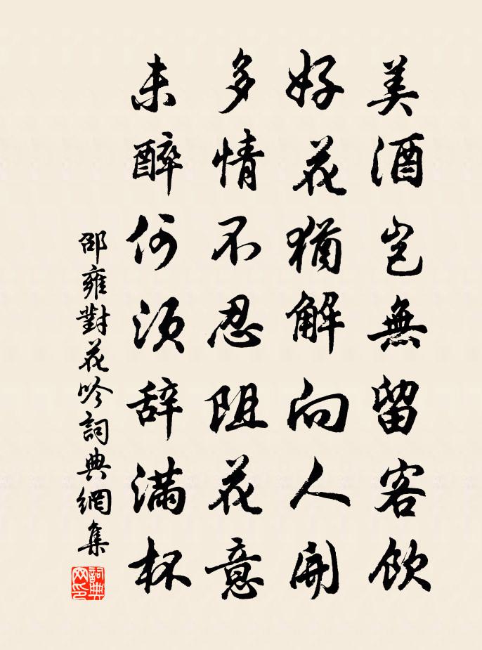 詩詞名句歷史字典書法欣賞書法字典國語詞典說文解字康熙字典古漢語字典標 題 作 者 詩 句 對花吟作者:邵雍 朝代:宋代對花吟原文美酒豈無留客飲,好花猶解向人開。多情不忍阻花意,未醉何須辭滿杯。詩詞問答問:對花吟的作者是誰?答:邵雍問:對花吟寫於哪個朝代?答:宋代邵雍對花吟書法欣賞對花吟書法作品詩詞推薦陳正仲提刑制勘甫畢首過小樓既出新詩仍惠手周必大〔宋代〕才將疑獄決春秋,便顧居鄉馬少游。犯斗海槎光斗野,應星漢節照星樓。法書飛動鸞窺沼,韻語清高鶴唳洲。田父村居初夏陸游〔宋代〕北陌東阡節物新,往來饋餉走比鄰。出籠鵝白輕紅掌,藉藻魚鮮淡墨鱗。笑語相聞豐歲樂,耕桑自足古風淳。頹然五月五日領客泛舟吳芾〔宋代〕要同佳客濯清泉,卻下危樓上畫船。拭目已看雲際月,洗心還愛水中天。更無暑氣侵尊俎,但有薰風入管弦。我欲答余司理陳造〔宋代〕緬懷海縣游,不作千山隔。雖償還俗債。茲復望霓厄。孰知赫曦中,欻有油雲升。六幕一汛掃,病骨如濯清。西山次韻韓毅伯謝人惠茶王炎〔宋代〕一線金沙泉脈來,官焙初香春未雷。雲龍小餅到天上,露芽濯濯千岩隈。縑緗空滿石渠閣,鴻漸經成方有托。喚作雜體詩 鮑參軍昭戎行江淹〔南北朝〕豪士枉尺璧。宵人重恩光。狥義非為利。執羈輕去鄉。孟冬郊祀月。殺氣起嚴霜。戎馬粟不暖。軍士冰為漿。晨上春日途中五首項安世〔宋代〕湖海今年最倦遊,春來新上浙西舟。天寒歲暮錢清路,又踏嚴州向婺州。後感興二首敖陶孫〔宋代〕皇天分四時,氣節幾錯遌。俗兒一驚呼,認者淚橫落。悠悠羲皇前,日月何磊犖。不世更凌歷,地上光景薄。十年將至臨安途中偶成呈表叔陳給事去非張嵲〔宋代〕末契托外親,夙昔承顧盼。鄧鄙聽論詩,房陵共遭亂。蒼黃南山路,大雪將沒骭。事定訪田家,山花已如霰。燃薪郊廟歌辭。五郊樂章。舒和佚名〔唐代〕執籥持羽初終曲,朱乾玉鏚始分行。七德九功鹹已暢,明靈降福具穰穰。與於中丞劉商〔唐代〕萬頃荒林不敢看,買山容足擬求安。田園失計全蕪沒,何處春風種蕙蘭。賜知貢舉晁迥宋真宗〔宋代〕禮闈選士古稱難,都為陞沉咫尺間。較藝清時公道在,掄材應得惠人寰。鵲踏枝馮延巳〔唐代〕蕭索清秋珠淚墜,枕簟微涼,展轉渾無寐。殘酒欲醒中夜起,月明如練天如水。階下寒聲啼絡緯,庭樹金風,悄悄次韻李智淵暮行湖上郭印〔宋代〕晚涼曳杖尋幽絕,怪樹相逢如磬折。縈紆小徑渾路迷,突兀高亭補林闕。襲人暗遞竹間風,延客長明波底月。游魚宣甫隨行有端石茶匣甚佳道中為僕夫所損某見蘇頌〔宋代〕鐫礱圭角制尤精,豈為微瑕用便輕。且賞岩珍終耿介,休思人事有虧成。王九山輓詩薛嵎〔宋代〕俗論鄙迂儒,公胡獨受欺。焦桐方入調,夜鵲忽驚枝。心事將誰計,身名負已知。九原如可作,白首誓為期。初秋夜坐趙雍〔元代〕月明如水侵衣濕,台榭沉沉秋夜長。坐久高僧禪語罷,淡然相對玉簪香。寓嘆陸游〔宋代〕荷戈常記壯遊時,齒豁頭童不自知。已分功名非力致,更悲文字與年衰。端居漸覺從人嬾,熟睡偏於聽雨宜。自斷憶王孫 詠柳善住〔元代〕一株閒伴霜陵橋。斜倚東風學舞腰。遊子尋春駿馬驕。欲魂銷。和雨挽戴丞劉克莊〔宋代〕戴氏多人物,君尤月旦推。能傳後倉禮,亦擅叔倫詩。故里懸車蚤,名場解褐遲。它年端有恨,椿桂不同時。名句推薦明年此會知誰健?醉把茱萸仔細看。杜甫《九日藍田崔氏莊》 青女素娥俱耐冷,月中霜里斗嬋娟。李商隱《霜月》 盡教春思亂如雲,莫管世情輕似絮晏幾道《玉樓春·雕鞍好為鶯花住》 花門樓前見秋草,豈能貧賤相看老。岑參《涼州館中與諸判官夜集》 雖有高世之名,無咫尺之功者不賞。劉向《戰國策·秦五·四國為一將以攻秦》 湖上春來似畫圖,亂峰圍繞水平鋪。白居易《春題湖上》 居高位者易驕,處佚樂者易侈。張廷玉《明史·列傳·卷二十四》 竹徑通幽處,禪房花木深。常建《題破山寺後禪院》 江碧鳥逾白,山青花欲燃。杜甫《絕句二首》 玉人初上木蘭時。懶妝斜立澹春姿。吳文英《浣溪沙·題李中齋舟中梅屏》