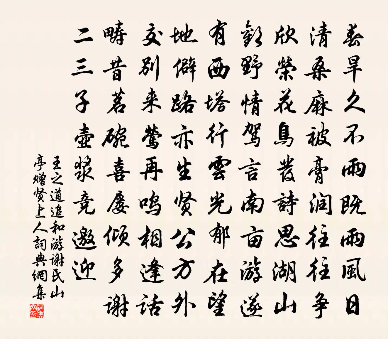 詩詞名句歷史字典書法欣賞書法字典國語詞典說文解字康熙字典古漢語字典標 題 作 者 詩 句 追和游謝氏山亭贈賢上人作者:王之道 朝代:宋代追和游謝氏山亭贈賢上人原文春旱久不雨,既雨風日清。桑麻被膏潤,往往爭欣榮。花鳥發詩思,湖山歡野情。駕言南畝游,遂有西塔行。雲光郁在望,地僻路亦生。賢公方外交,別來鶯再鳴。相逢話疇昔,茗碗喜屢傾。多謝二三子,壺漿競邀迎。詩詞問答問:追和游謝氏山亭贈賢上人的作者是誰?答:王之道問:追和游謝氏山亭贈賢上人寫於哪個朝代?答:宋代王之道追和游謝氏山亭贈賢上人書法欣賞追和游謝氏山亭贈賢上人書法作品詩詞推薦贈邠老張耒〔宋代〕衰疲坐甑極蒸噓,念子柯山守舊廬。盧叟今無僧送米,董生時有吏征租。上書自薦心應恥,扶策躬耕計未疏。虎豹菩薩蠻留元崇〔宋代〕江頭日落孤帆起。歸心拍拍東流水。山遠不知名。為誰迢遞青。危橋來處路。尚帶瀟湘雨。楚尾與吳頭。一生離別別吳荊溪衛涇〔宋代〕八載江湖甫召還,深言應又忤天顏。九重不見饑民色,只看先生兩鬢間。癸已聖節二首曹勛〔宋代〕曉雲紺瓦不飛霜,瑞靄融春十月陽。電繞璇樞開上瑞,虹流華渚葉珍祥。威騰紫塞天驕外,日拱蒼龍闕角傍。今歲箜篌謠佚名〔兩漢〕結交在相知,骨肉何必親。甘言無忠實,世薄多蘇秦。從風暫靡草,富貴上升天。不見山巔樹,摧杌下為薪。豈甘冬曉楊時〔宋代〕著瓦霜華冷,暝空曉霧均。氣昏難見日,風過易生塵。洗硯冰紋破,憑爐火色春。莫嫌寒尚薄,雨雪更愁人。和學士秋懷一十五首李彌遜〔宋代〕身世浮雲任去留,老來於此更悠悠。卻因削跡風波地,耳底風雲得暫休。元家花白居易〔唐代〕今日元家宅,櫻桃發幾枝。稀稠與顏色,一似去年時。失卻東園主,春風可得知?別墅懷歸陸龜蒙〔唐代〕東去滄溟百里余,沿江潮信到吾廬。就中家在蓬山下,一日堪憑兩寄書。贈燕葛起耕〔宋代〕鎮日雙棲向畫梁,有時飛去為誰忙。得泥趁暖添芹壘,掠水因風貼柳塘。語重喚回芳草夢,舞輕時罥落花香。五陵辭謝諸相知見招鄭俠〔宋代〕蓋倚贏肩汗滿鞲,晨饔夕宴未曾休。杯盤狼藉君雖厚,仆馬疲勞我亦羞。淡淡交知猶可久,區區口腹不須謀。還能送陵州路使君赴任杜甫〔唐代〕王室比多難,高官皆武臣。幽燕通使者,岳牧用詞人。國待賢良急,君當拔擢新。佩刀成氣象,行蓋出風塵。戰伐送韓愈從軍孟郊〔唐代〕志士感恩起,變衣非變性。親賓改舊觀,僮僕生新敬。坐作群書吟,行為孤劍詠。始知出處心,不失平生正。淒淒劉蛻唐大中時人文冢在兜率寺予嘗讀孫樵自序李流謙〔宋代〕詔書嘗下大中朝,不聞稱蛻但稱樵。犧樽棄溝俱害性,此理要以達觀超。封文為冢嬉笑怒,恚不人知妨鬼妒。高岸次韻王誨夜坐蘇軾〔宋代〕愛君東閣能延客,顧我閒官不計員。策杖頻過如未厭,卜居相近豈辭遷。莫將詩句驚搖落,漸喜樽罍省撲緣。待約東湖湯餅後進翁展墓飲嵩山踏雨泳歸在行相繼張埴〔宋代〕諸老襟期三十年,看花杖屨又棲禪。春風不斷期文意,噓拂衣冠著一邊。送鶴還齊雲張釜〔宋代〕胎仙誰遣到塵寰,盡日清吟伴我閒。不作沖天支遁想,頗疑攜箭佐卿還。欲追鸞駕煙霞上,肯處雞群伯仲間。為語次周尚書八首許月卿〔宋代〕詩律無寒□鄴州,家風洗耳□□侯。□傳以酒為真印,萬法惟梅不共流。倖免五經嘲笥腹,可無百尺進竿頭。從來偈頌四十二首釋祖先〔宋代〕鷓鴣啼處百花香,日暖風和春晝長。昨夜虛空開口笑,祥光瑞氣滿華堂。客至張鎡〔宋代〕麝萱沿徑緣抽牙,文杏飄蹊白覆沙。過半春光須愛惜,沓來人事費攔遮。妨尋蟻徑看排陣,阻向蜂筒聽報衛。癖性名句推薦力田不如逢年,善仕不如遇合。司馬遷《史記·佞幸列傳》 和戎詔下十五年,將軍不戰空臨邊。陸游《關山月》 自知者不怨人,知命者不怨天。荀子《荀子·榮辱》 黃河水繞漢宮牆,河上秋風雁幾行。李夢陽《秋望》 千里鶯啼綠映紅,水村山郭酒旗風。杜牧《江南春》 酒伴來相命,開尊共解酲。孟浩然《春中喜王九相尋 / 晚春》 畫樓洗淨鴛鴦瓦,彩繩半濕鞦韆架。王元鼎《醉太平·寒食》 玉露凋傷楓樹林,巫山巫峽氣蕭森杜甫《秋興八首·其一》 衣貴潔,不貴華。上循分,下稱家。李毓秀《弟子規·謹》 螣蛇無足而飛,梧鼠五技而窮。荀子《荀子·勸學》