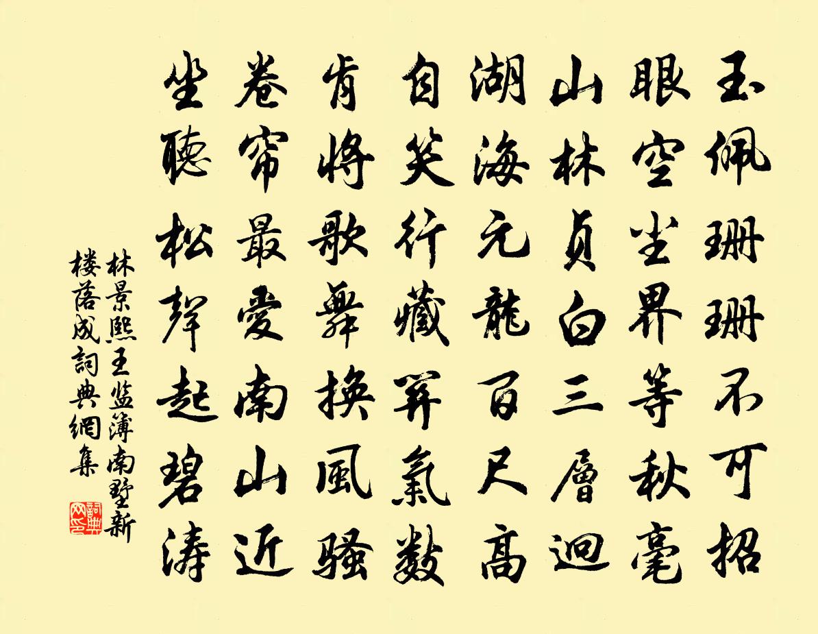 詩詞名句歷史字典書法欣賞書法字典國語詞典說文解字康熙字典古漢語字典標 題 作 者 詩 句 王監簿南墅新樓落成作者:林景熙 朝代:宋代王監簿南墅新樓落成原文玉佩珊珊不可招,眼空塵界等秋毫。山林貞白三層迥,湖海元龍百尺高。自笑行藏關氣數,肯將歌舞換風騷。捲簾最愛南山近,坐聽松聲起碧濤。詩詞問答問:王監簿南墅新樓落成的作者是誰?答:林景熙問:王監簿南墅新樓落成寫於哪個朝代?答:宋代林景熙王監簿南墅新樓落成書法欣賞王監簿南墅新樓落成書法作品詩詞推薦趙氏樓偶成陳著〔宋代〕過耳南宮捷奏鈴,功名宿夢頓呼醒。清風席上龜占古,細雨樓頭鵲語靈。袖裡瑰文珍白璧,眼中霜潁銳青萍。問津遠色閣二首郭印〔宋代〕遐觀目力窮,莽蒼雲山礙。儻知色非色,坐見六合外。對芳樽廣韋蘇州詩作姜特立〔宋代〕對芳樽,老來萬事不足論。朱唇皓腕年少伴,青山白雲居古鄰。對芳樽,老來萬事不足論。庸齋再賦予亦再和高斯得〔宋代〕苕濱衰白一羈人,五玷皇華遣使臣。已自無恩及南楚,那能有福散東閩。預憂刺史聲名減,不稱君侯佳句新。踏遍郊居言志韋應物〔唐代〕負暄衡門下,望雲歸遠山。但要尊中物,餘事豈相關。交無是非責,且得任疏頑。日夕臨清澗,逍遙思慮閒。出去排悶陸游〔宋代〕造物冥冥中,與我無一面,不知獲罪由,動輒被訶遣;又若哀其愚,救以藥瞑眩。我亦揣此心,安受不敢怨。中間聽歌六絕句。聽都子歌白居易〔唐代〕都子新歌有性靈,一聲格轉已堪聽。更聽唱到嫦娥字,猶有樊家舊典刑。七娘子陳亮〔宋代〕風流家世傳張緒。似靈和新種垂楊縷。綺席摛詞,銀台奏賦。當年夢繞蓬山路。賣花聲斷藍橋暮。記吟鞭醉帽曾經村居感興楊朴〔宋代〕一壺村酒膠牙酸,十數胡皴徹骨乾。隨著四婆裙子後,杖頭挑去賽蠶官。偈傾一百六十九首釋智朋〔宋代〕是藥非藥,信手拈來。 * 活人,風生八極。任是文殊維摩,也少這一服不得。酬慕容員外王安石〔宋代〕初駕王門學者師,晚漂湖海眾人悲。吹毛未識腰間劍,刺股猶藏袖裡錐。衛霍功名還有命,蘇張才氣久非時。江尤王公吟邵雍〔宋代〕王公大人,天下具瞻。輕流薄習,重損威嚴。此尚未了,彼安能兼。非唯失道,又復起貪。頂戴儒冠,心存象教。游山七絕千山觀張釜〔宋代〕小立東風紫翠顛,畫屏展盡一山川。非關眼界因高別,自是人心逐物遷。曲江亭望慈恩寺杏園花發陳翥〔唐代〕曲江晴望好,近接梵王家。十畝開金地,千林發杏花。映雪猶誤雪,煦日欲成霞。紫陌傳香遠,紅泉落影斜。園中初夏即事十二解楊萬里〔宋代〕柳外花梢啼亂鶯,行人過盡不曾聽。得人聽處君知麽,天欲明時第一聲。題徐氏金湖書院梁白〔宋代〕煙霞縹緲鎖仙鄉,萬卷詩書一草堂。孝義聲華輝北闕,門閭烜赫照南方。千尋瀑布侵肌冷,四季間花撲鼻香。正是肅簡魯公輓詞四首宋祁〔宋代〕拂世謨謀盛,端朝載采熙。上前推汲直,天下詠曹隨。密啟多焚草,加餐饜嗜葵。不圖霜露疾,奄忽喪元龜。豐乾贊釋紹曇〔宋代〕加紗掛頭何規矩,眼要看經不識字。差般差樣制風顛,硬作斑貓騎作虎。道是彌陀,有何本據。閭丘太守,似蘇州好事近石孝友〔宋代〕微雨灑芳塵,醞造可人春色。聞道夢雲樓外,正小桃花發。殷勤留取最繁枝,樽前待閒折。準擬亂紅深處,化一雙九日偕成均同官北山登高二首喻良能〔宋代〕輕霞朝日兩微茫,沙路駸駸十里強。照水有情楓葉赤,倚崖無數菊花黃。興酣爭舉凌雲筆,醉熟重浮灩海觴。明日名句推薦但見淚痕濕,不知心恨誰。李白《怨情》 況是青春日將暮,桃花亂落如紅雨。李賀《將進酒》 終南陰嶺秀,積雪浮雲端。祖詠《終南望余雪》 故園便是無兵馬,猶有歸時一段愁陳與義《送人歸京師》 去年射虎南山秋,夜歸急雪滿貂裘。陸游《三月十七日夜醉中作》 媼引濃妝女,兒扶爛醉翁。范成大《寒食郊行書事》 詩言志,歌永言,聲依永,律和聲。佚名《尚書·虞書·舜典》 時有滿虛,事有利害,物有生死。韓非及後人《韓非子·觀行》 幾日喜春晴,幾夜愁春雨。高觀國《卜運算元·泛西湖坐間寅齋同賦》 如今卻憶江南樂,當時年少春衫薄。韋莊《菩薩蠻·如今卻憶江南樂》