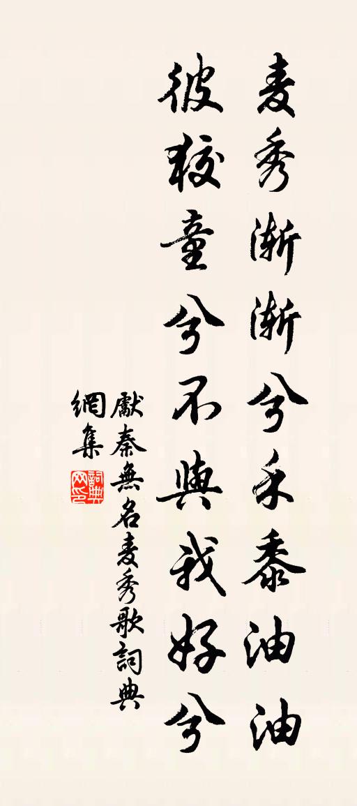 詩詞名句歷史字典書法欣賞書法字典國語詞典說文解字康熙字典古漢語字典標 題 作 者 詩 句 麥秀歌作者:先秦無名 朝代:先秦麥秀歌原文麥秀漸漸兮禾黍油油。彼狡童兮不與我好兮。詩詞問答問:麥秀歌的作者是誰?答:先秦無名問:麥秀歌寫於哪個朝代?答:先秦問:麥秀歌是什麼體裁?答:樂府先秦無名麥秀歌書法欣賞麥秀歌書法作品詩詞推薦病小減復作陸游〔宋代〕衛養元無術,衰殘只自悲。扶行十步地,強坐一炊時。枕籍漆園語,呻吟栗里詩。災年未易過,那敢望期頤。送侍讀常尚書絕句六首劉克莊〔宋代〕先帝倦勤揚末命,嗣皇訪落記孤忠。銅人嘿嘿輸伊輩,鐵漢堂堂止此翁。江樓作張喬〔唐代〕憑檻見天涯,非秋亦可悲。晚天帆去疾,春雪燕來遲。山水分鄉縣,干戈足別離。南人廢耕織,早晚罷王師。和顏長官百詠空門朱繼芳〔宋代〕閉口桐魚勿復論,數間老屋枕雲根。曉鍾三板出山去,分付獼猴為守門。筍鞭徐夤〔唐代〕筇竹岩邊剔翠苔,錦江波冷洗瓊瑰。累累節轉蒼龍骨,寸寸珠聯巨蚌胎。須向廣場驅駔駿,莫從閒處撻駑駘。寧同幽居書事陸游〔宋代〕安命知天更不疑,幽居最愛早寒時。手中書墮初酣枕,窗下燈殘正劇棋。鮮鯽每從溪女買,香菰時就釣船炊。山陰石瀦李群玉〔唐代〕古岸陶為器,高林盡一焚。焰紅湘浦口,煙濁洞庭雲。迥野煤飛亂,遙空爆響聞。地形穿鑿勢,恐到祝融墳。踏莎行陳師道〔宋代〕紅上花梢,風傳梅信。青春欲動群芳競。林聲鳥語帶餘寒,江光野色開游徑。乍雨還晴,喧寒不定。重門深院簾帷同周湛二上人游西湖之北山天竺晚歸得十絕釋紹嵩〔宋代〕好是春風湖上亭,軒空小憩俗塵清。湖山有意留儂款,楊柳飛花亂晚晴。挽提乾趙君陳棣〔宋代〕識君童稚過成人,旋見從師學日新。一舉文場收雋譽,十年仕路固清貧。豪添徐邈中賢興,瘦減相如病渴身。如善菩薩蠻(題醉道人圖)劉辰翁〔宋代〕八仙名姓當時少。污尊牛飲同傾倒。惟有我公榮。旁人笑獨醒。多年村落走。泥飲無升斗。入了玉門關。人生一醉相和歌辭大堤曲楊巨源〔唐代〕二八嬋娟大堤女,開爐相對依江渚。待客登樓向水看,邀郎卷幔臨花語。細雨濛濛濕芰荷,巴東商侶掛帆多。自傳生查子高觀國〔宋代〕芙蓉羞粉香,倚竹窺煙霽。眼帶楚波寒,骨艷春風醉。誰傳側帽情,想解遺鞭意。紅葉可憐秋,不寄相思字。和趙振文太社郵筒遠寄曹彥約〔宋代〕天與容台掾,田園早得歸。杯中寧有影,海上息忘機。世路閒身好,人生靜者稀。更於蘐草處,靜看老萊衣。梅花七律張道洽〔宋代〕高標勝韻點人寒,殘雪疎籬是水南。天上玉妃居第一,人閒石友結成三。廣平心事今猶在,和靖家風晚最諳。莫訝和南塘嘲謔衛宗武〔宋代〕理存成壞與虧全,人事悲懽莫不然。梅帳道人新活計,柳枝妓舊因緣。斷弦謾說鸞膠續,剜肉難將獺髓填。更遣青送胡平一赴召六絕曾豐〔宋代〕詔歸台閣侍從容,名節相高氣自雄。攘臂何愁難倒海,抬頭不畏有頹嵩。題修廣房曾鞏〔宋代〕世情袞袞利名間,子有高情獨閉關。萬事長年拋似夢,一堂終日靜于山。幽花得地無妍醜,好鳥窺人自往還。藥錄憶天台之游陳宓〔宋代〕小酌一杯金鑿落,共聽終席玉潺湲。何時築室屏山側,靜與秋蟾作伴眠。定風波 紅梅蘇軾〔宋代〕好睡慵開莫厭遲。自憐冰臉不時宜。偶作小紅桃杏色,閒雅,尚餘孤瘦雪霜姿。休把閒心隨物態,何事,酒生微暈名句推薦自是人生長恨水長東。李煜《相見歡·林花謝了春紅》 新歡不抵舊愁多,倒添了、新愁歸去范成大《鵲橋仙·七夕》 不信比來長下淚,開箱驗取石榴裙。武則天《如意娘》 石壕村里夫妻別,淚比長生殿上多。袁枚《馬嵬》 一夕輕雷落萬絲,霽光浮瓦碧參差。秦觀《春日》 風光人不覺,已著後園梅。史青《應詔賦得除夜》 福善之門莫美於和睦,患咎之首莫大於內離。班固《漢書·傳·宣元六王傳》 青山如黛遠村東,嫩綠長溪柳絮風。高珩《春日雜詠》 等閒識得東風面,萬紫千紅總是春。朱熹《春日》 絲絲楊柳絲絲雨。春在溟濛處。蔣捷《虞美人·梳樓》