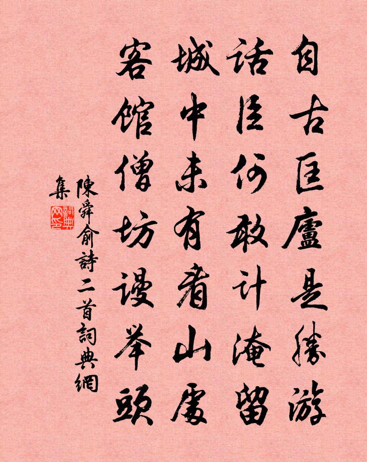 詩詞名句歷史字典書法欣賞書法字典國語詞典說文解字康熙字典古漢語字典標 題 作 者 詩 句 詩二首作者:陳舜俞 朝代:宋代詩二首原文自古匡廬是勝游,話臣何敢計淹留。城中未有看山處,客館僧坊謾舉頭。詩詞問答問:詩二首的作者是誰?答:陳舜俞問:詩二首寫於哪個朝代?答:宋代陳舜俞詩二首書法欣賞詩二首書法作品詩詞推薦齋宿昭慶院祀南嶽南海喻良能〔宋代〕秉檄奉中祀,驅車出重關。曉風鐵葉嶺,煙雨南屏山。瀹茗澡塵慮,褰簾飫孱顏。精意孚海岳,清聲搖佩環。自警二首宋度宗〔宋代〕孳孳為善,無怠講習。心思唐虞,聖道可人。夢庵相士釋妙倫〔宋代〕煙霞影里蒼苔面,山水光埋古柏身。為報夢庵休諸夢,老僧不是夢中人。原居早秋釋懷古〔宋代〕秋生深徑里,老病眼慵開。戶外行人絕,林間朔吹回,亂蛩鳴古塹,殘日照荒台。唯有他山約,相親入望來。臨安送鄭左藏陳宓〔宋代〕華發蕭然入帝城,如何直道尚迂遲。從來白璧稱和氏,安得黃金到不疑。歸騎正須夸疾速,慈顏想見倍歡怡。人生題現老真范成大〔宋代〕三十年來共葛藤,如今蓮社冷如冰。茶瓜櫻筍游山會,從此齋廚欠一僧。僑寄山居霍然幾月凡見之於目聞之於耳者輒綴王志道〔宋代〕樹頭桑葉似穿錢,準擬今年賤似前。誰信天公難預料,今年卻貴似常年。留題北禪院李復〔宋代〕偶到叢林訪可休,南山依舊滿晴樓。垂鉤漫有深潭興,遍滿乾坤是即收。鳳棲方丈鄭清之〔宋代〕矮伯老於周柱史,瘦梅青似楚離騷。推窗欲覓登山路,無數青苔落鸛毛。和顏長官百詠城市朱繼芳〔宋代〕村翁生長在柴門,身有丁男犢有孫。為了官租才出市,歸家誇說與鄉村。湖堤雨中夜歸方回〔宋代〕夜雨昏昏欲雪天,數家燈火北山前。鄉心認作桑麻路,忽有湖船奏管紘。寄題友人小軒張嵲〔宋代〕簪組豈為累,悠然塵事微。看山心自適,閉戶客來稀。流水三吳大,清霜眾卉腓。何由納芒履,一為款荊扉。睢陽酬別暢大判官高適〔唐代〕吾友遇知己,策名逢聖朝。高才擅白雪,逸翰懷青霄。承詔選嘉賓,慨然即馳軺。清晝下公館,尺書忽相邀。留歡招張仲宗陳與義〔宋代〕北風日日吹茅屋,幽子朝朝只地爐。客里賴詩增意氣,老來唯懶是工夫。空庭喬木無時事,殘雪疏籬當畫圖。亦有贈湖上父老十八韻陸游〔宋代〕一鏡三百里,環以碧玉峰,天公賜我厚,極目為提封。煙收見石帆,雨霽望臥龍,嵯峨寶林塔,迢遞天章鍾。興來贈高德順楊萬里〔宋代〕兒時同客水中蟹,鴨腳林間索詩債。只今白髮共青燈,一尊濁酒話平生。我才不及君才美,毛款負君真差事。見說邊頭嘆蘇泂〔宋代〕邊頭奏涼風,戰士送寒衣。北征夏徂秋,君王虛六師。區區彼敵人,授首詎無期。冰霜輝戈甲,勇憶臨去時。去去扇子詩李石〔宋代〕上頭圓蓋下方盤,中夾痴憨白肉圓。九竅八骸渾不識,更來底處覓心安。陪陳叔易汪彥章登浮翠亭李處權〔宋代〕群峰如高馬,飛雲若為馭。蒼翠來無際,擺脫欲仙去。我時登茲亭,物色生四顧。同行有君子,粲笑隨杖屨。樵蘇梅黃杞〔宋代〕略彴低橫露淺灘,瘦筇獨立月華殘。一枝拂掠渾如舊,思入清江煙水寒。名句推薦翠葉藏鶯,朱簾隔燕。晏殊《踏莎行·小徑紅稀》 時不可留,眾不可逆。范曄《後漢書·本紀·光武帝紀上》 黃雲萬里動風色,白波九道流雪山。李白《廬山謠寄盧侍御虛舟》 花開又被風吹落,月皎那堪雲霧遮。施耐庵《水滸傳·第一百一十二回》 今我來思,雨雪載途。佚名《出車》 儻寄相思字,愁人定解顏。錢起《送夏侯審校書東歸》 忽大風起,塵氣莽莽然,城市依稀而已。蒲松齡《山市》 長驅入,歌台舞榭,風卷落花愁徐君寶妻《滿庭芳·漢上繁華》 雞鳴紫陌曙光寒,鶯囀皇州春色闌。岑參《奉和中書舍人賈至早朝大明宮》 春愁凝思結眉心,綠綺懶調紅錦薦。顧敻《玉樓春·拂水雙飛來去燕》