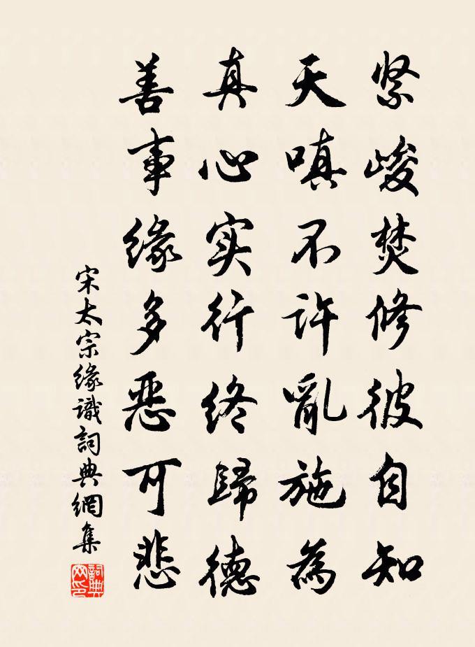 詩詞名句歷史字典書法欣賞書法字典國語詞典說文解字康熙字典古漢語字典標 題 作 者 詩 句 緣識作者:宋太宗 朝代:宋代緣識原文緊峻焚修彼自知,天嗔不許亂施為。真心實行終歸德,善事緣多惡可悲。詩詞問答問:緣識的作者是誰?答:宋太宗問:緣識寫於哪個朝代?答:宋代宋太宗緣識書法欣賞緣識書法作品詩詞推薦菩薩蠻曹勛〔宋代〕天台不是登長道。渾如弱水煙波渺。樓上指歸程。春風無限情。石橋書不到。雁陣橫空杳。愁緒比遙峰。依依千萬謝夢庵居士性宗集釋智愚〔宋代〕性本無宗夢亦非,萬機難透一真機。有時暗與乾坤合,笑看春花秋葉飛。宋玉李商隱〔唐代〕何事荊台百萬家,惟教宋玉擅才華。楚辭已不饒唐勒,風賦何曾讓景差。落日渚宮供觀閣,開年雲夢送煙花。可憐寄月山太守黃庚〔宋代〕下車方數月,早已政聲馳。太守一身瘦,東川百姓肥。勤勞惟聽政,閒暇即吟詩。官況依然在,何須賦式微。象弈一首呈葉潛仲劉克莊〔宋代〕小藝無難精,上智有未解。君看橘中戲,妙不出局外。屹然兩國立,限以大河界。連營凜中權,四壁設堅械。三十滿江紅(壽稼軒)楊炎正〔宋代〕壽酒如澠,拚一醉、勸君休惜。君不記、濟河津畔,當年今夕。萬丈文章光焰里,一星飛墮從南極。便御風、乘興送王吉州宣子舍人,和明州二首楊萬里〔宋代〕滿聽除書好,明州勝吉州。又為邦伯去,政坐治聲優。過闕端能遇,居中定作留。新民莫漫喜,竹馬不須休。和成父過寶應縣韻袁說友〔宋代〕趁得花封八月涼,相家有子綰銅章。習華指日神京路,此地方知寶應祥。鯨川八景沙堤風柳家鉉翁〔宋代〕突兀長堤一望問,幾人東去復西還。堤邊日日辦迎送,風自翩翻柳自閒。初春遣興三首始於志退休而終於惓惓許國之忠陸游〔宋代〕爛熟思來怕熱官,退飛心地喜輕安。舍魚正可取熊掌,食肉何須知馬肝。放眼柳梢初暗動,褪花梅子已微酸。典衣次韻朱同人攜妓見訪留題汪晫〔宋代〕行過晴溪鳥柏彎,清漪猶自照蒼顏。□□□□□□□,舉酒欣然得綠環。魚為知機潛別浦,蘭因避俗住空山。老夫金陵雜興二百首蘇泂〔宋代〕老大驅馳亦已勞,移文寧受客嗤嘲。人間多少閒田地,無處令渠著把茅。早春山居寄城中知己姚合〔唐代〕陽和潛發盪寒陰,便使川原景象深。入戶風泉聲瀝瀝,當軒雲岫影沉沉。殘雲帶雨輕飄雪,嫩柳含煙小綻金。雖有依韻和元參政喜雨四首王珪〔唐代〕頁旱連春與俗憂,忽興嘉雨遍群州。郊禾薿薿青如積,宮瓦差差翟欲流。良弼為霖辜宿望,神僧作霧應精求。西成五柳王安石〔宋代〕五柳柴桑宅,三楊白下亭。往來無一事,長得見青青。愛香亭葉茵〔宋代〕有君子兮居滄波,芝闌之室未足多。為香終日成痴絕,不著此亭如香何。光風霽月湯心目,幸甚吳沈沾塍馥。茲時呈諸先輩韓維〔宋代〕謝事歸來老白頭,杜門終日絕營求。顧慚義禮非先得,竊幸英豪許並游。介壽又逢春酒熟,貽詩常駭暗珠投。自慚贈紫岩潘庭堅四首白玉蟾〔宋代〕無愁是雲愁,無羞是雪羞。我非雲與雪,何以白我頭。日出雪自消,雨晴雲亦休。盛年輕棄擲,不及且娛游。寓陳雜詩十首張耒〔宋代〕唐有元相國,實殺顏平原。平原腹有丹,屍解神已仙。顏公死已矣,人見如生前。致令遺其像,委曲與人言。相國西江月蕭廷之〔宋代〕鼎器法天象地,坎離運用無差。夫妻相會入黃家。共說無生妙話。雨意雲情了當,領頭駕動河車。搬歸頂上結三花名句推薦是以知天欲人相愛相利,而不欲人相惡相賊。墨子《墨子·04章 法儀》 恐是仙家好別離,故教迢遞作佳期。李商隱《辛未七夕》 餘霞散成綺,澄江靜如練。謝朓《晚登三山還望京邑》 得道者多助,失道者寡助。孟子《孟子·公孫丑章句下·第一節》 江上幾人在,天涯孤棹還。溫庭筠《送人東遊》 情之所鍾,雖醜不嫌。沈復《浮生六記·閨房記樂》 縱被春風吹作雪,絕勝南陌碾成塵。王安石《北陂杏花》 脊令各有思歸恨,日月相催雪滿顛。黃庭堅《次元明韻寄子由》 子貢之無諂,原思之坐弦,是賢人守貧窮之法。王永彬《圍爐夜話·第四九則》 盈盈一點芳心,占多少春光,問卿知否?紅妝莫斗顧太清《玉燭新·白海棠》
