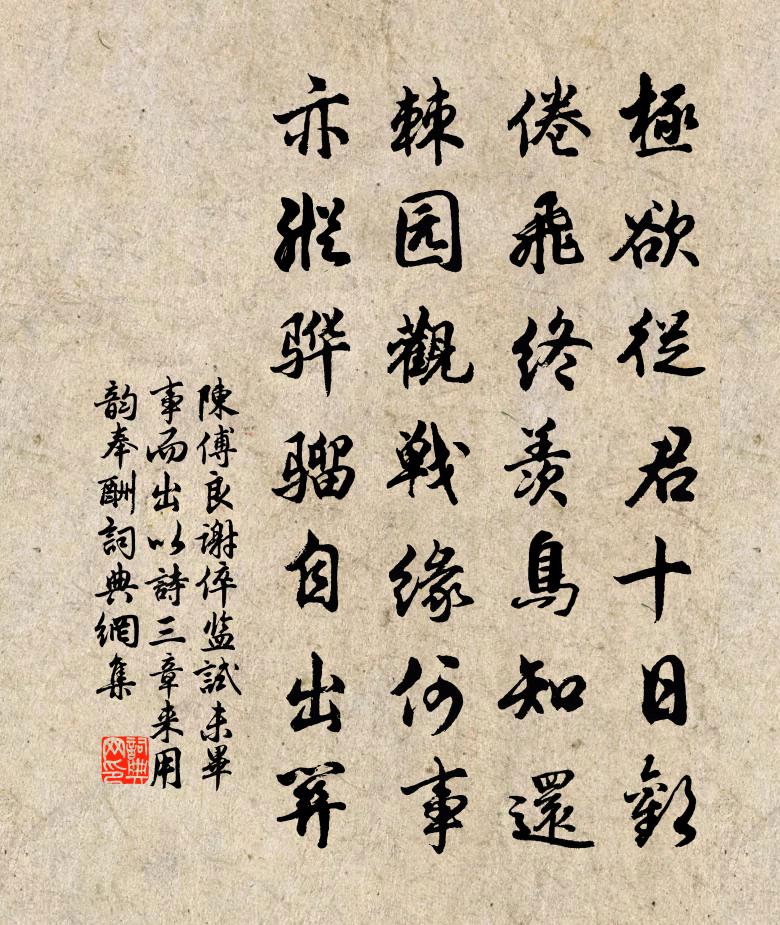 詩詞名句歷史字典書法欣賞書法字典國語詞典說文解字康熙字典古漢語字典標 題 作 者 詩 句 謝倅監試未畢事而出以詩三章來用韻奉酬作者:陳傅良 朝代:宋代原文極欲從君十日歡,倦飛終羨鳥知還。棘園觀戰緣何事,亦縱驊騮自出關。詩詞問答問:《謝倅監試未畢事而出以詩三章來用韻奉酬》的作者是誰?答:陳傅良問:該詩寫於哪個朝代?答:宋代書法欣賞謝倅監試未畢事而出以詩三章來用韻奉酬書法作品詩詞推薦扈從朝獻四首任希夷〔宋代〕禮官前導赭黃袍,陟降靈宮九陛高。二十七筵俱再拜,精虔不憚聖躬勞。渚宮蘇軾〔宋代〕渚宮寂寞依古郢,楚地荒茫非故基。二王台閣已鹵莽,何況遠問縱橫時。楚王獵罷擊靈鼓,猛士操舟張水嬉。釣魚嶽麓山道林二寺行杜甫〔唐代〕玉泉之南麓山殊,道林林壑爭盤紆。寺門高開洞庭野,殿腳插入赤沙湖。五月寒風冷佛骨,六時天樂朝香爐。地靈建他解歸詩復徐意一二首李昴英〔宋代〕吏擎雙印出,便覺此身輕。物我忘恩怨,漁樵寄姓名。笛聲黃犢背,詩興白鷗盟。故舊休相訝,無書到帝城。雪後三首趙蕃〔宋代〕陰巘猶施白,朝木已沐青。墜烏飛蔌蔌。射日粲熒熒。便恐歸無跡,聊須記所經。耳聲並目色,佳處若為形。偈頌一百零二首釋紹曇〔宋代〕萬機休罷住雲間,門掩青蘿竟日閒。時聽嗚咿歌一曲,倒騎黃犢出松關。若作佛法會,錦包特石。若作世諦會,鐵賞花釣魚宋仁宗〔宋代〕晴旭輝輝苑籞開,氤氳花氣好風來。遊絲罥絮縈行仗,墮蕊飄香入酒杯。魚躍文波時撥刺,鶯留深樹久徘徊。青春去婦王建〔唐代〕新婦去年胼手足,衣不暇縫蠶廢簇。白頭使我憂家事,還如夜裡燒殘燭。當初為取傍人語,豈道如今自辛苦。在時頌十玄談達本釋印肅〔宋代〕更無一物獻尊堂,剔出銀盆耀雪霜。箭既離弦無退轉,洞山收悔不思量。廣江驛餞筵留別李群玉〔唐代〕別筵欲盡秋,一醉海西樓。夜雨寒潮水,孤燈萬里舟。酒飛鸚鵡重,歌送鷓鴣愁。惆悵三年客,難期此處游。紫陽觀和家兄作陳阜〔宋代〕相將到靈觀,正值雨初晴。花近香逾妙,峰遙色更清。鶴盤雲外影,磬和澗中聲。再拜真人像,還丹願指明。題雷公井徐鉉〔唐代〕掩靄愚公谷,蕭廖羽客家。俗人知處所,應為有桃花。上政府五首郭印〔宋代〕塞上煙塵永不揚,邊民戌卒盡耕桑。抗言用武真非策,唾手扶危別有方。須信精誠能感格,由來道德本安強。恩沾愧故人文天祥〔宋代〕九門一夜漲風塵,何事痴兒竟誤身。子產片言圖救鄭,仲連本志為排秦。但知慷慨稱男子,不料蹉跎愧故人。玉勒雜詠黃庚〔宋代〕人無氣節何足道,腹有詩書自不同。實學真才誰具眼,江湖難遇杜司空。村宋伯仁〔宋代〕又是江南割稻天,家家兒女笑相牽。芙蓉占斷清溪水,獨許漁人醉艤船。偈頌十一首釋了演〔宋代〕四海共遵靈鷲制,九旬禁足自蕭然。飢餐渴飲隨緣過,禪道是非掃一邊。知我者謂我深錐痛劄,不知我者謂我弔影白紵歌舞四時詞冬楊萬里〔宋代〕秪愁窮臘雪作惡,不道雪天好行樂。玻璃琖底回青春,蒲萄錦外舞玉塵。陽春一曲小垂手,勸君一杯千萬壽。今年疏影張炎〔宋代〕雪空蓋四野,照蓋歸心萬里蓋,千峰獨蓋立。身與天游,一洗襟懷,海鏡倒涌秋白。相逢懶問盈虧事,但脈脈、此景靈宮奉安神考御容孔武仲〔宋代〕先帝遺弓劍,威靈在九州。方悲風馭遠,已見月衣游。別殿笙歌動,中天彩翠浮。觚稜參魏闕,氣象擬蓬丘。羽衛名句推薦桃李不言,下自成蹊;道旁苦李,為人所棄。程登吉《幼學瓊林·卷四·花木》 西北望鄉何處是,東南見月幾回圓。白居易《八月十五日夜湓亭望月》 連山變幽晦,綠水函晏溫柳宗元《飲酒》 今古河山無定據。納蘭性德《蝶戀花·出塞》 欲求生富貴,須下死工夫。佚名《增廣賢文·上集》 柳色參差掩畫樓,曉鶯啼送滿宮愁。司馬扎《宮怨 / 閨怨》 撩亂邊愁聽不盡,高高秋月照長城。王昌齡《從軍行七首》 芳洲拾翠暮忘歸,秀野踏青來不定。張先《木蘭花·乙卯吳興寒食》 會稽愚婦輕買臣,余亦辭家西入秦。李白《南陵別兒童入京》 花開堪折直須折,莫待無花空折枝。杜秋娘《金縷衣》