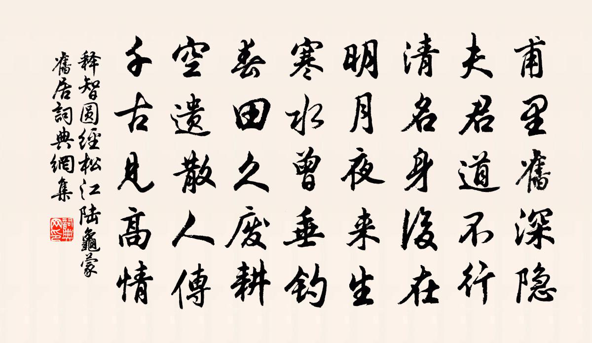 詩詞名句歷史字典書法欣賞書法字典國語詞典說文解字康熙字典古漢語字典標 題 作 者 詩 句 經松江陸龜蒙舊居作者:釋智圓 朝代:宋代經松江陸龜蒙舊居原文甫里舊深隱,夫君道不行。清名身後在,明月夜來生。寒水曾垂釣,春田久廢耕。空遺散人傳,千古見高情。詩詞問答問:經松江陸龜蒙舊居的作者是誰?答:釋智圓問:經松江陸龜蒙舊居寫於哪個朝代?答:宋代釋智圓經松江陸龜蒙舊居書法欣賞經松江陸龜蒙舊居書法作品詩詞推薦統分稻晚歸陸游〔宋代〕薄酒不自酌,夕陽須汝歸。橘包霜後美,豆莢雨中肥。路遠應加飯,天寒莫減衣。老懷憂自切,道眼看皆非。詩一首高荷〔宋代〕妄作非吾事,罷官飢爾曹。此心常去住,何日遂孤高。雁伴烏瘡脫,蠅營狗跛勞。不如張仲蔚,門外長蓬蒿。水龍吟 留別張之翰〔元代〕別來幾度秋風,數千里外還重遇。虛齋畫掩,厭厭多病,賴君看護。鵝鴨比鄰,魚蝦市井,擬留余住。被催人天上剡中詩林表民〔宋代〕遺蹤曾記晉諸賢,乘興今無雪後船。斷塹毀垣難借問,磚文猶著太康年。句彭止〔宋代〕天西玉一鉤。一叢花晁端禮〔宋代〕謫仙海上駕鯨魚。談笑下蓬壺。神寒骨重真男子,是我家、千里龍駒。經綸器業,文章光焰,流輩更誰如。淵明元次韻和太僕錢少卿寄贈編修主人宋承旨李舍人楊億〔宋代〕春官宗伯魯諸生,翰苑綸闈占大名。一代典謨資潤色,滿朝文物仰懸衡。分班月殿趨金馬,侍宴天池見五鯨。即日離三節鎮日色正盛頃間雲起陽烏不見終日清涼郭印〔宋代〕忽訝雲峰合,渾忘暑氣侵。垂天真有意,籠日豈無心。行旅人人悅,空山處處陰。更期頭上黑,相送到溪林。賦得臨池柳李世民〔唐代〕岸曲絲陰聚,波移帶影疏。還將眉里翠,來就鏡中舒。道店菊趙蕃〔宋代〕種花本欲娛行客,客子逢花特地悲。忽忽重陽今半月,依然青蕊網蛛絲。夜半樂(中呂調)柳永〔宋代〕艷陽天氣,煙細風暖,芳郊澄朗閒凝佇。漸妝點亭台,參差佳樹。舞腰困力,垂楊綠映,淺桃穠李夭夭,嫩紅無數夏日聯句李昂〔唐代〕人皆苦炎熱,我愛夏日長。——李昂薰風自南來,殿閣生微涼。——柳公權寄友人王晉老滕岑〔宋代〕送君行日雪揚飛,曾幾何時畫箑揮。自別空驚鬚髮變,得書聊證夢魂非。紫樞白簡家聲在,黃卷青燈生事微。悟得淳熙八年端午帖子詞太上皇帝合六首崔敦詩〔宋代〕待月長生殿,迎風太液池。茲顏歡樂日,聖德盛明時。芳草渡皮日休〔唐代〕溪南越鄉音,古柳渡江深。日晚無來客,閒船系綠陰。屢乞近郡詔不許宋祁〔宋代〕避賢求假左朱輪,衡石通章觸罷頻。十駕似駑寧取道,五能如鼠不藏身。危心事國區區在,短領侵年種種新。君惠導引佚名〔宋代〕彤霞縹緲,海上隱三山。仙去莫能攀。珠宮本是神靈宅,飈馭此來還。雲邊天日望威顏。不似在人間。當時齊魯鳴題朱秀城南亭子章孝標〔唐代〕朱家亭子象懸匏,階瑩青莎棟剪茆。癭掛眼開欺鴝鵒,花緣網結妒螵蛸。有時風月輸三虎,無壁琴書屬四郊。土木從軍行王宏〔唐代〕兒生三日掌上珠,燕頷猿肱穠李膚。十五學劍北擊胡,羌歌燕築送城隅。城隅路接伊川驛,河陽渡頭邯鄲陌。可憐游清潭呂資益蟠谷絕初秋劉過〔宋代〕老子垂垂秋露下,九月空山天氣寒。黃花剩開且勿剪,留得一秋煙雨看。名句推薦詩言志,歌永言佚名《尚書·虞書·舜典》 天地之性,人為貴。 人之行,莫大於孝。孔子及其弟子《孝經·聖治》 先天下之憂而憂,後天下之樂而樂范仲淹《岳陽樓記》 牆外行人,牆裡佳人笑。蘇軾《蝶戀花·春景》 三山半落青天外,二水中分白鷺洲李白《登金陵鳳凰台》 田野荒而倉廩實,百姓虛而府庫滿,夫是之謂國蹶。荀子《荀子·富國》 花漸凋疏不耐風,畫簾垂地晚重工,墮階縈蘚舞愁紅孫光憲《浣溪沙·花漸凋疏不耐風》 小舟橫截春江,臥看翠壁紅樓起。蘇軾《水龍吟·閭丘大夫孝終公顯嘗守黃州》 幾度東風吹世換,千年往事隨潮去。戴復古《滿江紅·赤壁懷古》 檳榔無柯,椰葉無陰。左思《三都賦》