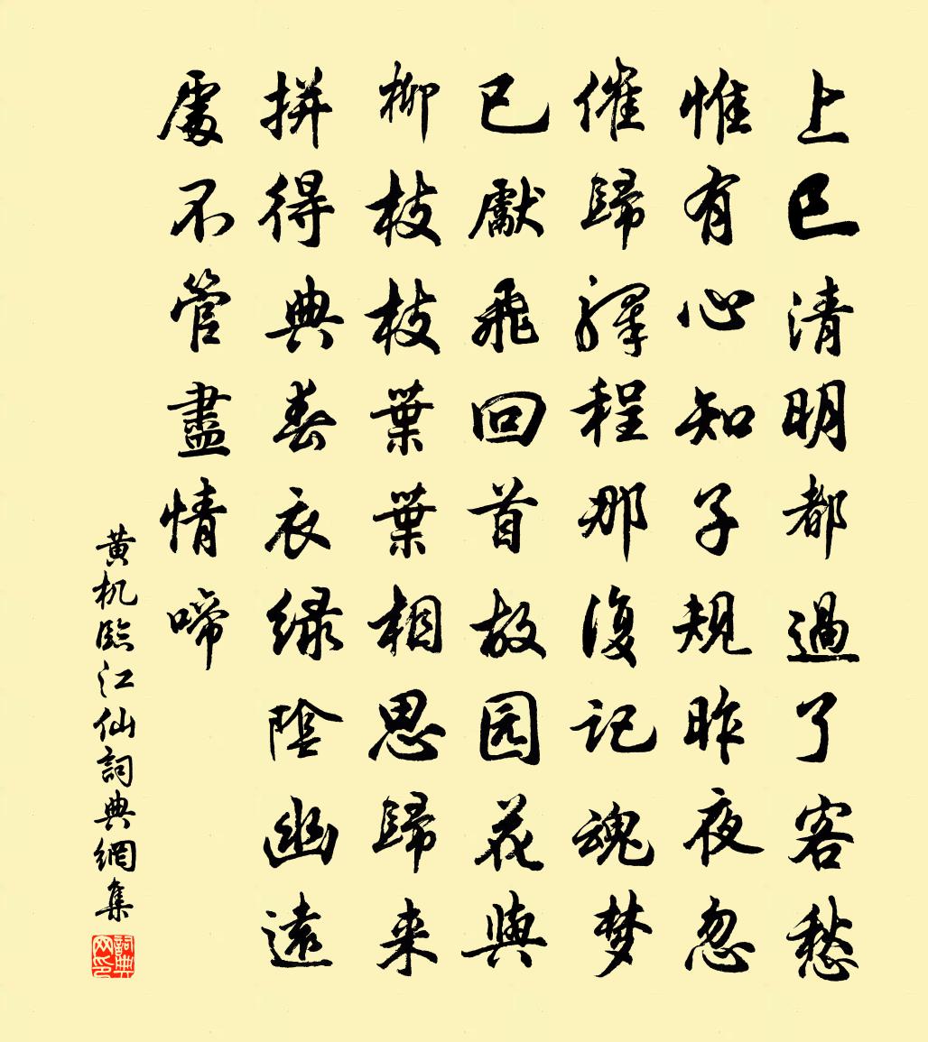 詩詞名句歷史字典書法欣賞書法字典國語詞典說文解字康熙字典古漢語字典標 題 作 者 詩 句 臨江仙作者:黃機 朝代:宋代臨江仙原文上巳清明都過了,客愁惟有心知。子規昨夜忽催歸。驛程那復記,魂夢已先飛。回首故園花與柳,枝枝葉葉相思。歸來拼得典春衣。綠陰幽遠處,不管盡情啼。詩詞問答問:臨江仙的作者是誰?答:黃機問:臨江仙寫於哪個朝代?答:宋代黃機臨江仙書法欣賞臨江仙書法作品詩詞推薦玉岩陳宗禮〔宋代〕翠屏青紫互高低,清淨仙人薜荔衣。正好觀心坐岩下,忘歸卻是不忘歸。送宣宗禹保寧事掌書記樓鑰〔宋代〕宣之為姓世所稀,暇日試為君家推。宋之宣公舍與夷,子孫相承此為基。或雲出自魯宣伯,元和姓纂言則非。西京東宮生日六首壬辰林光朝〔宋代〕北闕云為堞,東明玉作宮。猗蘭迎曉日,仙掌倚晴空。笙律隨鳴鳳,朝儀趁彩虹。黃麾初入杖,青桂自成叢。冠屨續八詠八詠掞英詞唐仲友〔宋代〕掞英詞,英詞有微意。懷章戀雙闕,吟情深六義。秋月清可依,春風惠無私。草桐感霜露,鴻鶴傷羽儀。解玉佩,次韻姜邦傑見訪留贈三詩張鎡〔宋代〕飽看朝霞與暮雲,一丘一壑大無塵。關門果是倦迎客,倒屣還因有句人。宿桐廬江寄廣陵舊遊孟浩然〔唐代〕山暝聽猿愁,滄江急夜流。風鳴兩岸葉,月照一孤舟。建德非吾土,維揚憶舊遊。還將兩行淚,遙寄海西頭。快哉亭朝暮寓目二首之一賀鑄〔宋代〕夙起喜舒曠,徑趨城上樓。初陽動禾黍,積雨失汀洲。水牯負鴝鵒,山樞懸栝蔞。坐慙真隱子,物我兩悠悠。重九潘牥〔宋代〕才說登山病便蘇,老身健得似於菟。一絲白處潮來往,數點青邊山有無。厭勝詩窮多插菊,驅魔酒惡細看萸。龍山梅花喜神譜就實六枝宋伯仁〔宋代〕東門風飄飄,雙佩清如水。出門相送人,胡不共知止。冬夜與溥庵主說川食戲作陸游〔宋代〕唐安薏米白如玉,漢嘉栮脯美勝肉。大巢初生蠶正浴,小巢漸老麥米熟。龍鶴作羹香出釜,木魚瀹葅子盈腹。未論自金山放船至焦山蘇軾〔宋代〕金山樓觀何耽耽,撞鐘擊鼓聞淮南。焦山何有有修竹,採薪汲水僧兩三。雲霾浪打人跡絕,時有沙戶祈春蠶。我來曹主簿涇自卜壽藏追范石湖韻謹依虛谷使君例汪炎昶〔宋代〕醉吟且傍釣硯揪,墳上何曾酒到劉。從古英雄皆地下,向家掃拜尚原頭。光陰且勒私顏子,螻曦那知望孔丘。名在碁釋行海〔宋代〕一著臨期下手難,但尋活路向前行。從教對面成千里,黑白分明不用爭。懷友黃庚〔宋代〕聽雨思君淚欲流,檐聲滴老鬢邊秋。何時過我晴窗下,共話思君聽雨愁。寄李道人王安石〔宋代〕李生富漢亦貧兒,人不知渠只我知。跳過六輪中耍峭,養成三界外愚痴。次龍山韻馬廷鸞〔宋代〕新來霄漢冥鴻客,舊日風雲振驚行。脫下戲衫優便散,驚回客枕夢何長。莫將吳蜀分岐路,政把乾坤作醉鄉。惟有憶故山贈司空曙李端〔唐代〕漢主金門正召才,馬卿多病自遲回。舊山暫別老將至,芳草欲闌歸去來。雲在高天風會起,年如流水日長催。知君使東川駱口驛二首元稹〔唐代〕郵亭壁上數行字,崔李題名王白詩。盡日無人共言語,不離牆下至行時。二星徼外通蠻服,五夜燈前草御文。我到病目作近體詩五首晁說之〔宋代〕何事蘭成酷愛愁,借愁為樂總宜休。天涯二月無新曆,京國三年誤舊遊。忽接家書迷遠近,欲為客難卻沉浮。道人寄滿子權二首王令〔宋代〕窗前午枕夢忘還,門外清風晝掩關。天下誰當千古後,床頭自笑六經閒。能將道系窮通里,安用身居進退間。自愧名句推薦茅檐低小,溪上青青草。辛棄疾《清平樂·村居》 問汝平生功業,黃州惠州儋州。蘇軾《自題金山畫像》 勝人者有力,自勝者強。老子《老子·道經·第三十三章》 從心所欲,不逾矩。孔子弟子《論語·為政篇》 金風玉露一相逢,便勝卻人間無數。秦觀《鵲橋仙·纖雲弄巧》 靜女其孌,貽我彤管。佚名《靜女》 桃花一簇開無主,可愛深紅愛淺紅?杜甫《江畔獨步尋花·其五》 幸遇三杯酒好,況逢一朵花新。朱敦儒《西江月·世事短如春夢》 草木也知愁,韶華竟白頭。曹雪芹《唐多令·柳絮》 客路相逢難,為樂常不足。蘇軾《送頓起》