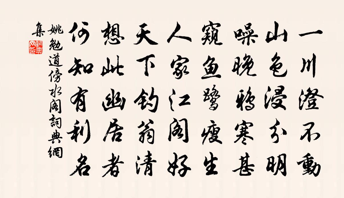 詩詞名句歷史字典書法欣賞書法字典國語詞典說文解字康熙字典古漢語字典標 題 作 者 詩 句 道傍水閣作者:姚勉 朝代:宋代道傍水閣原文一川澄不動,山色浸分明。噪晚鴉寒甚,窺魚鷺瘦生。人家江閣好,天下釣翁清。想此幽居者,何知有利名。詩詞問答問:道傍水閣的作者是誰?答:姚勉問:道傍水閣寫於哪個朝代?答:宋代姚勉道傍水閣書法欣賞道傍水閣書法作品詩詞推薦清商怨仇遠〔宋代〕黃花丹葉紺草。染恨西園曉。夢度秦樓,孤鴻雲影倒。連環舊約忘了。應記□、綠珠嬌小。莫翦回文,玉關人未老賀新郎劉子寰〔宋代〕柱杖毛凌高絕。毛望千山隱毛隱,波瀾毛動搖天末。下有白雲平遠壑,湧起潮頭噴雪。浸絕島、孤峰出沒。赤縣神淳熙七年端午帖子詞皇后合六首崔敦詩〔宋代〕翠雲幕卷迎風殿,零露盤高待月台。應上君王千萬壽,霓裳吹下九天來。送修武元少府錢起〔唐代〕寸祿榮色養,此行寧嘆惜。自今黃綬采蘭時,不厭丹墀芳草色。百戰荒城復井田,幾家春樹帶人煙。黎氓久厭蓬飄王正之提刑見和茉莉小詩甚工。今日茉莉漸過范成大〔宋代〕茉莉吟余又木犀,碧瑤葉底露金支。從今日日須搜句,莫遣硯池生網絲。綠萼梅王之道〔宋代〕天然膩玉細生香,斜倚東風竚淡妝。可是春寒猶料峭,曉窗猶試綠羅裳。贈道流陸游〔宋代〕煙雲深處作生涯,回首人間歲月賒。留得朱顏憑綠酒,掃空白髮賴丹砂。七弦指下泠泠久,雙袖風中獵獵斜。他日次雪舟進退韻胡仲弓〔宋代〕誰肯因貧賣寶刀,半生湖洚分蹉跎。春回池草吟魂覺,月在梅花瘦影高。旅況又隨年事長,交情偏耐歲寒多。頂斯送郡守徐元傑〔宋代〕郎圍師閫重王人,朝績民庸簡帝宸。屈此偏州何小小,偉哉仁牧自肫肫。下車福十餘萬戶,褒璽朞三百六旬。廉恕和陶擬古九首蘇軾〔宋代〕黎山有幽子,形槁神獨完。負薪入城市,笑我儒衣冠。生不聞詩書,豈知有孔顏。翛然獨往來,榮辱未易關。日暮覽古晁說之〔宋代〕遙岑不娛人,蒼莽頗愁絕。東南有斷梁,水寒不可涉。西關不欲往,旦暮畏喋褻。歸來坐北堂,悠然理書策。之人憨郭郎 贈重陽真人侄王周臣馬鈺〔元代〕休要強貪名利,休要戀妻男。免輪迴,生死苦,做痴憨。清淨自然明道,神氣自相參。功成朝玉帝,跨雲驂。踏莎行(與莫兩山譚邗城舊事)周密〔宋代〕遠草情鍾,孤花韻勝。一樓聳翠生秋暝。十年二十四橋春,轉頭明月簫聲冷。賦藥才高,題瓊語俊。蒸香壓酒芙蓉偶見吟邵雍〔宋代〕富貴多傲人,人情有時移。道德不傲人,人情久益歸。道德有常理,富貴無定期。蒿萊霜至萎,松柏雪更滋。望雲岩趙湘〔唐代〕不見寒山子,寒岩日欲曛。無人到深處,眾木隱孤雲。水照秋痕盡,霞明晚翠分。孤猿啼亦在,誰向此中聞。浣溪沙 內黃道中王惲〔元代〕風柳婆娑半畝陰。兩枝巧與道相鄰。樹頭幽鳥似知音。馬上行人思困睡,天邊赤日欲流金。解鞍休惜濯煩襟。蘇武慢凌雲翰〔元代〕有酒無餚,柰何良夜,客有鱸魚相惠。如此山川,幾何日月,三國竟成何事。目斷風帆,江空歲晚,覓句漫思無已答寄魏衍陳師道〔宋代〕往昔敦朋好,猶能成報書。老衰渾得懶,疏密略相如。名墮網中蝶,身隨冰下魚。填門車馬客,左席為君虛。江上晚行寇準〔宋代〕秦川不得卻歸耕,奉詔年來在楚城。孤寺殘鍾催夕照,汀洲疏葦送秋聲。西風獨起湖山思,久客應知寂寞情。野鶴和楊誠齋題梅山詩卷姜特立〔宋代〕接武東朝集鳳鸞,相如亦預賦梁園。仆旗我合堅詩壁,授鉞君當坐將壇。妙似春風薰草木,深於元氣入脾肝。宮牆名句推薦勤苦守恆業,始有數月糧。黃燮清《秋日田家雜詠》 虎踞龍蟠何處是,只有興亡滿目。辛棄疾《念奴嬌·登建康賞心亭呈史致道留守》 謂誰朝來不作意,狂風挽斷最長條。杜甫《絕句漫興九首·其一》 豆蔻連梢煎熟水,莫分茶。李清照《攤破浣溪沙·病起蕭蕭兩鬢華》 莫道藍橋路遠,行雲中隔幽坊。吳文英《風入松·為友人放琴客賦》 柳葉開銀鏑,桃花照玉鞍。駱賓王《送鄭少府入遼共賦俠客遠從戎》 風定落花深,簾外擁紅堆雪。李清照《好事近·風定落花深》 壯志飢餐胡虜肉,笑談渴飲匈奴血。岳飛《滿江紅·寫懷》 此身行作稽山土,猶吊遺蹤一泫然。陸游《沈園二首》 春來茗葉還爭白,臘盡梅梢盡放紅。韓元吉《送陸務觀福建提倉》