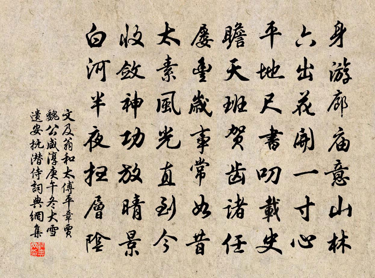 詩詞名句歷史字典書法欣賞書法字典國語詞典說文解字康熙字典古漢語字典標 題 作 者 詩 句 和太傅平章賈魏公鹹淳庚午冬大雪遺安撫潛侍作者:文及翁 朝代:宋代原文身遊廊廟意山林,六出花開一寸心。平地尺書叨載史,瞻天班賀齒諸任。屢豐歲事常如昔,太素風光直到今。收斂神功放晴景,白河半夜掃層陰。詩詞問答問:《和太傅平章賈魏公鹹淳庚午冬大雪遺安撫潛侍》的作者是誰?答:文及翁問:該詩寫於哪個朝代?答:宋代書法欣賞和太傅平章賈魏公鹹淳庚午冬大雪遺安撫潛侍書法作品詩文賞析【原題】:和太傅平章賈魏公鹹淳庚午冬大雪遺安撫潛侍郎詩詞推薦九日陪劉中丞宴昌樂寺送梁廷評朱放〔唐代〕獨坐三台妙,重陽百越間。水心觀遠俗,霜氣入秋山。不棄遺簪舊,寧辭落帽還。仍聞西上客,咫尺謁天顏。送侍御史四叔歸朝李嘉祐〔唐代〕淮南頻送別,臨水惜殘春。攀折隋宮柳,淹留秦地人。含情歸上國,論舊見平津。更接天津近,餘花映綬新。道情鄭燮〔清代〕老漁翁,一釣竿。靠山崖,傍水灣。扁舟來往無牽絆,沙鷗點點輕波遠,荻港瀟瀟白晝寒。高歌一曲斜陽晚,一霎三月一日府宴學射山陸游〔宋代〕北出升仙路少東,據鞍自笑老從戎。百年身世酣歌里,千古功名感慨中。天遠僅分山仿佛,霧收初見日曈曨。橫空再用韻三首裘萬頃〔宋代〕梨花月淡珠簾捲,柳絮風輕粉蝶飛。宮漏無聲窗欲曙,霓裳催舞廣寒妃。酬陳叔裕四首王炎〔宋代〕未能築室隱牆東,偶爾書名宦牒中。羅雀門空無俗物,騎鯨客至有仙風。刀頭雖折故鄉遠,錐末不營生理窮。意欲建隆以來祀享太廟十六首佚名〔宋代〕湯湯洪河,經啟長源。赤無嘉木,挺生本根。大哉崇基,出乎慶門。發祥垂裕,永世貽孫。朝天子·詠喇叭王磐〔明代〕喇叭,鎖吶,曲兒小腔兒大。官船來往亂如麻,全仗你抬聲價。(鎖吶 一作:嗩吶;聲價 一作:身價)軍聽了送孫舍人歸湘州梁陟〔唐代〕盛才傾世重,清論滿朝歸。作隼他年計,為鴛此日飛。比肩移日近,抗首出郊畿。為報清漳水,分明照錦衣。南樓令(題聚仙圖)張炎〔宋代〕曾記宴蓬壺。尋思認得無。醉歸來、事已模糊。忽對畫圖如夢寐,又因甚、下清都。拍手笑相呼。應書縮地符。恐山房秋日即事鄭清之〔宋代〕失驚牆外已飄黃,屈指秋來十日強。暑寇負頑猶出沒,風師未壯且翱翔。橘包捧腹微藏葉,桂蕾呈身只欠香。掃盡次韻奉答存道主簿黃庭堅〔宋代〕主簿朝衣如敗荷,高懷千尺上松蘿。旅人爭席方歸去,秋水黏天不自多。學到會時忘粲可,詩留別後見羊何。向來延福宮雙頭牡丹夏竦〔宋代〕禁蓹陽和異,華叢造化殊。兩宮方共治,雙花故聯跗。向日檀心並,承煙翠乾孤。游蜂須並翼,凝露亦駢珠。曉檻邊上晚秋杜牧〔唐代〕黑山南面更無州,馬放平沙夜不收。風送孤城臨晚角,一聲聲入客心愁。彥通以詩送石菖蒲,和謝之楊萬里〔宋代〕笑拂孤芳旋汲泉。忽如身墮曉霜天。一生寒瘦知何用,只得清名垂萬年。曉發齊州道中二首歐陽修〔宋代〕歲晚勞征役,三齊舊富閒。人行桑下路,日上海邊山。軒冕非吾志,風霜犯客顏。惟應思潁夢,先過穆陵關。寄吳信叟鄭剛中〔宋代〕聞說吳郎入漢中,掃除亭榭祝東風。三年不與故人醉,留取數枝桃杏紅。答張子立見寄蘇洵〔宋代〕舟行道里日夜殊,佳士恨不久與俱。峽山行盡見平楚,舍舡登岸身無虞。念君治所自有處,不復放縱如吾徒。憶昨荊軻刺秦王佚名〔兩漢〕秦將王翦破趙,虜趙王,盡收其地,進兵北略地,至燕南界。 太子丹恐懼,乃請荊卿曰:“秦兵旦暮渡易水,頌古釋道顏〔宋代〕掌中擎白日,舌上覆金錢。壁立爭千仞,毫光徹梵天。名句推薦若要人不知,除非己莫為。佚名《增廣賢文·上集》 香臉半開嬌旖旎。當庭際。玉人浴出新妝洗。李清照《漁家傲·雪裡已知春信至》 夜雨滴空階,孤館夢回,情緒蕭索。柳永《尾犯·夜雨滴空階》 朝騁騖兮江皋,夕弭節兮北渚;屈原《九歌》 如絲苣甲飣春盤,韭葉金黃雪未乾。張耒《春日·如絲苣甲飣春盤》 勿貪意外之財,勿飲過量之酒。朱柏廬《朱子家訓·全文》 起來無語理朝妝,寶匣鏡凝光顧敻《虞美人·觸簾風送景陽鍾》 春雪滿空來,觸處似花開。東方虬《春雪》 雷雨窈冥而未半,皦日籠光於綺寮。左思《三都賦》 非我而當者,吾師也;是我而當者,吾友也。荀子《荀子·修身》