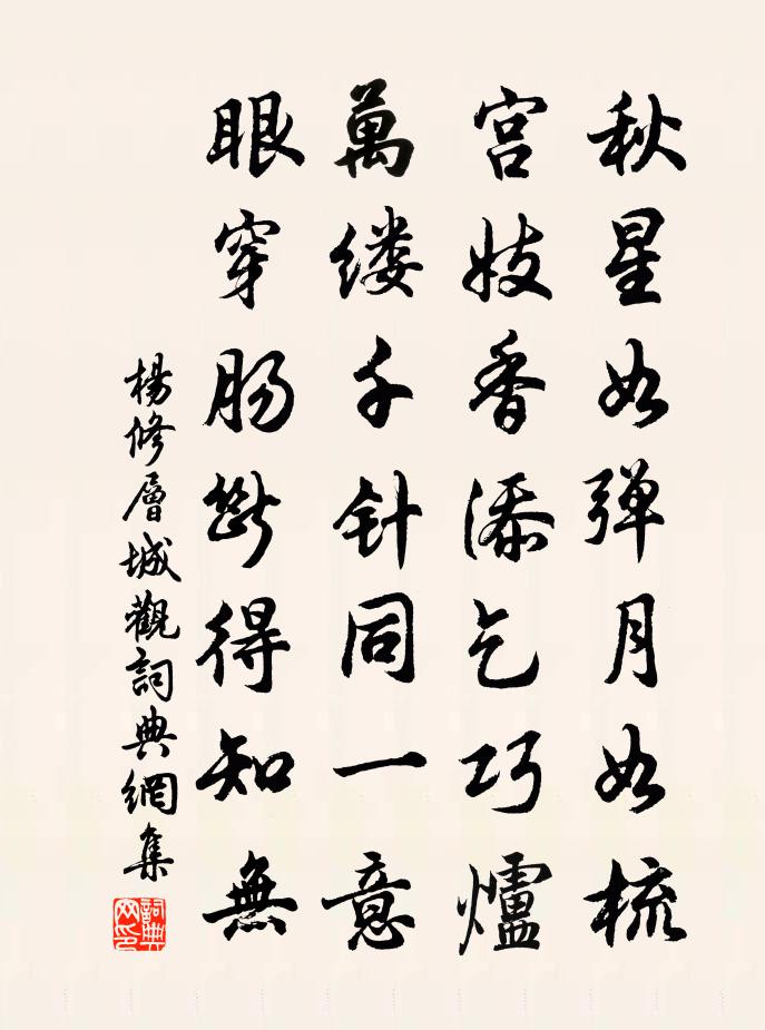 詩詞名句歷史字典書法欣賞書法字典國語詞典說文解字康熙字典古漢語字典標 題 作 者 詩 句 層城觀作者:楊修 朝代:宋代層城觀原文秋星如彈月如梳,宮妓香添乞巧爐。萬縷千針同一意,眼穿腸斷得知無。詩詞問答問:層城觀的作者是誰?答:楊修問:層城觀寫於哪個朝代?答:宋代楊修層城觀書法欣賞層城觀書法作品詩詞推薦興元府園亭雜詠北軒文同〔宋代〕天上之貴神,所居皆在北。有軒正相望,慢恐取陰劾。余常過則趨,不敢茲少息。次韻子瞻潁州留別二首蘇轍〔宋代〕託身遊宦鄉,終老羨箕潁。隱居亦何樂,親愛形隨影。念兄適吳越,霜降水初冷。翩然事舟楫,棄此室廬靜。平明傷時孟郊〔唐代〕常聞貧賤士之常,嗟爾富者莫相笑。男兒得路即榮名,邂逅失途成不調。古人結交而重義,今人結交而重利。勸人贈浮屠道本二首王之道〔宋代〕一去禪關忽五春,異鄉驚見眼終清。問師參學今何解,雲在青天水在瓶。過越釋斯植〔宋代〕渺渺天涯路,扁舟去不窮。水花隨岸盡,山影落江空。往事千年夢,漁歌一夜風。詩成唯有月,清致興誰同。阮郎歸張掄〔宋代〕炎天何處可登臨。須於物外尋。松風澗水雜清音。空山如弄琴。宜散發,稱披襟。都無煩暑侵。莫將城市比山林。折桂令·問秦淮孔尚任〔清代〕問秦淮舊日窗寮,破紙迎風,壞檻當潮,目斷魂消。當年粉黛,何處笙簫?罷燈船端陽不鬧,收酒旗重九無聊。白催老泉鑒井王洋〔宋代〕全師何日鑒新泉,澆滌塵埃是勝緣。恐為師無均濟力,長招官索欠租錢。題峻極下院列岫亭詩李廌〔宋代〕山色滿亭亭倚空,與君俱在畫圖中。解道龍騰青壁斷,令人卻憶漫浪翁。聞開江相國宋(一作宋相公申錫)下世二首杜牧〔唐代〕權門陰進奪移才,驛騎如星墮峽來。晁氏有恩忠作禍,賈生無罪直為災。貞魂誤向崇山沒,冤氣疑從湘水回。畢竟頃乾道辛卯歲三月望夜,與周子充內翰泛舟石范成大〔宋代〕石湖花月浮春空,憶共仙人同短篷。三更半醉吹笛去,棹入濕銀天鏡中。鶴鳴喚歸斗未沒,卻步扶疏花底月。不知頌古五十五首釋紹曇〔宋代〕雲鬢慵梳劣性多,逢人專要逞僂?。門前落節歸夸後,不柰斧斧咬齒何。鵲橋仙朱彝尊〔清代〕辛夷花落,海棠風起,朝雨一番新過。狸奴去後繡墩溫,且伴 * 長閒坐。笑言也得,欠伸也得,行處丹鞋婀娜。頌古二十一首釋正覺〔宋代〕無人接得渠,遺逼馬相如。果來橋上也,記得柱頭書。無人識得渠,棋局醉樵夫。回頭斧柯爛,大海亦成枯。荔枝送郭圓機戲作晁說之〔宋代〕禍根妃子嘗珍嗜,今日何須有荔枝。玉樹後庭那結實,也能亡國更堪悲。臨江仙(代閨怨)佚名〔宋代〕盪紫飄紅芳信斷,都無人間穠纖。吟鞭倚醉問涼蟾。香消金縷篆,壓壓寶妝奩。夢峽朝雲飛不到,一春離緒厭厭。寒食憶歸王建〔唐代〕京中曹局無多事,寒食貧兒要在家。遮莫杏園勝別處,亦須歸看傍村花。已亥雜詩 153龔自珍〔清代〕親朋歲月個蕭閒,情話 * 禮數刪。喜盡東華塵土否,一秋十日九湖山。荊南語佚名〔唐代〕旱不苦,禱而雨。雨不愁,公出遊。陳留道中賀鑄〔宋代〕強半春風掩戶庭,出門唯見麥青青。從來赤白歌桃李,曾與何人伴醉酲。名句推薦待到黃昏月上時,依舊柔腸斷。程垓《卜運算元·獨自上層樓》 別愁深夜雨,孤影小窗燈。陳克《臨江仙·四海十年兵不解》 三春已暮花從風,空留可憐與誰同。蕭衍《東飛伯勞歌》 孤舟向廣武,一鳥歸成皋。岑參《鞏北秋興寄崔明允》 生非貴之所能存,身非愛之所能厚;生亦非賤之所能夭,身亦非輕之所能薄。列子及其弟子《列子·力命》 故園渺何處,歸思方悠哉。韋應物《聞雁》 竹外一枝斜,想佳人,天寒日暮。曹組《驀山溪·梅》 簾外雨潺潺,春意闌珊。李煜《浪淘沙令·簾外雨潺潺》 離堂思琴瑟,別路繞山川。陳子昂《春夜別友人二首·其一》 桂林之一枝,崑山之片玉。房玄齡《晉書·列傳·第二十二章》