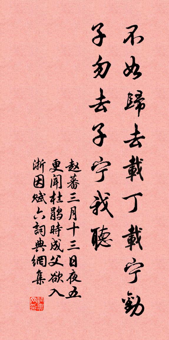 詩詞名句歷史字典書法欣賞書法字典國語詞典說文解字康熙字典古漢語字典標 題 作 者 詩 句 三月十三日夜五更聞杜鵑時成父欲入浙因賦六作者:趙蕃 朝代:宋代原文不如歸去,載丁載寧。勸子勿去,子寧我聽。詩詞問答問:《三月十三日夜五更聞杜鵑時成父欲入浙因賦六》的作者是誰?答:趙蕃問:該詩寫於哪個朝代?答:宋代書法欣賞三月十三日夜五更聞杜鵑時成父欲入浙因賦六書法作品詩文賞析【原題】:三月十三日夜五更聞杜鵑時成父欲入浙因賦六章章四句以送之詩詞推薦陋居一首蘇籀〔宋代〕平生瓮牖蔀茆菁,江左那無雨土寧。遊宦飄然紆幕燕,陋居粗有讀書螢。浮生佛腳須當抱,亂世儒衣便欲停。天定奉和隨王殿下詩 二謝朓〔南北朝〕星回夜未央。洞房凝遠情。雲蔭滿池樹。中月懸高城。喬木含風霧。行雁飛且鳴。平台盛文雅。西園富羣英。芳慶金陵陳月觀同年三首黎廷瑞〔宋代〕深衣社裡強婆娑,悞了東臯雨一蓑。麟也可為宣父泣,鳳兮須信接輿歌。懷金暫樂憂方大,投璧能全碎已多。此去書用師庵李昭述〔宋代〕架泉龕石搆幽棲,竹樹陰森鎖翠微。珍重支郎得高趣,一庵一榻自忘機。送同年楊元直持憲節湖南二首馮時行〔宋代〕天闊風高旆纛輕,江清沙白映揚舲。西岷峻極開文紀,南斗昭垂並使星。已見帆頭湖水白,猶看柂尾蜀山青。祗應緣識宋太宗〔宋代〕終朝煩惱謾相牽,卻是他非我自然。秪願蒼生添景福,康寧常得遇豐年。和李子儀到山居吳芾〔宋代〕接得新詩喜有餘,詩中字字說山居。固知還舍方為樂,亦悟浮名總是虛。無計林間閒放鶴,何時湖上靜觀魚。我心老人行王安石〔宋代〕老人低心逐年少,年少還為老人調。兩家挾詐自相欺,四海傷真誰復誚。翻手作雲覆手雨,當面輸心背面笑。古來依韻走筆和答徐無畏見招強至〔宋代〕憶初識面越庠時,餘教嘗蒙覺後知。早念兒童能刻賦,晚逢夫子許言詩。從容江介心方壯,蹭蹬京華鬢已衰。道舊句蔡卞〔宋代〕莫學飢鷹飽便飛。次韻馮圓中木犀六言史浩〔宋代〕碧玉鬧妝金粟,香隨煙霧橫斜。更欲移筇問訊,前山幾度雲遮。泛舟入前倉陳與義〔宋代〕曾鼓鹽田棹,前倉不足言。盡行江左路,初過浙東村。春去花無跡,潮歸岸有痕。百年都幾日,聊覆信乾坤。次韻行甫小集平山方岳〔宋代〕一片段預告飛不等閒,對花空手亦何顏。醉鄉別在乾坤外,詩社寧谷季孟間。妙句屢移青玉案,佳游仍隔小金山。只應酌第四橋水有懷陸羽周南〔宋代〕未必茶甌勝酒醒,且將衰發戴寒星。太湖西與松江接,不礙幽人第水經。寄謝晏尚書二絕歐陽修〔宋代〕送盡殘春始到家,主人愛客不須嗟。紅泥煮酒嘗青杏,猶向臨流藉落花。答中書詩謝靈運〔南北朝〕在昔先師。任誠師天。刻意豈高。江海非閒。守道順性。樂茲丘園。偕友之唱。敬悅在篇。霜露荏苒。日月如捐。贈琵琶妓李群玉〔唐代〕我見鴛鴦飛水上,君還望月苦相思。一雙裙帶同心結,早寄黃鸝孤雁兒。寄遠馬戴〔唐代〕坐想親愛遠,行嗟天地闊。積疹甘毀顏,沉憂更銷骨。迢迢遊子心,望望歸雲沒。喬木非故里,高樓共明月。夜深寄子虡陸游〔宋代〕老自安故鄉,況復觸罪罟;五年三奉祠,每請幸聽許。貧家似破屋,隨事且撐拄,雖殊乞墦肉,已近掘野鼠。平生蜆子贊釋普度〔宋代〕不釣鯨鰲只撈蜆,得此滋味興偏佳。拈來塞斷娘生口,一段幾光屬當家。名句推薦苕之華,其葉青青。佚名《苕之華》 窈窕淑女,君子好逑。佚名《關雎》 欲把西湖比西子,淡妝濃抹總相宜。蘇軾《飲湖上初晴後雨二首·其二》 空將漢月出宮門,憶君清淚如鉛水。李賀《金銅仙人辭漢歌》 閒坐悲君亦自悲,百年多是幾多時。元稹《遣悲懷三首·其三》 委肉當餓虎之蹊,禍必不振矣!劉向《戰國策·燕三·燕太子丹質於秦亡歸》 果仁者,人多畏,言不諱,色不媚。李毓秀《弟子規·親仁》 多情卻被無情惱,今夜還如昨夜長。元好問《鷓鴣天·候館燈昏雨送涼》 狡兔死,走狗烹;飛鳥盡,良弓藏;敵國破,謀臣亡。司馬光《資治通鑑·漢紀三》 窮巷多怪,曲學多辯。商鞅《商君書·更法》
