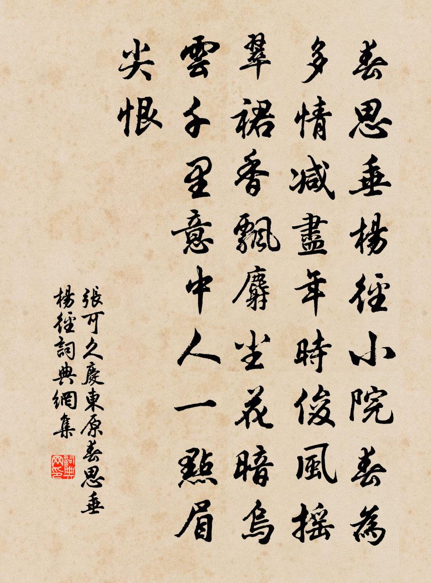 垂楊徑,小院春,為多情減盡年時俊。風搖翠裙,香飄麝塵,花暗烏雲。千里意中人,一點眉尖恨。
