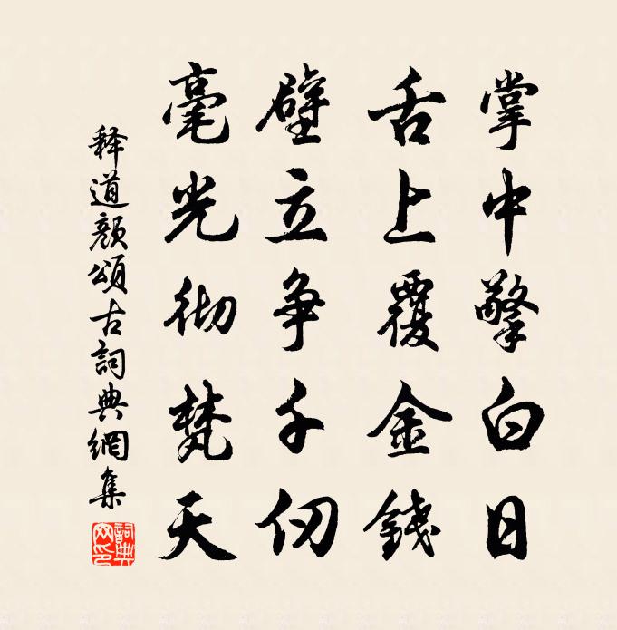 詩詞名句歷史字典書法欣賞書法字典國語詞典說文解字康熙字典古漢語字典標 題 作 者 詩 句 頌古作者:釋道顏 朝代:宋代頌古原文掌中擎白日,舌上覆金錢。壁立爭千仞,毫光徹梵天。詩詞問答問:頌古的作者是誰?答:釋道顏問:頌古寫於哪個朝代?答:宋代釋道顏頌古書法欣賞頌古書法作品詩詞推薦贈徐相士袁說友〔宋代〕欲歸公未許身閒,欲外云云去亦難。我意公言兩矛盾,料公猶作世情看。浣溪沙(榮國生日四首·四之一)張綱〔宋代〕羅綺爭春擁畫堂。翠帷深處按笙簧。寶奩頻炷郁沈香。海上蟠桃元未老,月中仙桂看餘芳。何須龜鶴頌年長。送羽林陶將軍李白〔唐代〕將軍出使擁樓船,江上旌旗拂紫煙。萬里橫戈探虎穴,三杯拔劍舞龍泉。莫道詞人無膽氣,臨行將贈繞朝鞭。鷓鴣天(深秋悲感)趙長卿〔宋代〕亭樹蕭蕭生暮涼。安排清夢到胡床。楚山楚水秋江外,江北江南客恨長。苹渚冷,橘汀黃。斷魂殘夢更斜陽。欲將上知府袁刑部魏野〔宋代〕星辰雖應碧虛中,富貴情疏道氣融。遠野雲煙陪淡薄,入衙山水學清通。申湖靜泛孤舟月,棠樹涼生一扇風。卻有寄漢上友人黃滔〔唐代〕襄漢多清景,東遊已不能。蒹葭照流水,風雨撲孤燈。獻賦聞新雁,思山見去僧。知君北來日,惆悵亦難勝。風流子仇遠〔宋代〕紅錦舊同心。西池上、曾與系青禽。記山水寫情,秋桐促軫,鴛鴦縈恨,春繡停針。常嘆好風妨畫扇,明月墮瑤簪偈頌一百二十三首釋普度〔宋代〕寶塔層層面面開,當機一拶語如雷。信知恩大難酬處,一段風光遍九垓。新愁晁說之〔宋代〕宿悵故難遣,新愁豈易安。囷空鼠號擲,庭靜鳥喑寒。月盛中秋色,人虧上國歡。灣頭十二衛,泣涕乞同鑾。偈頌七首釋思岳〔宋代〕誰道霜風只一般,今年寒勝去年寒。夜來得個真訊息,無限鮎魚上竹竿。夢覺戴表元〔宋代〕夢覺依然一草寮,浮蹤已慣任飄搖。虛檐明氣生朝露,遠樹寒聲過夜潮。白骨又驚山下滿,朱顏剛向客不消。時平再次韻十首陳造〔宋代〕重見發更白,羈棲偕在行。余嗟遽如許,子亦可憐生。不粒書新券,霜蔬煮破鐺。詩成莫浪出,或取世儒輕。大江東去 離豫章舟泊吳城山下作王旭〔元代〕南遊三載,只江山、不負中原詩客。萬里行裝無別物,滿意風雲泉石。牛斗星邊,靈槎縹緲,鬢影銀河濕。哀歌誰水調歌頭張孝祥〔宋代〕天上掌綸手,閫外折衝才。發蹤指示,平盪全楚息氛埃。緩帶輕裘多暇,燕寢森嚴兵衛,香篆幾徘徊。襦絝見歌詠中山釋心月〔宋代〕英標拔俗一千丈,壁立孤危不可攀。南北東西徒斫額,誰知步步在其間。隴頭水徐陵〔南北朝〕別塗聳千仞。離川懸百丈。攢荊夏不通。積雪冬難上。枝交隴底暗。石礙波前響。回首鹹陽中。唯言夢時往。次韻致遠自毘陵見寄范成大〔宋代〕黃鵠高飛碧落寒,向來山水夢驚殘。故情若問玄真子,依舊江頭把釣竿。聞查建州陷賊寄鍾郎中(謨即查從事也)徐鉉〔唐代〕聞道將軍輕壯圖,螺江城下委犀渠。旌旗零落沉荒服,簪履蕭條返故居。皓首應全蘇武節,故人誰得李陵書。自憐相和歌辭。子夜春歌王翰〔唐代〕春氣滿林香,春遊不可忘。落花吹欲盡,垂柳折還長。桑女淮南曲,金鞍塞北裝。行行小垂手,日暮渭川陽。真娘墓楊備〔宋代〕冰肌玉骨有遺妍,粉作嬌雲黛作煙。知有香魂埋不得,夜深岩底月中仙。名句推薦君子不動而敬,不言而信。子思《中庸·第三十三章》 東風吹雨過青山,卻望千門草色閒。盧綸《長安春望》 女為君子儒,無為小人儒。孔子弟子《論語·雍也篇》 荷葉五寸荷花嬌,貼波不礙畫船搖;石濤《荷花》 涕零雨面毀形顏,誰能懷憂獨不嘆。曹丕《燕歌行二首·其二》 此身如傳舍,何處是吾鄉。蘇軾《臨江仙·送王緘》 南軒有孤松,柯葉自綿冪。李白《南軒松》 黯然銷魂者,唯別而已矣!江淹《別賦》 細看茱萸一笑,詩翁健似常年。張可久《風入松·九日》 西湖又還春晚,水樹亂鶯啼。仲殊《訴衷情·寶月山作》