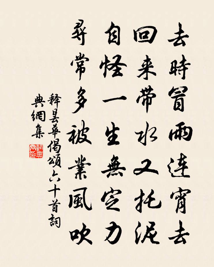 詩詞名句歷史字典書法欣賞書法字典國語詞典說文解字康熙字典古漢語字典標 題 作 者 詩 句 偈頌六十首作者:釋曇華 朝代:宋代偈頌六十首原文去時冒雨連宵去,回來帶水又托泥。自怪一生無定力,尋常多被業風吹。詩詞問答問:偈頌六十首的作者是誰?答:釋曇華問:偈頌六十首寫於哪個朝代?答:宋代釋曇華偈頌六十首書法欣賞偈頌六十首書法作品詩詞推薦華亭百詠鳳皇山許尚〔宋代〕覽德來何代,慵歸丹穴藏。甘心化為石,萬歲瑞吾皇。和趙茂州即事六首郭印〔宋代〕前世愚夫哂鄧通,即山鼓鑄死飢窮。貪名勿羨青雲士,守道甘為白髮翁。日月賓士駒過隙,乾坤跼蹐鳥居籠。反觀石頭懷古黃文雷〔宋代〕長江日浩浩,跂予望淮南。禹畫足廣輪,王氣分餚函。朝市一以建,蟠踞誠匪慚。中躔胡塵悲,六龍此停驂。衣冠減字木蘭花李之儀〔宋代〕莫非魔境。強向中間談獨醒。一葉才飛。便覺年華太半歸。醉雲可矣。認著依前還不是。虛過今春。有愧斜川得意頌古十一首釋普濟〔宋代〕臘月火燒山,胡僧入漢關。一頭卷螺發,兩耳帶金環。太常引(壽南澗)辛棄疾〔宋代〕君王著意履聲間。便令押、紫宸班。今代又尊韓。道吏部、文章泰山。一杯千歲,問公何事,早伴赤松閒。功業後憶昔陸游〔宋代〕憶昔從戎出渭濱,壼漿馬道泣遺民。夜棲高冢占星象,晝上巢車望虜塵。共道功名方迫逐,豈知老病只逡巡。燈前鍾慶飲別葛紹體〔宋代〕日添一線酒壺邊,小閣連裝勝去年。明夜月生何處有,短帆風定下塘船。王主簿右州某日思其歸因見黃華動淵明之興方陳宓〔宋代〕靜坐思君秋日長,清波白鷺兩茫茫。定應嚼遍湘纍菊,寄我新詩字字香。別昭平鄒浩〔宋代〕江山本無情,別去亦何語。向來爽氣中,食息三月許。平非吾所求,去非吾所御。回首謝江山,吾今若輕舉。送潭州陳運使二首項安世〔宋代〕惜分頻卜夜,此意我知公。古事多疑信,今人足異同。何年操棐幾,三月坐春風。但記匆匆字,深題大帶中。昭君怨(題春波獨載圖)高觀國〔宋代〕一棹莫愁煙艇。飛破玉壺清影。水濺粉綃寒。渺雲鬟。不肯凌波微步。卻載春愁歸去。風澹楚魂驚。隔瑤京。漁父詞宋高宗〔宋代〕遠水無涯山有鄰,相看歲晚更情親。笛里月,酒中身,舉頭無我一般人。挽商元鼎喻良能〔宋代〕舉世方貪祿,斯人只自怡。一官如涕唾,半世足遨嬉。心地陂千頃,生涯灑一卮。唯應郭有道,吾不愧為碑。雲岩寺二首張縯〔宋代〕棟宇何年有,雲岩擁樹深。山僧傳舊險,詩者有行吟。雲影侵巾屨,江聲送古今。荔枝何用數,撫字每勞心。賦月中佳陳深〔宋代〕天上何年種,婆娑碧樹幽。根盤蟾窟古,花落驚峰秋。只恐冰輪礙,時煩玉斧修。素娥久延儜,攀折使人愁。即事二首陳杰〔宋代〕慶曆殘碑倦復看,斯文豈是為游觀。一番棟宇開荒礎,萬古青螺點玉盤。鳥度雲移人事換,天高地大客愁寬。六絲送唐介謫英州徐九思〔宋代〕投荒萬里嶺南行,莫叩天閽訴不平。忠讜若教無竄逐,奸邪何計竊安榮。一封疏在銘周鼎,三黜名高重漢京。最是送李仁甫運判赴召三首李流謙〔宋代〕瞿塘六月浪,如馬亦安流。舟楫魚龍喜,藜蒿虎豹憂。低回嗟薄宦,慷慨動商謳。門戶今如線,非為粱稻謀。五和劉克莊〔宋代〕出門機阱已相隨,竟放靈均逐伯奇。始者齧膚微似蚋,俄然擇肉及於羆。不言快箭穿楊葉,卻訝長松托兔絲。敗壞名句推薦眼前直下三千字,胸次全無一點塵。于謙《觀書》 何時詔此金錢會,暫醉佳人錦瑟旁。杜甫《曲江對雨》 洊雷,震;君子以恐懼修省。佚名《易傳·象傳下·震》 江山如畫,一時多少豪傑蘇軾《念奴嬌·赤壁懷古》 蘭帳玉人睡覺,怪春衣、雪沾瓊綴。章楶《水龍吟·燕忙鶯懶芳殘》 燕燕輕盈,鶯鶯嬌軟,分明又向華胥見。姜夔《踏莎行·自沔東來丁未元日至金陵江上感夢而作》 桃花春水淥,水上鴛鴦浴。韋莊《菩薩蠻》 自春來、慘綠愁紅,芳心是事可可。柳永《定風波·自春來》 亂點鴛鴦譜馮夢龍《醒世恆言·卷八》 無計奈情何,且醉金杯酒。晏幾道《生查子·輕勻兩臉花》