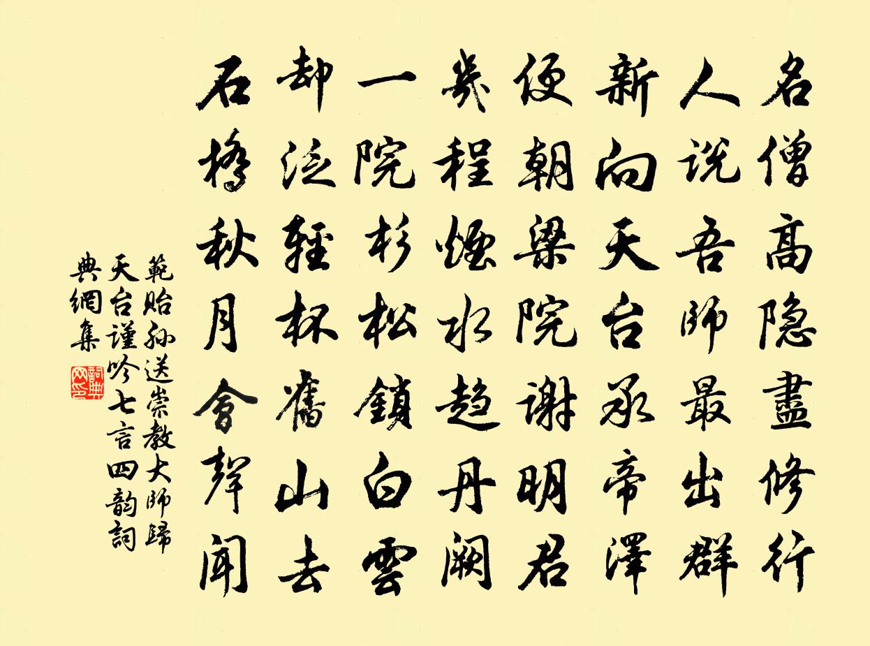 詩詞名句歷史字典書法欣賞書法字典國語詞典說文解字康熙字典古漢語字典標 題 作 者 詩 句 送崇教大師歸天台謹吟七言四韻作者:范貽孫 朝代:宋代原文名僧高隱盡修行,人說吾師最出群。新向天台承帝澤,便朝梁院謝明君。幾程煙水趨丹闕,一院杉松鎖白雲。卻泛輕杯舊山去,石橋秋月會聲聞。詩詞問答問:《送崇教大師歸天台謹吟七言四韻》的作者是誰?答:范貽孫問:該詩寫於哪個朝代?答:宋代書法欣賞送崇教大師歸天台謹吟七言四韻書法作品詩詞推薦同友人宿山院釋智圓〔宋代〕共依清境宿,話道復論文。潭月秋深見,山鍾夜後聞。蟲聲深古砌,螢影沒殘雲。會約長棲此,爐香樹下梵。賢者之孝二百四十首王裒林同〔宋代〕悲哉生我句,柰此念親何。墓側有枯樹,詩中無蓼莪。木犀四首趙蕃〔宋代〕細看秋露黃金蕊,不減春風白玉枝。人道江南富山水,江南山水富於斯。贈江油尉李白〔唐代〕嵐光深院裡,傍砌水泠泠。野燕巢官舍。溪雲入古廳。日斜孤吏過,簾卷亂峯青。五色神仙尉,焚香讀道經。連日大雪獨坐有感虞儔〔宋代〕呼得蒼頭數橐金,旋沽村酒過牆陰。焦琴不鼓知音斷,凍筆頻呵作意吟。擾擾漫天空眩目,看看出日為寒心。憑君和博古直五首蒲壽宬〔宋代〕曠茲歷億劫,矧此浮雲身。桑樞弗言病,駟馬休笑貧。棲棲魯中叟,救世誠艱辛。鳥獸豈同群,由也徒問津。人世將謁延廬州行至板橋忽病而止復還建康以五詩趙蕃〔宋代〕數載炎州不慣寒,並江已怯瘦欒欒。舊識淮南今更老,絕知於此亦良難。仲弟應符用黎齪齪詩韻作咄咄篇自警家大人用孫應求〔宋代〕皦皦志士心,玉壺冰露寒。整冠默危坐,撫卷慨永嘆。膠擾天下事,豈逃吾靜觀。是心本如水,風過成濤瀾。蟻或奉使宛陵別二三從事羅隱〔唐代〕梁王雪裡有深知,偶別家鄉隔路岐。官品共傳勝曩日,酒杯爭肯忍當時。豫章地暖矜千尺,越嶠天寒愧一枝。還有奉和魯望漁具十五詠釣車皮日休〔唐代〕得樂湖海志,不厭華輈小。月中拋一聲,驚起灘上鳥。心將潭底測,手把波文裊。何處覓奔車,平波今渺渺。次韻范才元中秋夜蘇籀〔宋代〕常娥偕婺女,萬里玉京會。雲璈闋未終,莫靄黯愁對,真人一謦欬,開闔隨霽晦。寒波揚廣廷,清光一年最。頃刻二月十七夜與諸弟小酌嘗榧實誤食烏喙烏喙堇周必大〔宋代〕伏神老芋不傷生,江蠏蟛蜞禍亦輕。我獨好奇嘗酒堇,誤思榧實殺三彭。天目山逸人居釋文珦〔宋代〕隱處元無路,煙霞素所期。不逢樵子說,那有世人知。樹老回春晚,山高見日遲。欲為重到約,恐爾又深移。一落索王灼〔宋代〕昨夜封枝寒雪。暗堆殘葉。佳人醉里插釵梁,更不問、眠時節。繡被重重夜徹。燭光明滅。枕旁爭聽落檐聲,更不西河·和王潛齋韻曹豳〔宋代〕今日事。何人弄得如此。漫漫白骨蔽川原,恨何日已。關河萬里寂無煙,月明空照蘆葦。 謾哀痛,無及矣。無情【雙調】喬牌兒關漢卿〔元代〕世情推物理,人生貴適意。想人間造物搬興廢,吉藏凶,凶暗吉。【夜行船】富貴那能長富貴,日盈昃月滿虧蝕。扇子詩李石〔宋代〕機鋒相拄不爭多,父舞三台子唱歌。若問一時同啐啄,菩提般若六波羅。舟過望亭三首楊萬里〔宋代〕雨罷風回花柳晴,忽然數點打窗聲。游蜂誤入船窗里,飛去飛來總是情。懷古呈通守鄭定齋王柏〔宋代〕南方有良藥,神妙難具寫。沉疴一刀圭,無不立愈者。性烈必瞑眩,色惡如土苴。倉公一見之,寶愛不忍舍。踏莎行杜安世〔宋代〕雨霽風光,春分天氣。千花百草爭明媚。畫梁新燕一雙雙,玉籠鸚鵡愛孤睡。薜荔依牆,莓苔滿地。青樓幾處歌聲名句推薦倍道而妄行,則天不能使之吉。荀子《荀子·天論》 搴帷拜母河梁去,白髮愁看淚眼枯。黃景仁《別老母》 但信己,不信人,此取敗之由也。王永彬《圍爐夜話·第八五則》 重足而立,側目而視。司馬遷《史記·汲鄭列傳》 春欲盡,日遲遲,牡丹時歐陽炯《三字令·春欲盡》 雲白山青萬餘里,愁看直北是長安杜甫《小寒食舟中作》 封侯非我意,但願海波平。戚繼光《韜鈐深處》 九日龍山飲,黃花笑逐臣。李白《九日龍山飲》 禍福無門,唯人所召。左丘明《左傳·襄公·襄公二十三年》 聽於無聲,視於無形。戴聖《禮記·曲禮上》