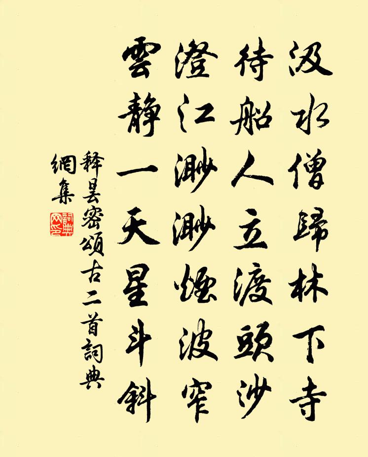 詩詞名句歷史字典書法欣賞書法字典國語詞典說文解字康熙字典古漢語字典標 題 作 者 詩 句 頌古二首作者:釋曇密 朝代:宋代頌古二首原文汲水僧歸林下寺,待船人立渡頭沙。澄江渺渺煙波窄,雲靜一天星斗斜。詩詞問答問:頌古二首的作者是誰?答:釋曇密問:頌古二首寫於哪個朝代?答:宋代釋曇密頌古二首書法欣賞頌古二首書法作品詩詞推薦孟門行崔顥〔唐代〕黃雀銜黃花,翩翩傍檐隙。本擬報君恩,如何反彈射。金罍美酒滿座春,平原愛才多眾賓。滿堂儘是忠義士,何意雨犯吟邵雍〔宋代〕這般事業人難繼,此個功夫世莫傳。窺牖知天乃常事,不窺牖見是知天。眼兒媚·遲遲春日弄輕朱淑真〔宋代〕遲遲春日弄輕柔,花徑暗香流。清明過了,不堪回首,雲鎖朱樓。午窗睡起鶯聲巧,何處喚春愁。綠楊影里,海棠賀筵占贈營妓楊汝士〔唐代〕郎君得意及青春,蜀國將軍又不貧。一曲高歌紅一匹,兩頭娘子謝夫人。孔周翰輓詞三首孔武仲〔宋代〕晚歲班朝列,光華動士林。家風當冠豸,官序正腰金。霄漢亨衢淺,膏肓積沴深。淒涼哭門館,笑語尚餘音。李貳車約飲東湖程公許〔宋代〕西湖繞遍又東湖,永夜論文酒淺{奭斗}。最愛霜林梅蘸水,擬撐小艇訪林逋。與詩友會宿寇準〔宋代〕此夕南軒宿,論詩萬慮忘。苦吟秋信近,寂坐漏聲長。室靜燈光暗,桐疏露氣涼。幽懷聊自遣,山色漸蒼蒼。吊草堂禪師劉得仁〔唐代〕杖履疑師在,房關四壁蛩。貯瓶經臘水,響塔隔山鍾。乳鴿沿苔井,齋猿散雪峰。如何不相見,倚遍寺前松。寄題喻叔奇國傅郎中園亭二十六詠水簾楊萬里〔宋代〕秧疇水落荇渠尖,玉石當中碧一奩。石面平鋪波面皺,千花織出水精簾。欹枕鄭谷〔唐代〕欹枕高眠日午春,酒酣睡足最閒身。明朝會得窮通理,未必輸他馬上人。望海潮(四之一)秦觀〔宋代〕星分牛斗,疆連淮海,揚州萬井提封。花發路香,鶯啼人起,珠簾十里東風。豪俊氣如虹。曳照春金紫,飛蓋相從鴛鴦湖棹歌 之二十六朱彝尊〔清代〕梅花小閣兩重階,屈戍屏風六扇排。不及張銅爐在地,三冬長暖牡丹鞋。贈正仲別舒岳祥〔宋代〕一年三過我,此去定經年。雪壓登魚渚,雲生落雁田。壯遊今已矣,老別自潸然。心事有難說,斯文屬子傳。沁園春(和伍子嚴避暑二首)趙師俠〔宋代〕雨接梅霖,風祛槐暑,麥天已秋。正榴燃紅炬,枝頭色艷,荷翻綠蓋,池面香浮。心景俱清,身名何有,且向忙中秦門趙高周曇〔唐代〕趙高胡亥速天誅,率土興兵怨毒。豐沛見機群小吏,功成兒戲亦何殊。宿丁學士宅朱嚴希畫不至釋宇昭〔宋代〕幽期不可見,牢落望君情。坐久詩源寂,談餘井浪平。月依寒木盡,蛩背冷燈鳴。空聽溝西寺,宵鍾出禁清。南歌子陳克〔宋代〕愛日烘晴晝,輕寒護曉霜。小春庭院繞天香。仙風珊珊來自、五雲鄉。庭下芝蘭秀,壺中日月長。要看發綠與瞳方雜感陸游〔宋代〕艱危寧度瘦驢嶺,奔走莫隨肥馬麈。困厄終身元自好,可憐痴子恨無津。禪人並化主寫真求贊釋正覺〔宋代〕口闊鼻隆,神靜心空。雪蘆岸稜遠,水天秋色同。夜寒北斗垂金柄,月落西山藏玉弓。真機宛轉,幻住圓融。古佛宮詞王仲修〔宋代〕囹圄空虛入頌歌,雪霜風雨四時和。君王德惠施天下,甘露偏於柳上多。名句推薦晚來風起花如雪,飛入宮牆不見人。劉禹錫《楊柳枝詞九首》 念歸林葉換,愁坐露華生。張九齡《西江夜行》 細草微風岸,危檣獨夜舟。杜甫《旅夜書懷》 明月松間照,清泉石上流。王維《山居秋暝》 能親仁,無限好,德日進,過日少。李毓秀《弟子規·親仁》 玄都觀里桃千樹,儘是劉郎去後栽。劉禹錫《元和十年自朗州至京戲贈看花諸君子 / 玄都觀桃花》 輕陰池館水平橋,一番弄雨花梢。陳子龍《畫堂春·雨中杏花》 但愁敲桂棹,悲吟梁父,淚流如雨。朱敦儒《水龍吟·放船千里凌波去》 門前行樂客,白馬嘶春色。牛嶠《菩薩蠻·風簾燕舞鶯啼柳》 桃花春色暖先開,明媚誰人不看來。周朴《桃花》