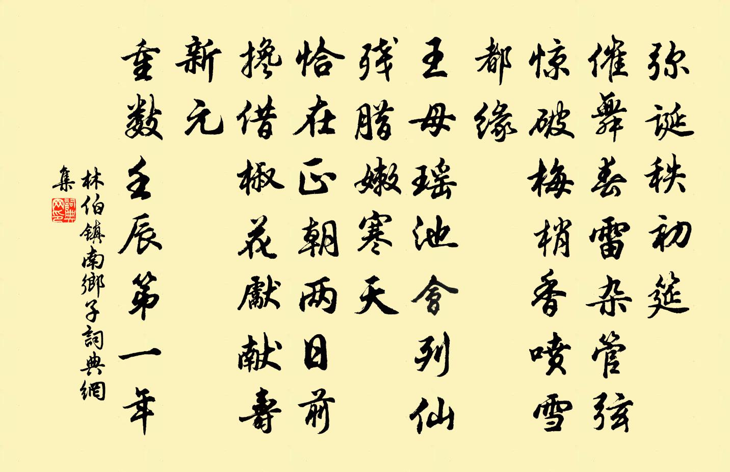 詩詞名句歷史字典書法欣賞書法字典國語詞典說文解字康熙字典古漢語字典標 題 作 者 詩 句 南鄉子作者:林伯鎮 朝代:宋代南鄉子原文彌誕秩初筵。催舞春雷雜管弦。驚破梅梢香噴雪,都緣。王母瑤池會列仙。殘臘嫩寒天。恰在正朝兩日前。攙借椒花先獻壽,新元。重數壬辰第一年。詩詞問答問:南鄉子的作者是誰?答:林伯鎮問:南鄉子寫於哪個朝代?答:宋代問:南鄉子是什麼體裁?答:詞林伯鎮南鄉子書法欣賞南鄉子書法作品詩詞推薦又賦如山姜特立〔宋代〕如山堂上好登臨,羅列堂前紫翠岑。萬古煙霞供坐嘯,四時風月伴閒吟。海鷗心性滄洲遠,野鹿精神草樹深。卻笑七月二十八日夜與王鄭二秀才聽雨後夢作李商隱〔唐代〕初夢龍宮寶焰然,瑞霞明麗滿晴天。旋成醉倚蓬萊樹,有個仙人拍我肩。少頃遠聞吹細管,聞聲不見隔飛煙。逡巡句釋文禮〔宋代〕施為動靜憑誰力。偈頌七十八首釋正覺〔宋代〕寒岩異草,坐著成功。明月白雲,步時分影。幽洞不拘關鎖意,縱橫那涉兩頭人。三月二十日詔宴樂遊園賦得風字張說〔唐代〕樂游形勝地,表里望郊宮。北闕連天頂,南山對掌中。皇恩貸芳月,旬宴美成功。魚戲芙蓉水,鶯啼楊柳風。春光望海樓晚景五絕蘇軾〔宋代〕海上濤頭一線來,樓前相顧雪成堆。從今潮上君須上,更看銀山二十回。橫風吹雨入樓斜,壯觀應須好句夸。雨過和邵堯夫韻示兒侄王洋〔宋代〕言貴安徐行貴常,與人平淡勿相傷。莫貪順路行時快,到了回思見去長。克己定知天降福,害人只是自貽殃。長教漁家傲晏殊〔宋代〕臉傅朝霞衣剪翠。重重占斷秋江水。一曲採蓮風細細。人未醉。鴛鴦不合驚飛起。欲摘嫩條嫌綠刺。閒敲畫扇偷金清漪潭陳岩〔宋代〕水出雙溪似鏡平,縈迴遇石自成文。眼明波上誰相對,只有飛來白鷺鮮。早發平昌(一作昌平)島沈佺期〔唐代〕解纜春風后,鳴榔曉漲前。陽烏出海樹,雲雁下江煙。積氣沖長島,浮光溢大川。不能懷魏闕,心賞獨泠然。漢宮春(次韻稼軒蓬萊閣)姜夔〔宋代〕一顧傾吳。薴蘿人不見,煙杳重湖。當時事如對弈,此亦天乎。大夫仙去,笑人間、千古須臾。有倦客、扁舟夜泛匡山居尚顏〔唐代〕無才加性拙,道理合藏蹤。是處非深遠,其山已萬重。經時鄰境戰,獨夜隔雲舂。昨日泉中見,常魚亦化龍。邛州俯聽三省堂文同〔宋代〕將欲言治人,必先由正身。身正人自治,此化行如神。總總群聖書,論說尤諄諄。後賢守為法,不敢忘逡巡。有欲縣齋秋晚酬友人朱瓚見寄羅隱〔唐代〕中和節後捧瓊瑰,坐讀行吟數月來。只嘆雕龍方擅價,不知赬尾竟空回。千枝白露陶潛柳,百尺黃金郭隗台。惆悵月杜甫〔唐代〕天上秋期近,人間月影清。入河蟾不沒,搗藥兔長生。只益丹心苦,能添白髮明。干戈知滿地,休照國西營。和黃門盧侍御詠竹張九齡〔唐代〕清切紫庭垂,葳蕤防露枝。色無玄月變,聲有惠風吹。高節人相重,虛心世所知。鳳凰佳可食,一去一來儀。己卯十月五日予入燕獄今三十有六旬感興一首文天祥〔宋代〕石晉舊燕趙,鍾儀新楚囚。山河千古痛,風雨一年周。過雁催人老,寒花送客愁。捲簾雲滿座,抱膝意悠悠。齊雲寺張至龍〔宋代〕雨疎分點下,略彴界橫塘。接竹通生水,搴蘿補壞牆。字塗窗眼黑,香染佛衣黃。未晚螢先出,蕭然兩畫廊。汀州第六十五文天祥〔宋代〕雷霆走業銳,斧鉞下青冥。江城今夜客,慘澹飛雲汀。留別道州李使君圻戴叔倫〔唐代〕瀧路下丹徼,郵童揮畫橈。山回千騎隱,雲斷兩鄉遙。漁滬擁寒溜,畲田落遠燒。維舟更相憶,惆悵坐空宵。名句推薦林表明霽色,城中增暮寒。祖詠《終南望余雪》 眺聽良多感,徙倚獨沾襟。李密《淮陽感秋》 傷心秦漢經行處,宮闕萬間都做了土。張養浩《山坡羊·潼關懷古》 語言多矯飾,則人品心術,盡屬可疑。王永彬《圍爐夜話·第四十則》 欲知卻老延齡藥,百草摧時始起花。蘇軾《趙昌寒菊》 良辰當五日,偕老祝千年。權德輿《端午日禮部宿齋有衣服彩結之貺以詩還答》 憶昔霍將軍,連年此征討。高適《登百丈峰二首》 蘭舟斜纜垂揚下,只宜輔枕簟向涼亭披襟散發。白樸《得勝樂·夏》 琴里知聞唯淥水,茶中故舊是蒙山。白居易《琴茶》 君子必在己者,不必在人者也。呂不韋《呂氏春秋·覽·孝行覽》