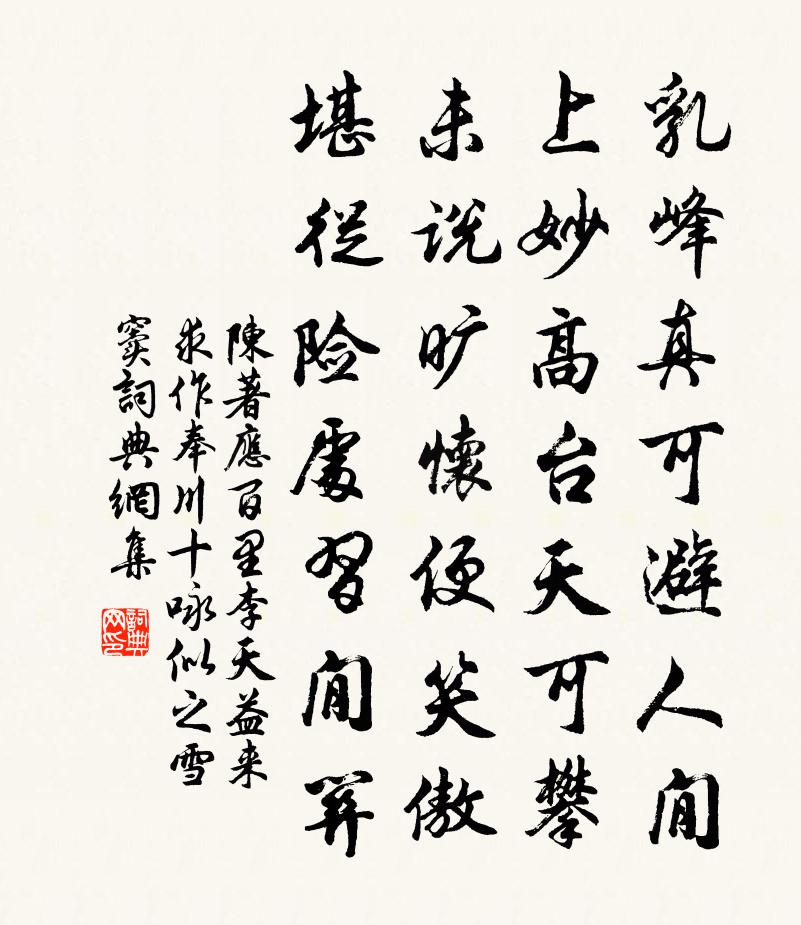 詩詞名句歷史字典書法欣賞書法字典國語詞典說文解字康熙字典古漢語字典標 題 作 者 詩 句 應百里李天益來求作奉川十詠似之雪竇作者:陳著 朝代:宋代原文乳峰真可避人閒,上妙高台天可攀。未說曠懷便笑傲,堪從險處習閒關。詩詞問答問:《應百里李天益來求作奉川十詠似之雪竇》的作者是誰?答:陳著問:該詩寫於哪個朝代?答:宋代書法欣賞應百里李天益來求作奉川十詠似之雪竇書法作品詩詞推薦步蟾宮汪存〔宋代〕玉京此去春猶淺。正雪絮、馬頭零亂。姮娥剪就綠雲裳,待來步蟾宮與換。明年二月桃花岸。棹雙漿、浪平煙暖。春日書事呈歷陽縣蘇仁仲八首王之道〔宋代〕公餘槐柳轉斜日,吏散鳥雀來空庭。康成書帶可人意,坐見茸茸相對青。卜運算元佚名〔宋代〕欲把愁分付。留題景升北窗晁說之〔宋代〕南樓吹笛何人怨,北窗垂楊永日閒。何用綠楊高百尺,詩情筆趣總相關。和王少卿十日與留台國子監崇崇福宮諸官赴王司馬光〔宋代〕儒衣武弁聚華軒,儘是西都冷落官。莫嘆黃花過嘉節,且將素髮共清歡。紅牙板急弦聲咽,白玉舟橫酒量寬。青眼謫居海上熊皦〔唐代〕家臨涇水隔秦川,來往關河路八千。堪恨此身何處老,始皇橋畔又經年。句彭景行〔宋代〕深愛城西向氏園,平川秀野好風煙。春盤陳宓〔宋代〕清晨採擷南山麓,金刀細細裁青縠。素盤恰辦飢雷鳴,飽覺春陽滿枯腹。我生頭頷非虎燕,未許嚌胾薄野蔌。從今別雲間夏完淳〔明代〕三年羈旅客,今日又南冠。無限山河淚,誰言天地寬!已知泉路近,欲別故鄉難。毅魄歸來日,靈旗空際看。江神子·賦梅寄余叔良辛棄疾〔宋代〕暗香橫路雪垂垂。晚風吹。曉風吹。花意爭春,先出歲寒枝。畢竟一年春事了,緣太早,卻成遲。未應全是雪霜姿偈傾一百六十九首釋智朋〔宋代〕護生殺生,遍界刀鑰。柏山結也如常,解也如常。如常恰似秋風至,無意涼人人自涼。水調歌頭(似之、申伯、叔陽皆作,再次前韻)李綱〔宋代〕物我本虛幻,世事若俳諧。功名富貴,當得須是個般才。幸有山林雲水,造物端如有意,分付與吾儕。寄語舊猿鶴訥堂釋師範〔宋代〕德山無語歸方丈,象骨低頭入草庵。大鵬一舉九萬里,籬邊燕雀空呢喃。偈頌七十六首釋師觀〔宋代〕聖因古蘭若,湖邊絕瀟灑。知他幾百年,已屬斯人也。雨中花/夜行船秦觀〔宋代〕指點虛無征路,醉乘斑虬,遠訪西極。正天風吹落,滿空寒白。玉女明星迎笑,何苦自淹塵域。正火輪飛上,霧卷郊廟歌辭。五郊樂章。送神佚名〔唐代〕春末冬暮,徂夏杪秋。土王四月,時季一周。黍稷已享,籩豆宜收。送神有樂,神其賜休。春晚二首朱松〔宋代〕客路歸來芳節闌,杖藜隨處小盤桓。危紅數點藏深綠,須作春風爛熳看。掃市舞潘閬〔宋代〕出 * ,價錢可。贏得撥灰兼弄火。暢殺我。蠟梅送東畎先生並寓探梅之意施樞〔宋代〕澤國寒深未見梅,東風何日到南枝。玉堂應有新訊息,恐是人間未得知。酬雍秀才貽巴峽圖薛濤〔唐代〕千疊雲峰萬頃湖,白波分去繞荊吳。感君識我枕流意,重示瞿塘峽口圖。名句推薦憐不可存,憐人者無證其忠。友宜重懲,援友者惟其害。來俊臣《羅織經·問罪卷第十》 木蘭舟上珠簾卷,歌聲遠,椰子酒傾鸚鵡盞。李珣《南鄉子·山果熟》 雲青青兮欲雨,水澹澹兮生煙。李白《夢遊天姥吟留別 / 別東魯諸公》 行人悵望蘇台柳,曾與吳王掃落花。姜夔《姑蘇懷古》 朝真暮偽何人辨,古往今來底事無。白居易《放言五首·其一》 莫笑他人老,終須還到老。佚名《增廣賢文·上集》 不管煙波與風雨,載將離恨過江南。鄭文寶《柳枝詞》 客愁全為減,舍此復何之?杜甫《後游》 天下傷心處,勞勞送客亭。李白《勞勞亭》 生當作人傑,死亦為鬼雄。李清照《夏日絕句》