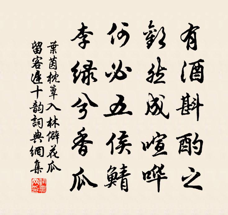 詩詞名句歷史字典書法欣賞書法字典國語詞典說文解字康熙字典古漢語字典標 題 作 者 詩 句 枕簟入林僻花瓜留客遲十韻作者:葉茵 朝代:宋代枕簟入林僻花瓜留客遲十韻原文有酒斟酌之,歡然成喧譁。何必五侯鯖,李綠兮香瓜。詩詞問答問:枕簟入林僻花瓜留客遲十韻的作者是誰?答:葉茵問:枕簟入林僻花瓜留客遲十韻寫於哪個朝代?答:宋代葉茵枕簟入林僻花瓜留客遲十韻書法欣賞枕簟入林僻花瓜留客遲十韻書法作品詩詞推薦賜劉能真三首宋高宗〔宋代〕簡易高人道,崇玄性自真。身常居太極,心已遠凡塵。玉階辭榮祿,瑤台役鬼神。辛勤三十載,羨爾道心淳。讀書陸游〔宋代〕兩眼欲讀天下書,力雖不迨志有餘。千載欲追聖人徒,慷慨自信寧免愚?置書不讀談虛無,誰其始為此創疽?古時緣識宋太宗〔宋代〕四敘相遷亦可觀,斜扉半掩半欹關。詩吟海岳皆空盡,扇覺秋涼漸放閒。樹影臨窗迷遠思,渴禽戀水復飛還。旋教東帥張傳之遣人來相致將以七言次韻答之三首李壁〔宋代〕閬風當日奉清樽,猶記銀鉤酒七言。別去淒涼渾一夢,只今疎懶且衡門。已非絕足那希驥,自比游塵或佐鯤。珍重洞石岩張登〔唐代〕山斷開元蠍,龕留大業僧。七年馳便路,三躡石梯層。轉調二郎神/二郎神張孝祥〔宋代〕悶來無那,暗數盡、殘更不寐。念楚館香車,吳溪蘭棹,多少愁雲恨水。陣陣迴風吹雪霰,更旅雁、一聲沙際。想梧桐樹 嗚鶴餘音卷七,以上八首,嗚鶴餘音佚名〔宋代〕五更里,朦朧定。心養浩月一輪鏡。照破貪嗔病。這回須要鬼神驚。只要真清為真靜。功滿朝上聖。看小舟除萍二首楊萬里〔宋代〕花伴吟喔柳伴行,生憎庭外晚衙聲。獨攜便面巡荷沼,自課蘭舟掠水萍。後坑茅舍易士達〔宋代〕三兩人家傍小溪,蕭蕭短竹插疏籬。平生不識興亡事,只探春來種穀時。念奴嬌盧炳〔宋代〕晚天清楚,掃太虛纖翳,涼生江曲。四顧青冥天地闊,惟有殘霞孤騖。山氣凝藍,汀煙引素,竦竦浮群木。白苹風賀新郎 賦水仙辛棄疾〔宋代〕雲臥衣裳冷。看蕭然、風前月下,水邊幽影。羅襪塵生凌波去,湯沐煙江萬頃。愛一點、嬌黃成暈。不記相逢曾解幽事陸游〔宋代〕老大常愁節物催,東皇又挽斗杓回。江天慘慘不成雪,山驛蕭蕭初見梅。隱士寄雲從地肺,游僧問路上天台。戲書白馬金砂洞釋居簡〔宋代〕準擬朝餐洞口霞,更窮泓碧漲桃花。可曾石罅瀦成玉,多是金邊揀得沙。符說有靈尋漢篆,人因鑒止見胡麻。依稀和韓司諫叔夏樂谷五吟竹枕胡寅〔宋代〕故鄉清渭濱,一節取君子。相從大江南,展轉秋風裡。清慵笑玉便,傲兀勝隱几。屏山煙景媚,醉倒日高起。此君和孫莘老游龍洞寄孫傅師秦觀〔宋代〕葦蕭傳火度冥冥,作入清都醉魄醒。草隱月崖垂風尾,風生陰穴帶龍腥。壁間泉貯千鍾碧,門外天橫數尺青。更欲寄景遜文同〔宋代〕別後西城上,來須到日曛。目迎秦塞雁,心過隴山雲。寡合無如我,高懷少似君。相思只相望,徒爾托云云。重過鍾潭寺月灣有詩次韻徐瑞〔宋代〕五年三到此,門逕怪頻移。絕壁何年樹,空廓異代碑。微潤生古瀨,浮翠擁修眉,煮茗談時事,山僧總未知。浣溪沙(怨啼鵑)韓淲〔宋代〕錦瑟瑤琴續斷弦。璧堂初過牡丹天。玉鉤斜壓小珠簾。睡鴨爐溫吟散後,雙鴛屏掩酒醒前。一番春事怨啼鵑。寄題萬安縣劉元襲橫秀閣楊萬里〔宋代〕玉簪成陣雪成堆,秀氣橫空撥不開。楚岫蒼寒五雲外,贛江白寫九天來。煙銷日出皆詩句,月色波聲喚夢回。早晚晚坐高明台宋庠〔宋代〕悔倚危欄望夕霏,臨高無事亦依依。天長去鳥幾時返,風罷孤云何處歸。一世功名慚擊節,百年耕鑿願忘機。銜恩名句推薦若要人不知,除非己莫為。佚名《增廣賢文·上集》 山重水複疑無路,柳暗花明又一村。陸游《游山西村》 岸柳垂金線,雨晴鶯百囀。顧敻《醉公子·岸柳垂金線》 輕舟泛月尋溪轉,疑是山陰雪後來李白《東魯門泛舟二首》 茂苑人歸,秦樓燕宿,同惜天涯為旅。吳文英《齊天樂·新煙初試花如夢》 小溪清水平如鏡,一葉飛來浪細生。徐璣《秋行》 長記曾攜手處,千樹壓、西湖寒碧。姜夔《暗香·舊時月色》 但將千歲葉,常奉萬年杯。趙彥昭《奉和元日賜群臣柏葉應制》 香到酴醾送晚涼,荇風輕約薄羅裳。曲闌憑遍思偏長。葉小鸞《浣溪沙·初夏》 帝里重清明,人心自愁思。孟浩然《清明即事》