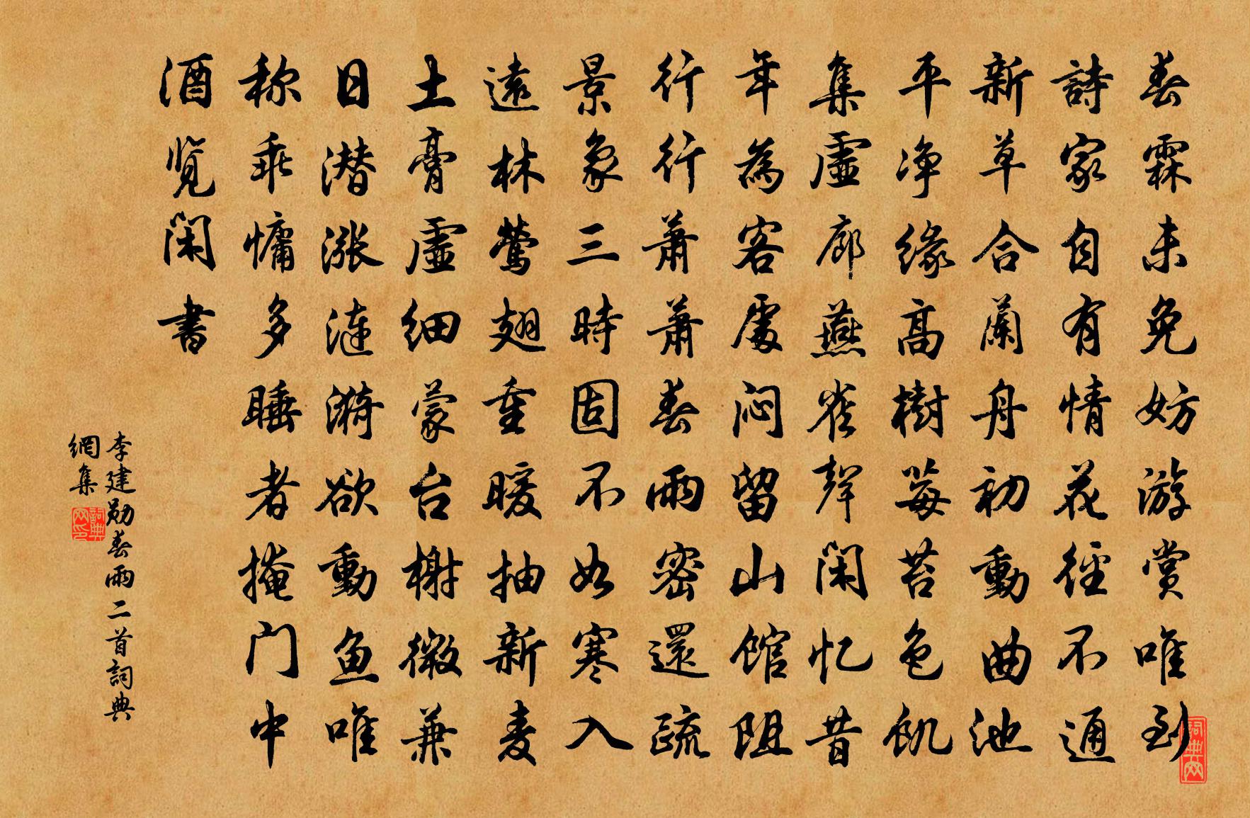 詩詞名句歷史字典書法欣賞書法字典國語詞典說文解字康熙字典古漢語字典標 題 作 者 詩 句 春雨二首作者:李建勛 朝代:唐代春雨二首原文春霖未免妨游賞,唯到詩家自有情。花徑不通新草合,蘭舟初動曲池平。淨緣高樹莓苔色,飢集虛廊燕雀聲。閒憶昔年為客處,悶留山館阻行行。蕭蕭春雨密還疏,景象三時固不如。寒入遠林鶯翅重,暖抽新麥土膏虛。細蒙台榭微兼日,潛漲漣漪欲動魚。唯稱乖慵多睡者,掩門中酒覽閒書。詩詞問答問:春雨二首的作者是誰?答:李建勛問:春雨二首寫於哪個朝代?答:唐代問:春雨二首是什麼體裁?答:七律李建勛春雨二首書法欣賞春雨二首書法作品注釋全唐詩:卷739-50詩詞推薦【雙調】大德歌 三關漢卿〔元代〕鄭元和,受寂寞,道是你無錢怎奈何?哥哥家緣破,誰著你搖銅鈴唱輓歌。因打亞仙門前過,恰便是司馬淚痕多。登山寺杜荀鶴〔唐代〕山半一山寺,野人秋日登。就中偏愛石,獨上最高層。有果猿攀樹,無齋鴿看僧。儒門自多事,來此復何能。雲門大師贊釋慧遠〔宋代〕倒著睦州破蒲鞵,輥雪峰爛球子。鴆鳥飛空草不生,毒龍入水魚皆死。單提獨掇驗人關,逆順雙行絕往還。遺烈尚乞食僧貫休〔唐代〕擎缽貌清羸,天寒出寺遲。朱門當大路,風雪立多時。似月心常淨,如麻事不知。行人莫輕誚,古佛盡如斯。宿潮州海陽館獨夜不寐二首楊萬里〔宋代〕臘前蚊子已能歌,揮去還來柰爾何。一隻攪人終夕睡,此聲元自不須多。戲改杜贈鄭廣文詩王洙〔宋代〕景純過官舍,走馬不曾下。驀地趁朝歸,便遭官長罵。四明山中十絕莽廣溪戴表元〔宋代〕怪石驚湍吼不休,時時岩客飲寒牛。誰知此水明州去,浸作琉璃萬頃秋。漫興劉克莊〔宋代〕保社有幽子,戶庭無雜賓。若非負苓者,即是耦耕人。筇穩慵呼馬,蔬甘勝擘麟。篋中詩又滿,誰謂此翁貧。答葉司理趙師秀〔宋代〕寂寞坐高齋,兵來與訊偕。喜看君字畫,癯似我形骸。頗欲徵陳作,遙知動遠懷。夢魂思一遇,風雨暗長淮。又和晦翁棹歌方岳〔宋代〕家在清溪第幾峰,誰搴薜荔采芙蓉。漁歌未斷忽歸去,翠壁一重雲一重。暮秋會嚴京兆後廳竹齋岑參〔唐代〕京兆小齋寬,公庭半藥闌。甌香茶色嫩,窗冷竹聲乾。盛德中朝貴,清風畫省寒。能將吏部鏡,照取寸心看。竹影李深之西尉同年談吳興風物,再用古城韻范成大〔宋代〕李侯昔游吳,蓮舟鏡蒼茫。風鬟與霧鬢,共濯玻璃光。採花不盈舫,日暮雲水香。還登縹緲樓,羅襟酒淋浪。卷箔點絳唇(別代棲隱)向子諲〔宋代〕脫落皮膚,故人南嶽峰前過。只知閒坐。千聖難窺我。明月澄潭,誰唱復誰和。還知麽。錦鱗沒個。莫觸清光破。滿江紅佚名〔宋代〕學富胸襟,才名擅、菊潭第一。都緣是、文星在命,光聯南極。已向九霄橫鶚薦,詞埸獨步花生筆。況而今、好事次韻和史館盛學士朝退書懷之什楊億〔宋代〕金壺待傳點,瑤墀初辯色。闢仗開天閽,垂旒操斗極。百辟瞻堯眉,九州蒙禹力。朝政無闕遣,諫官慚曠職。山居雜詩九十首曹勛〔宋代〕春雪翳重霄,寒雨連日夜。不輟獸炭熾,甚恐庭花謝。疏簾莫御冷,爐焚屢成灺。寒食數日間,春事求諸野。海棠盛開而雨方岳〔宋代〕閉門十日雨淋漓,洗盡紅香了未知。才一霎晴齊睡去,幾何人見半開時。世無解語玉超脫,春欲負予金屈卮。自是侍香金童王哲〔元代〕大道修持,物物俱盡悔。莫起黑煙生**。雲水淨清須慷慨。逸優遊、做成奇駭。壘這功行,便恰如山與海。得*望蓬萊馬鈺〔元代〕馬風子,獨自賞元宵。剔正命燈勝白晝,放開心月透青霄。掌握紫芝苗。金童舞,玉女更 * 。酒飲瓊漿雖是美,劍門城北回望劍關諸峰青入雲漢感蜀亡事慨然陸游〔宋代〕自昔英雄有屈信,危機變化亦逡巡。陰平窮寇非難御,如此江山坐付人。名句推薦春風不解禁楊花,蒙蒙亂撲行人面。晏殊《踏莎行·小徑紅稀》 若是前生未有緣,待重結、來生願。樂婉《卜運算元·答施》 私勿與人,謀必辟。來俊臣《羅織經·治下卷第三》 借問漢宮誰得似,可憐飛燕倚新妝。李白《清平調·其二》 古者春夏二氣,不決重罪。姚思廉《陳書·本紀·卷三》 黃河西來決崑崙,咆哮萬里觸龍門。李白《公無渡河》 有情芍藥含春淚,無力薔薇臥曉枝。秦觀《春日》 突營射殺呼延將,獨領殘兵千騎歸。李白《從軍行》 無端更渡桑乾水,卻望并州是故鄉。劉皂《旅次朔方 / 渡桑乾》 辛勤好似蠶成繭,繭老成絲蠶命休。馮夢龍《醒世恆言·卷三十五》