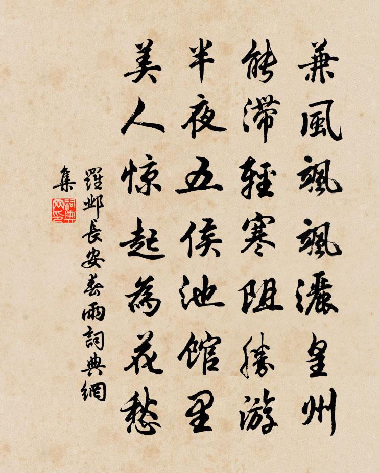 詩詞名句歷史字典書法欣賞書法字典國語詞典說文解字康熙字典古漢語字典標 題 作 者 詩 句 長安春雨作者:羅鄴 朝代:唐代長安春雨原文兼風颯颯灑皇州,能滯輕寒阻勝游。半夜五侯池館裡,美人驚起為花愁。詩詞問答問:長安春雨的作者是誰?答:羅鄴問:長安春雨寫於哪個朝代?答:唐代問:長安春雨是什麼體裁?答:七絕羅鄴長安春雨書法欣賞長安春雨書法作品注釋全唐詩:卷654-107詩詞推薦留題表兄三歌養浩亭陳襄〔宋代〕華構敞雲扃,人幽境亦靈。心間生浩氣,味薄得真經。鑿沼觀魚樂,開樽與酒盟。由來知此趣,何暇問攖寧。送陳監簿造朝劉克莊〔宋代〕君昔閒三紀,朝今聚眾賢。居然峙鸞鵠,不似襲貂蟬。訓儉無釵澤,遺忠有笏傳。將何告明主,事事法隆乾。依韻和彭九及之歸養之什強至〔宋代〕江南春自好,蜀客亦思歸。淚與花俱落,心隨燕共飛。露章還子舍,孝理副宸闈。禁署風流後,謀漁未有磯。玉汝贈永與冰蜜梨十顆梅堯臣〔宋代〕梨傳真定間,其甘曰如蜜。君得鹹陽中,味兼冰作質。遺之析朝酲,亦以蠲煩疾。吾兒勿多嗜,不比盤中栗。累字戲作解愁吟簡舊寮宋伯仁〔宋代〕愁。知不。空白頭。心事驚秋。歸興滿滄洲。貂蟬雖出兜鍪。功名有愧黑貂裘。夷齊與盜跖總荒丘。無非遽遽栩栩中宮院熊道裕〔宋代〕我昨投文清泠淵,稍責老龍多睡眠。鐵笛穿雲久寂寞,作詩喚起劉高禪。劉高豢龍與龍語,一夜風雷共謀雨。雨師題珣師休牧軒三首宗澤〔宋代〕青居曾露一絲頭,謾示人能解牧牛。究竟本來無一物,未知能使阿誰休。一乘休去已忘機,恰似當初未牧時。雲起一壺歌陸游〔宋代〕自從軒昊到隋唐,幾見中原作戰場!三十萬年如電掣,不曾記得不曾忘。西湖竹閣寺周弼〔宋代〕精舍蕭疏近水涼,分明一徑綠沉槍。就移山近湖皆隱,放出樓高寺倒藏。春透露梢齊曲檻,曉翻風籜過修牆。長堤慈濟庵二首留元崇〔宋代〕歸自星壇日未斜,草庵留住一杯茶。道人自點花如雪,雲是新收白露芽。道可道者釋祖欽〔宋代〕道可道,非常道。名可名,非常名。名既非常,如器中鍠。道既非常,如日之光。如器中鍠,聲出於內。如日之光過秦樓(和美成韻)趙崇嶓〔宋代〕隱枕輕潮,拂塵疏雨,幽夢似真還斷。鶯雛燕婉,依約年時,花下試翻歌扇。憔悴鬢 * ,慢掠輕絲,柳風如箭詠石宋祁〔宋代〕勝具論終古,尋幽屬政成。待時藏磊落,得地鬬崢嶸。錦駁苔文露,虹浮玉氣明。夢池分到影,窗岫讓吟情。乍恐過臨淮張耒〔宋代〕沖寒發孤城,帶雪入異縣。春陰舟楫回,遠眼煙木亂。朝來雲間塔,別我忽不見。春流背客去,應過前日岸。懷居眼兒媚張元乾〔宋代〕蕭蕭疏雨滴梧桐。人在綺窗中。離愁遍繞,天涯不盡,卻在眉峰。嬌波暗落相思淚,流破臉邊紅。可憐瘦似,一枝滿江紅(題博見樓)呂勝己〔宋代〕物理分明,人事巧、元來是拙。常自覺、滿懷春意,向他誰說。剩喜登臨頻眺望,那知出處成迂闊。細閒思、蕭散水調歌頭 再和寄酬袁子英蕭寺謝應芳〔元代〕六載遠相憶,一日似三秋。別後雪添蓬鬢,著述遣窮愁。幾度欲尋安道,溪上片帆飛去,興盡復回舟。明月出東海偈頌一百二十三首釋崇岳〔宋代〕半雨半晴,桃紅李白。點著便行,不勞啗啄。落梅風馬致遠〔元代〕夕陽下,酒旆閒。兩三航未曾著岸。落花水香茅舍晚,斷橋頭賣魚人散。對蓮花戲寄晁應之張耒〔宋代〕平池碧玉秋波瑩,綠雲擁扇青瑤柄。水宮仙女鬬新妝,輕步凌波踏明鏡。彩橋下有雙鴛戲,曾托鴛鴦問深意。半開名句推薦茶有九難:一曰造,二曰別,三曰器,四曰火,五曰水,六曰炙,七曰末,八曰煮,九曰飲。陸羽《茶經·六之飲》 對茲佳品酬佳節,桂拂清風菊帶霜。曹雪芹《螃蟹詠》 一切福田,不離方寸;從心而覓,感無不通。袁黃《了凡四訓·立命之學》 無端嫁得金龜婿,辜負香衾事早朝。李商隱《為有》 把酒對斜日,無語問西風。楊炎正《水調歌頭·把酒對斜日》 藥醫不死病,佛度有緣人。馮夢龍《醒世恆言·卷十》 莫笑他人老,終須還到老。佚名《增廣賢文·上集》 檳榔無柯,椰葉無陰。左思《三都賦》 新妝宜面下朱樓,深鎖春光一院愁。劉禹錫《和樂天春詞 / 春詞》 忽然一夜清香發,散作乾坤萬里春。王冕《白梅》