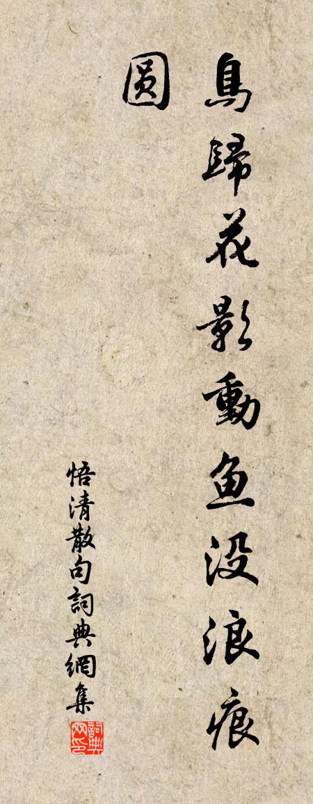 詩詞名句歷史字典書法欣賞書法字典國語詞典說文解字康熙字典古漢語字典標 題 作 者 詩 句 句作者:悟清 朝代:唐代句原文鳥歸花影動,魚沒浪痕圓。詩詞問答問:句的作者是誰?答:悟清問:句寫於哪個朝代?答:唐代問:句是什麼體裁?答:句悟清句書法欣賞句書法作品注釋全唐詩:卷851-11詩詞推薦和蔡準郎中見邀游西湖三首蘇軾〔宋代〕夏潦漲湖深更幽,西風落木芙蓉秋。飛雪暗天雲拂地,新蒲出水柳映洲。湖上四時看不足,惟有人生飄若浮。解顏陪張丞相登嵩陽樓孟浩然〔唐代〕獨步人何在?嵩陽有故樓。歲寒問耆舊,行縣擁諸侯。林莽北彌望,沮漳東會流。客中遇知己,無復越鄉憂。使君饋食戲少蒙教授陳棣〔宋代〕朝來食指非常動,果報兵廚已割烹。醇德且我從事酒,珍庖特異小人羹。虎頭食肉方灰念,羊腳蹴蔬應震驚。歸遺和友人王之望〔宋代〕弟兄南渡各馳驅,向奉君王尺一除。黃耳音書寄懷抱,烏衣門巷惜丘墟。澄清孟博榮持節,雅量玄平靜著書。五桂題黃岩溪孫應時〔宋代〕得雨溪聲壯,無風雲氣多。山花依翠竹,灘石亂寒莎。樵父谷中出,牧兒牛背歌。逢人間塵世,擾擾意如何。句姚孝錫〔宋代〕舞風初學絮,帶雨不成花。壺中天(養拙園夜飲)張炎〔宋代〕瘦筇訪隱,正繁陰閒鎖,一壺幽綠。喬木蒼寒圖畫古,窈窕行人韋曲。鶴響天高,水流花淨,笑語通華屋。虛堂松壽湖南汪倉十首廖行之〔宋代〕萬卷詩書即肯堂,儒宗氣習洗膏粱。天資問學俱前輩,須信源深流正長。晚歸東園李頎〔唐代〕荊扉帶郊郭,稼穡滿東菑。倚杖寒山暮,鳴梭秋葉時。回雲覆陰谷,返景照霜梨。澹泊真吾事,清風別自茲。大晟府擬撰釋奠十四首佚名〔宋代〕大哉聖王,實王生德。作樂以崇,時祀無矣。清酤惟聲,嘉牲孔碩。薦羞神明,庶幾昭格。題友人山居貫休〔唐代〕卜居鄰塢寺,魂夢又相關。鶴本如雲白,君初似我閒。月明僧渡水,木落火連山。從此天台約,來茲未得還。和潘良貴題三江亭韻王伯庠〔宋代〕使君不受二毛侵,杖屨逍遙得勝尋。撥遣簿書聊永日,登臨山水亦何心。殘梅墮雪垂垂白,弱柳搖春淡淡金。倚矚句葉適〔宋代〕初分大道非常道,才有先天未後天。香林洞楊蟠〔宋代〕百年樵斧外,留得掛寒猿。不奈西溪水,流香出洞門。冬日山居好十首舒岳祥〔宋代〕冬日山居好,茅茨不漏風。山廚蒸芋栗,野徑掃風蓬。嫩酒篘初白,寒灰撥暫紅。編氓吾未免,杜老屢囊空。句陳從古〔宋代〕禮部又開南省傍,賣花羞聽叫文官。扈從景靈宮(一作:奉和穎叔萬壽觀)蘇軾〔宋代〕道人幽夢曉初還,已覺笙蕭下月壇。風伯前驅清宿霧,祝融驂乘破朝寒。英姿連璧從多士,妙句鏘金和八鑾。已向牡丹開已數日方盛麗未艾也成二絕錢時〔宋代〕未到牡丹春未好,花開恰莫怨春遲。金沙玉板相扶擁,正是東君極盛時。偶作釋行海〔宋代〕楚甸荒荒雜戍塵,行藏日日倚樓頻。風煙易老東西客,泉石偏疎富貴人。喜有白鷗知靜思,恨無黃鵠載閒身。岳僧卜運算元(般涉調)張先〔宋代〕夢短寒夜長,坐待清霜曉。臨鏡無人為整妝,但自學、孤鸞照。樓台紅樹杪。風月依前好。江水東流郎在西,問尺名句推薦樹繞村莊,水滿陂塘。秦觀《行香子·樹繞村莊》 如花美眷,似水流年曹雪芹《紅樓夢·第二十三回》 夫為將者,必有腹心、耳目、爪牙。諸葛亮《將苑·卷一·腹心》 為害常因不察,致禍歸於不忍。來俊臣《羅織經·閱人卷第一》 酒困路長惟欲睡,日高人渴漫思茶。蘇軾《浣溪沙·簌簌衣巾落棗花》 新啼痕壓舊啼痕,斷腸人憶斷腸人。王實甫《十二月過堯民歌·別情》 山河破碎風飄絮,身世浮沉雨打萍。文天祥《過零丁洋》 幾日喜春晴,幾夜愁春雨。高觀國《卜運算元·泛西湖坐間寅齋同賦》 重幃深下莫愁堂,臥後清宵細細長。李商隱《無題·重幃深下莫愁堂》 會當凌絕頂,一覽眾山小。杜甫《望岳》