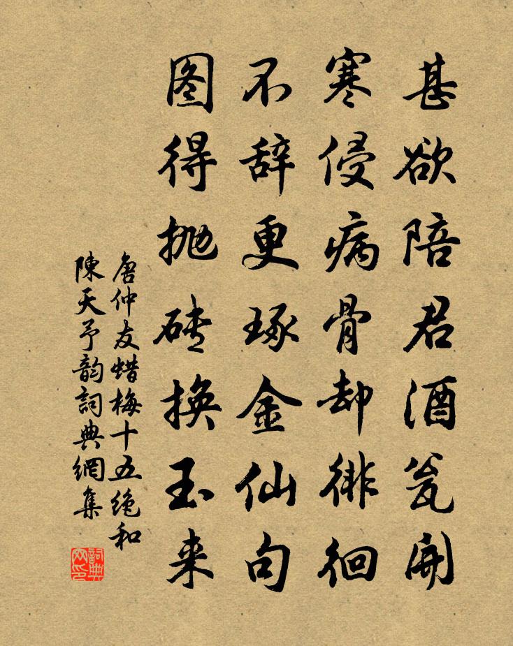 詩詞名句歷史字典書法欣賞書法字典國語詞典說文解字康熙字典古漢語字典標 題 作 者 詩 句 蠟梅十五絕和陳天予韻作者:唐仲友 朝代:宋代蠟梅十五絕和陳天予韻原文甚欲陪君酒瓮開,寒侵病骨卻徘徊。不辭更琢金仙句,圖得拋磚換玉來。詩詞問答問:蠟梅十五絕和陳天予韻的作者是誰?答:唐仲友問:蠟梅十五絕和陳天予韻寫於哪個朝代?答:宋代唐仲友蠟梅十五絕和陳天予韻書法欣賞蠟梅十五絕和陳天予韻書法作品詩詞推薦句白敏中〔唐代〕南浦花臨水,東樓月映風。(鎮劍南,經忠州,尋樂天遺蹟作。見《紀事》)挽雲門鄭君黃榦〔宋代〕結友雲門日,曾聞谷口翁。松肥三徑雨,鱸熟一絲風。行業鄉閭敬,詩書子姓同。論心獨余恨,秋草對碑豐。摸魚子 中都餞荀平叔都事赴大都許有壬〔元代〕正荒寒似逃空谷,佳人又話離別。風低白草天無際,漠漠平沙如雪。心欲折。看落日飛鴻,一線明還滅。長歌激烈病起四詩三息念陳造〔宋代〕祿位據極品,勳業垂不磨。出從白馬肥,家有黃金多。世間遺富者,才德乃莫過。骨相審自知,瓮盎哀駘他。一昔黃司法妻歐陽氏孺人輓詩楊萬里〔宋代〕法掾無雙裔,夫人六一孫。夙勤南澗藻,晚享北堂萱。蒲圃嚴新檟,潘輿閟舊軒。庭階森玉樹,駟馬看高門。桂陽北嶺偶過野人所居,聊書即事呈王永州邕李道州圻戴叔倫〔唐代〕犬吠空山響,林深一徑存。隔雲尋板屋,渡水到柴門。日晝風煙靜,花明草樹繁。乍疑秦世客,漸識楚人言。不記萱徑攜筇陳杰〔宋代〕松下無喝道,言樹聊蠲憂。誰知赤籐杖,獨倚萬古愁。再和楊公濟梅花十絕蘇軾〔宋代〕湖面初驚片片飛,樽前吹折最繁枝。何人會得春風意,怕見梅黃雨細時。和王粹中姜特立〔宋代〕昔年曾踏軟紅塵,回首修門七換春。官職不多還不欠,交情無舊亦無新。有花日日招嘉客,問字時時接近鄰。且願酹江月(信豐賦茉莉)趙師俠〔宋代〕化工何意,向天涯海嶠,有花清絕。縞袂綠裳無俗韻,不畏炎荒煩熱。玉骨無塵,冰姿有艷,雅淡天然別。真香冶南樓令(壽邵素心席間賦)張炎〔宋代〕一片赤城霞。無心戀海涯。遠飛來、喬木人家。且向琴書深處隱,終勝似、聽琵琶。休近七香車。年華已破瓜。怕雨作二首曹勛〔宋代〕倒海傾潮翻白雨,鉤窗卷箔度清風。江山一餉驚雷靜,已有閒雲行碧空。熙寧皇太后冊寶三首佚名〔宋代〕皇帝降席,流雲四開。堯趙舜步,下躡天階。恭授襪岫,翠旄裴回。明明純孝,鴻釐大來。農居釋文珦〔宋代〕農居深且僻,城市不相聞。草路縱橫入,柴門向背爭。兒童知放牧,父老念耕耘。但願桑麻長,勤勞豈足雲。澆花方岳〔宋代〕籬落花無賴,春寒手自治。但留根本在,終有發生時。雨露曾何擇,山林未易移。吾知勤抱瓮,一任化工為。步虛詞翁卷〔宋代〕玄根布靈葉,妙化無常人。結茲清陽氣,挺我空洞神。鍊度得長生,列籍齊眾真。登賓玉皇家,執侍羅星嬪。欻往朝中措(帥生日)洪适〔宋代〕斗南樓閣舞祥雲。為壽幾多人。有酒恰如東海,年年為滿金尊。無雙治行,兒童詠德,草木沾仁。只把空虛三院,金蓮出玉花 寄張知觀馬鈺〔元代〕張公知觀。性命堪搜常作觀。勘破囂塵。灰了凡心出世塵。內修內煉。真汞真鉛常鍛鍊。要見金蓮。須是深深種玉臨江仙·送宇文德和被召赴行在所張元乾〔宋代〕露坐榕陰須痛飲,從渠疊鼓頻催。暮山新月兩徘徊。離愁秋水遠,醉眼曉帆開。泛宅浮家遊戲去,流行坎止忘懷。賀喬丞相厲寺正〔宋代〕天下達尊三,加之量海涵。忠言今稷契,眉壽古彭聃。渭水功猶小,汾陽考欲參。料應宣勸處,花不數優曇。名句推薦莫聽穿林打葉聲,何妨吟嘯且徐行。蘇軾《定風波·莫聽穿林打葉聲》 穩當話,卻是平常話,所以聽穩當話者不多王永彬《圍爐夜話·第四則》 至今不會天中事,應是嫦娥擲與人。皮日休《天竺寺八月十五日夜桂子》 功蓋三分國,名成八陣圖。杜甫《八陣圖》 日暮鄉關何處是?煙波江上使人愁。崔顥《黃鶴樓 / 登黃鶴樓》 今春看又過,何日是歸年。杜甫《絕句二首》 別夢依依到謝家,小廊回合曲闌斜。張泌《寄人》 青山橫北郭,白水繞東城李白《送友人》 遠樹帶行客,孤城當落暉。王維《送綦毋潛落第還鄉 / 送別》 賈生年少虛垂淚,王粲春來更遠遊。李商隱《安定城樓》