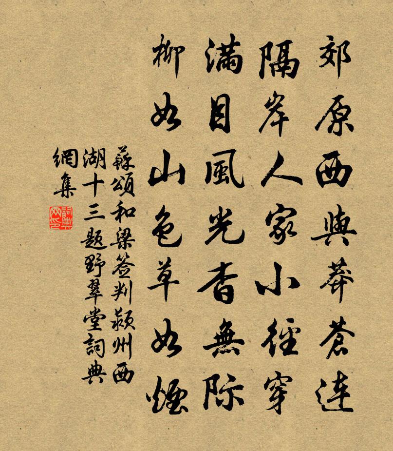詩詞名句歷史字典書法欣賞書法字典國語詞典說文解字康熙字典古漢語字典標 題 作 者 詩 句 和梁簽判潁州西湖十三題野翠堂作者:蘇頌 朝代:宋代原文郊原西與莽蒼連,隔岸人家小徑穿。滿目風光杳無際,柳如山色草如煙。詩詞問答問:《和梁簽判潁州西湖十三題野翠堂》的作者是誰?答:蘇頌問:該詩寫於哪個朝代?答:宋代書法欣賞和梁簽判潁州西湖十三題野翠堂書法作品詩詞推薦暑中雜興胡仲弓〔宋代〕一刻之閒直萬金,苦無不可共幽襟。成年不作西湖想,聽得啼鶯不自禁。攤破浣溪沙/山花子李清照〔宋代〕病起蕭蕭兩鬢華。臥看殘月上窗紗。豆蔻連梢煎熟水,莫分茶。枕上詩書閒處好,門前風景雨來佳。終日向人多醞山間偶成二絕王炎〔宋代〕隔枝啼鳥喚幽夢,排闥青山無世情。綠樹陰陰遮日影,虛窗臥看白雲行。游四窗劉長卿〔唐代〕四明山絕奇,自古說登入。蒼崖倚天立,覆石如覆屋。玲瓏開戶牖,落落明四目。箕星分南野,有斗掛檐北。日月偈頌七十六首釋師範〔宋代〕十五日以前,常在途中,不離家舍。十五日以後,常在家舍,不離途中。正當十五日,跛跛挈挈,百醜千拙。張都思歸董嗣杲〔宋代〕秋老江城起戌塵,山收西日掩雲津。留連光景多無酒,挽仰風埃獨有身。曠野雁填遺陣闊,虛沙船發落痕新。故園絕句吳公〔唐代〕去國投茲土,編茅隱舊蹤。年年秋水上,獨對數株松。溪邊吟李中〔唐代〕鸂鶒雙飛下碧流,蓼花蘋穗正含秋。茜裙二八採蓮去,笑沖微雨上蘭舟。新秋白居易〔唐代〕西風飄一葉,庭前颯已涼。風池明月水,衰蓮白露房。其奈江南夜,綿綿自此長。婁家梅篇徐璣〔宋代〕婁家屋西梅,梅老枝更清。眾樹吐齊白,密萼含微清。下有碧池波,照比鷗鷺翎。寒雲拂縞衣,遙空淡明星。薄言馬上見韓偓〔唐代〕驕馬錦連錢,乘騎是謫仙。和裙穿玉鐙,隔袖把金鞭。去帶懵騰醉,歸成困頓眠。自憐輸廄吏,余暖在香韉。覺意詩賜江革蕭衍〔南北朝〕唯當勤精進。自強行勝修。豈可作底突。如彼必死囚。寄林運使三首趙蕃〔宋代〕門第違離又一冬,素書寥闊便艱通。身隨回雁辭湘水,官許騎驢看華峰。人笑半生軀落拓,自欣三徑著疏慵。顧慚趙萬宗入道因寄釋智圓〔宋代〕羔雁已聞徵不起,卻求披戴守貞居。月堂欹枕三清夢,秋榻生塵萬卷書。壇匝冷痕春蘚碧,鶴翹寒影雪杉疏。年來桂花楚娘〔宋代〕丹桂迎風蓓蕾開,摘來斜插竟相偎。清香不與群芳並,仙種原從月裡來。江行阻風黎廷瑞〔宋代〕遠涉仍多病,那堪正蘊隆。黃沙吹白浪,赤日照青楓。天地支頤內,江山散發中。一涼端足快,莫恨打頭風。極相思佚名〔宋代〕一番雨過橫塘。春日直門下省早朝(時為右補闕)王維〔唐代〕騎省直明光,雞鳴謁建章。遙聞侍中珮,闇識令君香。玉漏隨銅史,天書拜夕郎。旌旗映閶闔,歌吹滿昭陽。官舍望江南/憶江南楊無咎〔宋代〕鍾陵好,佳節慶元正。瑞色潛將春共到,台星遙映月初升。賢帥為時生。人意樂,天宇亦清明。淡薄眉腮嬌倚暖,和馮亞見贈魏野〔宋代〕一生無一事,兀兀復騰騰。信腳雖過寺,齋心不請僧。松篁為活計,琴酒是良朋。除卻君酬唱,他人亦懶能。名句推薦多少淚珠何限恨,倚欄乾李璟《攤破浣溪沙·菡萏香銷翠葉殘》 得忍且忍,得耐且耐,不忍不耐,小事成災。佚名《增廣賢文·上集》 飛流直下三千尺,疑是銀河落九天。李白《望廬山瀑布》 少無適俗韻,性本愛丘山。陶淵明《歸園田居·其一》 孤雲與歸鳥,千里片時間。馬戴《落日悵望》 山高必有怪,嶺峻卻生精。吳承恩《西遊記·第二十七回》 鳳皇舟上楚女,妙舞,雷喧波上鼓孫光憲《河傳·柳拖金縷》 今古河山無定據。納蘭性德《蝶戀花·出塞》 功過不宜少混,混則人懷惰隳之心洪應明《菜根譚·概論》 十輪霜影轉庭梧,此夕羈人獨向隅。晏殊《中秋月》