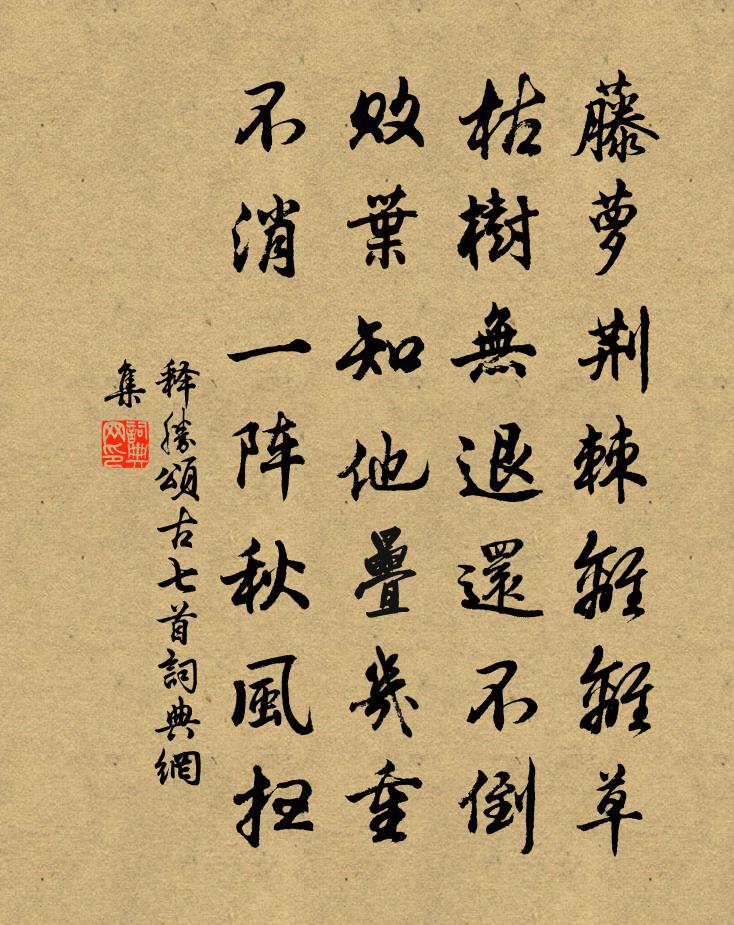 詩詞名句歷史字典書法欣賞書法字典國語詞典說文解字康熙字典古漢語字典標 題 作 者 詩 句 頌古七首作者:釋勝 朝代:宋代頌古七首原文藤蘿荊棘離離草,枯樹無退還不倒。敗葉知他疊幾重,不消一陣秋風掃。詩詞問答問:頌古七首的作者是誰?答:釋勝問:頌古七首寫於哪個朝代?答:宋代釋勝頌古七首書法欣賞頌古七首書法作品詩詞推薦吟梅趙時韶〔宋代〕安得梅開向四時,騷人日日可吟詩。年來萬事心都懶,只有吟梅興未衰。金城柳楊備〔宋代〕風絮菸絲春復秋,攀條何故淚雙流。煙憐樹老猶青眼,不覺人衰已白頭。園櫻傷老也司馬光〔宋代〕園有農李,圃有肥杞。我酒既旨,我淆既美。我友戾止,改憂為喜。今我不樂,年其有幾。題黃德老西亭二絕鄭剛中〔宋代〕花木橫斜轉小蹊,疏簾竹屋任高低。何人移得僧窗靜,置在君家廳事西。早春偶題崔鶠〔宋代〕寒風淅瀝鳴枯葦,小鴨睡殘猶未起。更教細雨結輕寒,坐聽蕭蕭打窗紙。石盆養蒲已抽翠,雕斛栽花先弄紫。擁爐哀甬東李鄴嗣〔清代〕江乾一夜雨,何處洗腥塵。赤野豐烏食,青煙雜馬磷。鬼房愁近夜,怨草慮無春。此日高蒼意,應憐三戶民。又次劉學錄韻陳宓〔宋代〕八月川原旱欲然,季秋連雨頓澄鮮。明朝領客成無暇,七日登高不厭前。菡萏掃除如暑淨,芙蓉綽約作春妍。佳人嘉泰三年皇后冊寶十三首佚名〔宋代〕瑤冊玉寶,爛然瑞輝。旁翼絳節,上承紫微。璆鳴朝佩,徐出赤扉。登進坤極,益彰典徽。頌古八首釋師一〔宋代〕趙老家風不熱瞞,問他大道答長安。有誰平步歸家去,多是區區自作難。楝花張蘊〔宋代〕綠樹菲菲紫白香,猶堪纏黍吊沉湘。江南四月無風訊,青草前頭蝶思狂。獨至香山憶謝學士歐陽修〔宋代〕伊水弄春沙,山臨水上斜。曾為謝公客,◇入梵王家。陰澗初生草,春岩自落花。卻尋題石處,歲月已堪嗟。秋晚即事三首李彌遜〔宋代〕霜樹今無一葉留,日邊雲暗使人愁。獨憐揚子灣頭岸,猶有黃花戀晚秋。秋夕不寐宋祁〔宋代〕風褭危檣浪拍船,三更殘月下空弦。離鴻過盡啼烏困,猶自愁人不得眠。寄張達道曹勛〔宋代〕茅峰何山亦何好,瑤木琪華並三島。其間岩洞邃且深,隱居仙人得窮討。遠業已跨雪色驢,諸孫何能玉顏老。黑虎鳳棲梧/蝶戀花杜安世〔宋代〕閒上江樓初雨過。滿袖清風,微散誰知我。蓮臉佳人顏未破。沙洲兩兩鴛鴦臥。時有漁歌相應和。疊秀危橫,黛撥旅館三適陳造〔宋代〕劂初木禾種,移殖雲水鄉。粉之且縷強。勻細繭吐緒,潔潤鵝截肪。吳儂言法殊,楚產可倚牆。嗟此玉食品,納我河上逢友人羅鄴〔唐代〕知君意不淺,立馬問生涯。薄業無歸地,他鄉便是家。宵吟憐桂魄,朝起怯菱花。語盡黃河上,西風日又斜。虞美人向子諲〔宋代〕以送之。時正之被召淮陽堂上曾相對。笑把姚黃醉。十年離亂有深憂。白髮蕭蕭同見、渚江秋。履聲細聽知何處。句李紳〔唐代〕君詠風月夕,余當童稚年。閒窗讀書罷,偷詠左司篇。池喧待月張玉孃〔宋代〕待月月未升,看池池水清。冰夷吹海浪,薄霧約雲英。惟見寒波動,嫦娥明鏡行。名句推薦將順其美,匡救其惡,故上下能噲親也司馬遷《史記·管晏列傳》 蠟淚惱東風,舊壘眠新燕。納蘭性德《生查子·鞭影落春堤》 吳興才人怨春風,桃花滿陌千里紅。李賀《送沈亞之歌·並序》 清愁滿眼共誰論。卻應台下草,不解憶王孫。李之儀《臨江仙·登凌歊台感懷》 為誰醉倒為誰醒,到今猶恨輕離別。呂本中《踏莎行·雪似梅花》 不鏡於水,而鏡於人,則吉凶可鑑也王永彬《圍爐夜話·第五二則》 伏雨朝寒愁不勝,那能還傍杏花行。納蘭性德《浣溪沙·伏雨朝寒愁不勝》 憶年十五心尚孩,健如黃犢走復來。杜甫《百憂集行》 一生之內, 當無愧古人姚察、姚思廉《梁書·列傳·卷二十九》 鮑魚蘭芷,不同篋而藏劉向《說苑·指武》