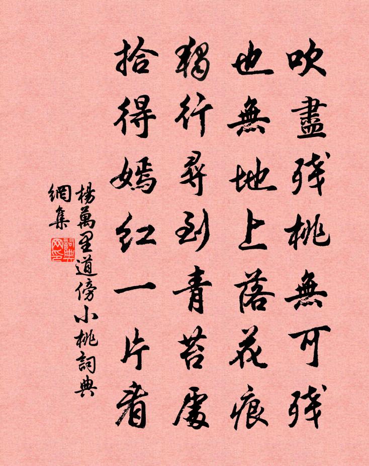 吹盡殘桃無可殘,也無地上落花痕。獨行尋到青苔處,拾得嫣紅一片看。