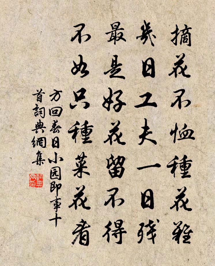 詩詞名句歷史字典書法欣賞書法字典國語詞典說文解字康熙字典古漢語字典標 題 作 者 詩 句 春日小園即事十首作者:方回 朝代:宋代春日小園即事十首原文摘花不恤種花難,幾日工夫一日殘。最是好花留不得,不如只種菜花看。詩詞問答問:春日小園即事十首的作者是誰?答:方回問:春日小園即事十首寫於哪個朝代?答:宋代方回春日小園即事十首書法欣賞春日小園即事十首書法作品詩詞推薦客亭陸游〔宋代〕荻浦煙汀並海涯,一枝柔櫓語咿啞。久從野老非生客,慣寓僧廬勝在家。乘興村村俱有酒,逢春處處可尋花。朝來寄靈仙觀舒職方學士錢惟演〔宋代〕方瞳玄鬢粉闈郎,絳闕齋心奉紫皇。徵士高懷雲在嶺,騷人秋思水周堂。閒園露草開三逕,靈宇華燈燭九光。知有句陳宗禮〔宋代〕山川半為蠻煙累,人物多因謫籍香。何司業輓詞樓鑰〔宋代〕骯髒陽司業,作州如理家。源流知有自,悃愊信無華。方喜亨途遠,俄驚暮景斜。傷心傾蓋舊,何處望東嘉。送劉長清敏蘇轍〔宋代〕汝州太守臥病年,亹亹猶復能清言。平生雄辯嗟不見,風流尚有曹州存。歷下東遊少相識,歡喜聞君在西邑。舊知戰掉醜奴兒 贈劉叔建馬長吉馬鈺〔元代〕吾親叔建並長吉,兩個同監。來解婪耽。來往奔波名利貪,似痴憨。勸他早把元陽整,戀甚妻男。卓個雲庵。一句郊居友人相訪崔道融〔唐代〕柴門深掩古城秋,背郭緣溪一徑幽。不有小園新竹色,君來那肯暫淹留。贈陶琴師白玉蟾〔宋代〕一雨濯旱秋滴滴,西風吹破蒼苔色。松壇月冷夜三更,烏鵲無聲露華白。鰲宮飲散酒杯空,萬籟蕭騷天變黑。惠然簽所勸灸曾鞏〔宋代〕灸灼君所勸,感君書上辭。勿難火艾痛,要使功名垂。我道世所背,君知余有誰。筋骸倘且健,學行肯教隳。楚宮怨二首·其一李涉〔唐代〕十二山晴花盡開,楚宮雙闕對陽台。細腰爭舞君沉醉,白日秦兵天下來。聽航船歌十首方回〔宋代〕四千五百魏塘船,結拆船牙解半千。一千修柁貫三米,三日盤纏無一錢。緣識宋太宗〔宋代〕逢春便見野花親,往覆閒忙舊路塵。輪走蹄輕多少意,世途常似夢中人。疥癬二首劉克莊〔宋代〕髮膚勿毀斯為孝,疥癬雖微至不仁。血氣衰無丹換骨,親朋疏恐癩傳人。裸裎懶對炎涼客,湯熨猶貪閃電身。臭腐句晏殊〔宋代〕素奈發時俱北虜,白榆開處欲爭妍。五月六日夜憶往歲秋與徹師同宿(知玄法師弟子僧徹)李商隱〔唐代〕紫閣相逢處,丹岩議宿時。墮蟬翻敗葉,棲鳥定寒枝。萬里飄流遠,三年問訊遲。炎方憶初地,頻夢碧琉璃。代柬寄王去非劉宰〔宋代〕聞隨使使過江東,想見旌旗十里紅。多少蒼生在寒谷,早吹鄒律轉春風。春朝偶書趙崇嶓〔宋代〕一夕春歸桃李根,清寒猶勒艷陽魂。雪霜雨露年年事,惟有梅花地位尊。傅惟肖贊府假西遊集作長篇送還奇甚次其韻孫應時〔宋代〕醉鄉不游游睡鄉,眼花對案如迷藏。夢踏秋草悲蛩螿,風松露菊三徑荒。忽然欠伸日在廊,悟此身世何荒唐。故書賀新郎葛長庚〔宋代〕一別蓬萊館。看桑田成海,又見松枯石爛。目斷虛皇無極處,安得殿頭宣喚。指歸路、鈞天早晚。此去罡風三萬里得盧衡州書因以詩寄柳宗元〔唐代〕臨蒸且莫嘆炎方,為報秋來雁幾行。林邑東回山似戟,牂牁南下水如湯。蒹葭淅瀝含秋霧,橘柚玲瓏透夕陽。非是名句推薦松下茅亭五月涼,汀沙雲樹晚蒼蒼。戴叔倫《題稚川山水》 翅低白雁飛仍重,舌澀黃鸝語未成。白居易《南湖早春》 安詳是處事第一法,謙退是保身第一法,涵容是處人第一法,灑脫是養心第一法。陳繼儒《小窗幽記·集醒篇》 惟有今宵,皓彩皆同普。郭應祥《醉落魄·丙寅中秋》 南朝四百八十寺,多少樓台煙雨中。杜牧《江南春》 萬里寒光生積雪,三邊曙色動危旌。祖詠《望薊門》 白毛浮綠水,紅掌撥清波駱賓王《詠鵝》 怯於邑斗,而勇於寇戰。商鞅《商君書·戰法》 歌沉玉樹,古寺空有疏鍾發。李綱《六么令·次韻和賀方回金陵懷古鄱陽席上作》 婿為燕國王,身被詔獄加。李白《秦女休行》