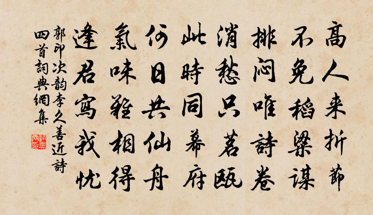 詩詞名句歷史字典書法欣賞書法字典國語詞典說文解字康熙字典古漢語字典標 題 作 者 詩 句 次韻李久善近詩四首作者:郭印 朝代:宋代次韻李久善近詩四首原文高人來折節,不免稻粱謀。排悶唯詩卷,消愁只茗甌。此時同幕府,何日共仙舟。氣味難相得,逢君寫我憂。詩詞問答問:次韻李久善近詩四首的作者是誰?答:郭印問:次韻李久善近詩四首寫於哪個朝代?答:宋代郭印次韻李久善近詩四首書法欣賞次韻李久善近詩四首書法作品詩詞推薦送孫學士兩浙轉運使兼簡杭州知府張侍郎潘閬〔宋代〕曉帆疊疊飛,夜櫓連連鳴。貪吏誡守廉,饑民蘇念生。岸花有異態,沙鳥無嬌聲。錢塘太守賢,好共致昇平。喜晴姜特立〔宋代〕晴日曬江皋,人心散鬱陶。天地忽開泰,萬象分秋毫。瀉我竹葉青,烹我翠雲濤。勿與俗士對,且讀楚人騷。閒遊陸游〔宋代〕柴車去去度橫陂,正是春殘入夏時。果熟多藏新密葉,鶯啼偏占最高枝。迷途每就傭耕問,薄飯時從逆旅炊。隨意送淨道人徐鉉〔唐代〕北阜與西山,前期夢寐間。羨師乘興去,應擬此生閒。喬木人誰在,鱸魚我未還。歸心寄秋水,東去日潺潺。以酒渴愛江清作五小詩寄廖明略學士兼簡初和黃庭堅〔宋代〕竹林文章伯,國士無與雙。比來少製作,非以弱故降。景陽機中錦,猶衣被丘江。時時能度曲,秀句入新腔。普惠寺王銍〔宋代〕鏡裹形容水底天,定將何物喻真禪。心安便是毗盧界,盡日添香伴兀然。漁村雜詩十首再和前韻薛嵎〔宋代〕巡檐修竹晚風敲,古寺僧歸月下橈。童子閉門無一事,只須清坐過中宵。次韻何廉昉太守感懷述事十六首曾國藩〔清代〕鐘山祠廟巋然存,憑弔湖湘烈士魂。馬革裹屍男子志,鸞刀祭膟聖明恩。弓旌夜動神依戶,蕭鼓春祈福滿門。萬世故原戰梅堯臣〔宋代〕落日探兵至,黃塵鈔騎多。邀勛輕赴敵,轉戰背長河。大將中流矢,殘兵空負戈。散亡歸不得,掩抑泣山阿。句余靖〔宋代〕暫離人世界,且至佛家鄉。頌古一百二十一首釋宗杲〔宋代〕言無展事,語不投機。隨言者喪,滯句者學。逢人不得錯舉。巴丘書事陳與義〔宋代〕三分書里識巴丘,臨老避胡初一游。晚木聲酣洞庭野,晴天影抱岳陽樓。四年風露侵遊子,十月江湖吐亂洲。未必雪中六解姜夔〔宋代〕萬壑千岩一樣寒,城中別有玉龍蟠。舊人秉興扁舟處,今日詩仙戴笠看。題邵武熙春台呈王子文使君戴復古〔宋代〕步到風煙上上頭,恍如造物與同游。千山表里重圍過,一水中間自在流。近郭樓台隔雲見,鄰峰鐘磬出林幽。風流題巴陵宰鄧器先北窗王炎〔宋代〕權利炙手熱,爭道俱著鞭。雞鳴已盥櫛,日莫未息肩。中宵一假寐,夢想游鈞天。達人袖手觀,方寸常超然。冰壺八冬苦雨禱晴幸應劉若訥惠詩為賀因次其韻韓元吉〔宋代〕麥田秋過未休工,{左禾右罷}稏如雲白雨中。乞得晴明三十日,披襟可詠快哉風。壽周提刑二首吳泳〔宋代〕自乞銀符守漢嘉,就持漢節問梅花。庭扉訟少閒微棘,堰水流多漚紵麻。論擊回邪羝觸角,化銷 * 鼠無牙。更看和昌言官舍十題畦蔬司馬光〔宋代〕隙土惜荒棄,剪治成春畦。講雩時澤洽,葵荏高參差。釃渠若貫脈,疏塍如畫棋。為吾謝來客,桔槔毋語機。燈下嘆敖陶孫〔宋代〕老馬知塗益可羞,寒燈冷硯照窮愁。著書不望從兒讀,歸舍何當與婦謀。赤腳踏鯤真浪計,短衣射虎恐長休。何人贈輝書記二首劉克莊〔宋代〕棒喝機鋒捷似飛,推敲事業費尋思。師歸定被叢林笑,腹里無禪卻有詩。名句推薦其交也以道,其接也以禮,斯孔子受之矣。孟子《孟子·萬章章句下·第四節》 果仁者,人多畏,言不諱,色不媚。李毓秀《弟子規·親仁》 見梨花初帶夜月,海棠半含朝雨。万俟詠《三台·清明應制》 木蘭舟上,何處吳娃越艷:藕花紅照臉。孫光憲《河傳·風颭》 眾里尋他千百度,驀然回首,那人卻在,燈火闌珊處。辛棄疾《青玉案·元夕》 叢菊兩開他日淚,孤舟一系故園心。杜甫《秋興八首·其一》 髻子傷春慵更梳。晚風庭院落梅初。李清照《浣溪沙·髻子傷春慵更梳》 蓼岸荻花中,隱映竹籬茅舍。張昪《離亭燕·一帶江山如畫》 願月常圓,休要暫時缺。趙佶《醉落魄·預賞景龍門追悼明節皇后》 山中相送罷,日暮掩柴扉。王維《送別 / 山中送別 / 送友》