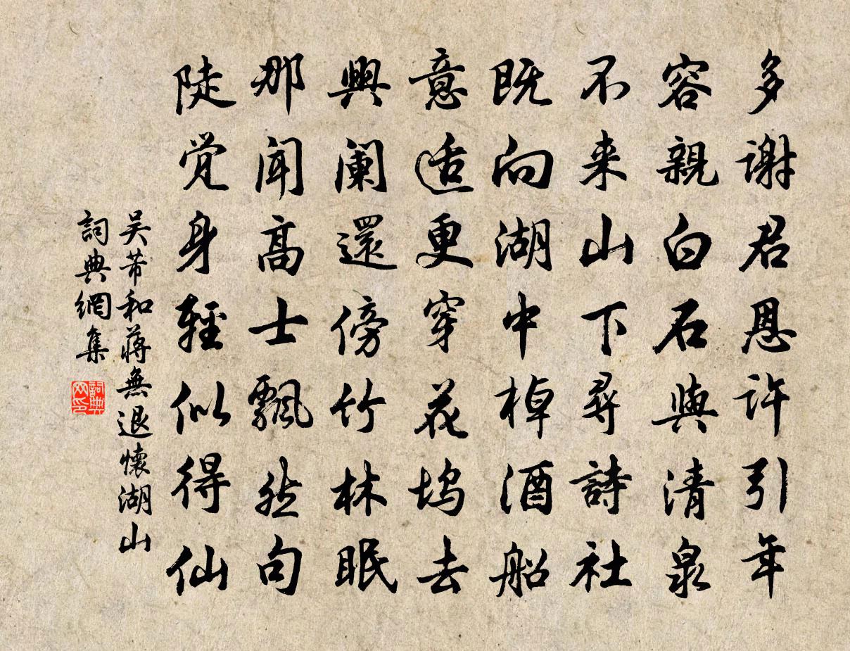 詩詞名句歷史字典書法欣賞書法字典國語詞典說文解字康熙字典古漢語字典標 題 作 者 詩 句 和蔣無退懷湖山作者:吳芾 朝代:宋代和蔣無退懷湖山原文多謝君恩許引年,容親白石與清泉。不來山下尋詩社,既向湖中棹酒船。意適更穿花塢去,興闌還傍竹林眠。那聞高士飄然句,陡覺身輕似得仙。詩詞問答問:和蔣無退懷湖山的作者是誰?答:吳芾問:和蔣無退懷湖山寫於哪個朝代?答:宋代吳芾和蔣無退懷湖山書法欣賞和蔣無退懷湖山書法作品詩詞推薦上陸鹽生辰五首黃公度〔宋代〕喜謨合補三公袞,餘事聊分八使車。想得忠勤徹旒冕,天涯洗眼看徵書。和顏長官百詠山居朱繼芳〔宋代〕宿世仙家十二樓,誤嬰時綱未深愁。浮丘輩行如相覓,騎卻紫雲歸去休。山濤徐鈞〔宋代〕身心已逐竹林游,為國搜賢事卻優。持正擬官覘上意,事君可作不忠謀。眉州燕遊雜詠十首晚賦園晁公溯〔宋代〕雜樹略就列,清晨時涉園。逢幽付鼻詠,懷新勞目存。梅花劉過〔宋代〕人間不盡春來意,恰則一枝梅更疏。待得和羹幾時在,祗今風月上新除。奉和聖制同皇太子游慈恩寺應制沈佺期〔唐代〕肅肅蓮花界,熒熒貝葉宮。金人來夢裡,白馬出城中。涌塔初從地,焚香欲遍空。天歌應春籥,非是為春風。贈硯趙蕃〔宋代〕一種端溪石,下岩滋別源。千金騰有翼,尺璧走非跟。自顧婆娑質,適堪椎鈍根。終焉老茅屋,已矣獻金門。次韻余時升見招郭印〔宋代〕老大逢春意轉微,追隨不復似當時。憐君舊已開三徑,顧我今方卜一枝。近水遙山元自好,暖風遲日更相宜。便當汾陰曲李新〔宋代〕吾愛西湖段乾木,凜然節概凌孤竹。遺風掃地青冢存,汾水千年為誰淥。水邊劍佩鏘寒玉,熊車來作江陽牧,忠梗感舊陸游〔宋代〕早參太史筆,晚典石渠書。孤立如羈雁,微生等蠹魚。虛名真忝竊,定理有乘除。九十稽山下,荒畦日荷鋤。高宗郊祀前廟朝享太廟三十首真宗〔宋代〕帝既臨享,步武鳴鶯。陟降規矩,顒昂周旋。登歌一再,典禮莫愆。神之聽之,祉福綿綿。獄中寄子由二首·其二蘇軾〔宋代〕柏台霜氣夜淒淒,風動琅璫月向低。夢繞雲山心似鹿,魂驚湯火命如雞。眼中犀角真吾子,身後牛衣愧老妻。百歲游碧落洞同李兟諸公顏庶幾〔宋代〕神地秘靈室,壺天鎖翠微。歌詠極今古,登臨忘是非。況有麋鹿侶,堪紉蘭蕙衣。得志此何遠,豈復懷塵機。送趙右秋二首華岳〔宋代〕閩藩齊指右參軍,玉骨清無半點塵。一味恤刑常召禍,十年遊宦只憂貧。圜扉月照金波夜,寒谷花開玉樹春。客子僑居一首蘇籀〔宋代〕匆匆五十化,已往固莫及。祠官閴中隱,歉歲屍糝粒。毀方非瓦合,知白無伊鬱。世悅鄒駱駝,我賢揚執戟。浮雲野興陸游〔宋代〕晨炊畲粟薦園蔬,默計生涯已有餘。舉世方夸稽古力,滿懷空貯活人書。悶呼赤腳行沽酒,出遣蒼頭旋僦驢。不為疏影(廬山瀑布)彭履道〔宋代〕銀雲縹緲。正石樑倒掛,飛下晴昊。早挽懸河,高瀉鯨宮,洪聲百步低小。分明仙仗崆峒過,又化作,歸帆杳杳。林欽之主簿挽章姜特立〔宋代〕敬讀銘鐫語,遙知磊落胸。主襟如郭震,豪氣似元龍。萬里摧車軸,三春折澗松。天雖不可問,餘慶後人鍾。和李十二舍人直日放朝對雪姚合〔唐代〕今朝街鼓何人聽,朝客開門對雪眠。豈比直廬丹禁里,九重天近色彌鮮。哭薛吏部林季仲〔宋代〕伯仲皆登第,人言薛與林。淒涼五年事,摧折兩家心。漫醉春來酒,誰同別後襟。空餘釣磯在,落日見孤岑。名句推薦自是荷花開較晚,孤負東風。幼卿《浪淘沙·極目楚天空》 屋上春鳩鳴,村邊杏花白。王維《春中田園作》 遊說萬乘苦不早,著鞭跨馬涉遠道。李白《南陵別兒童入京》 朝為越溪女,暮作吳宮妃。王維《西施詠》 二月江南花滿枝,他鄉寒食遠堪悲。孟雲卿《寒食》 撩亂舞晴空,發人無限思。劉禹錫《柳花詞三首》 但見淚痕濕,不知心恨誰。李白《怨情》 華而不實,恥也。左丘明《國語·晉語·秦伯享重耳以國君之禮》 策馬自沙漠,長驅登塞垣。高適《薊中作》 鈍學累功,不妨精熟顏之推《顏氏家訓·文章篇》