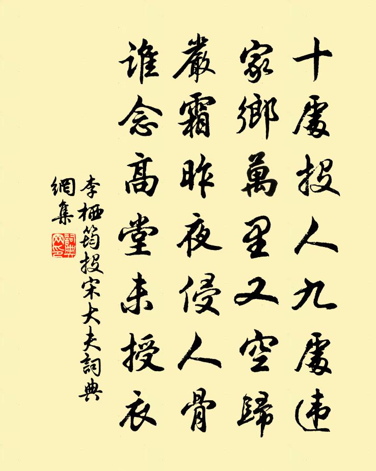 詩詞名句歷史字典書法欣賞書法字典國語詞典說文解字康熙字典古漢語字典標 題 作 者 詩 句 投宋大夫作者:李棲筠 朝代:唐代投宋大夫原文十處投人九處違,家鄉萬里又空歸。嚴霜昨夜侵人骨,誰念高堂未授衣。詩詞問答問:投宋大夫的作者是誰?答:李棲筠問:投宋大夫寫於哪個朝代?答:唐代問:投宋大夫是什麼體裁?答:七絕李棲筠投宋大夫書法欣賞投宋大夫書法作品注釋全唐詩:卷215_3詩詞推薦和潘孟陽春日雪回文絕句張薦〔唐代〕遲遲日氣暖,漫漫雪天春。知君欲醉飲,思見此交親。奉和御製讀後魏書夏竦〔宋代〕偉哉登國世,靈武定戎兵。拓土能圖大,求才實勵精。公侯新爵重,台省舊風清。自匪謨長世,鴻圖豈易成。雪王烈〔唐代〕雪飛當夢蝶,風度幾驚人。半夜一窗曉,平明千樹春。花園應失路,白屋忽為鄰。散入仙廚里,還如雲母塵。擬和元夕御製傅伯成〔宋代〕萬戶千門繡作團,未央宮闕聳巑岏。燈花無數排金粟,月魄不空倚扇紈。香繞御爐煙羃羃,玉瑤仙佩響珊珊。遊人句王嵒〔宋代〕暗穿地脈龍先覺,密贊天工雨不知。詠懷阮籍〔魏晉〕嘉樹下成蹊,東園桃與李。秋風吹飛藿,零落從此始。繁華有憔悴,堂上生荊杞。驅馬舍之去,去上西山趾。一身壽張亨泉提刑三首吳泳〔宋代〕二年煙雨漢皋亭,玉節西來照雪明。慷慨報君渾是膽,馳驅將母莫非誠。稻禾水足青疇潤,烽火宵閒紫邏清。鸞鳳大劍送別劉右史盧照鄰〔唐代〕金碧禹山遠,關梁蜀道難。相逢屬婉歲,相送動征鞍。地咽綿川冷,雲凝劍閣寒。倘遇忠孝所,為道憶長安。滿庭芳 贈道友徐司判馬鈺〔元代〕名韁相引,別離登州。遠來積石時秋。司判美任,止是一載因由。才到瓜期相逼,豈都無、行色憂愁。嘆往復,是念奴嬌·登石頭城次東坡韻薩都剌〔元代〕石頭城上,望天低吳楚,眼空無物。指點六朝形勝地,唯有青山如壁。蔽日旌旗,連雲檣櫨,白骨紛如雪。一江南鄠郊別墅寄所知溫庭筠〔唐代〕持頤望平綠,萬景集所思。南塘遇新雨,百草生容姿。幽鳥不相識,美人如何期。徒然委搖盪,惆悵春風時。晨起長喔後山秋懷十詩飲水一杯清寒徹心蘇泂〔宋代〕長喔十秋懷,清韻繞屋樑。曲逆有餓死,英布刑而王。向來為長公,甘受三徑荒。一身詎無餘,百年信難量。和林子長家庭韻袁說友〔宋代〕諸郎方競秀,蘭玉謝庭家。國士無雙譽,蟾宮第一花。侍嬪歌采苢,笄鬢綰堆鴉。已辦如椽筆,綿綿賦瓞瓜。次韻高秀才木芙蓉項安世〔宋代〕流落秋江世未知,知心未有子西詩。蘇韓句外新相識,孔孟門中許獨窺。不怨碧桃真義命,最宜青女好襟期。娉婷秋日村路夏竦〔宋代〕落照明殘菊,村亭路欲分。酒旗降遠客,雁陣戰秋雲。斷隴拳鰲足,輕波起鶴紋。田家逢樂歲,歌舞賀時君。三月十七日以檄出行賑貸旬日而復反自州門至趙蕃〔宋代〕浦口江頭艇子呼,有懷逸興恐成孤。非鬭郵傳憎塵土,自愛江山入畫圖。峰勢宛如神峻拔,瀑痕渾似筆濃枯。顧憐和警齋侍郎二首劉克莊〔宋代〕顏蒼鬢禿舊詞臣,幾見台家局面新。棲碧山中真大隱,立紅雲畔是前身。魯公昔有書乾祿,楊子今無賦逐貧。縱使謁金門張元乾〔宋代〕風露底。石上岸巾愁起。月到房心天似水。亂峰清影里。此去登瀛須記。今夕道山同醉。春殿明年人共指。玉皇香錦堂春·墜髻慵梳柳永〔宋代〕墜髻慵梳,愁蛾懶畫,心緒是事闌珊。覺新來憔悴,金縷衣寬。認得這疏狂意下,向人誚譬如閒。把芳容整頓,恁蕉庵清坐樓鑰〔宋代〕薄晚歸來煙已蒼,蠻蕉一葉障斜陽。不須久住潭潭府,始覺山林興味長。名句推薦向淺洲遠渚,亭亭清絕。張炎《疏影·詠荷葉》 攜盤獨出月荒涼,渭城已遠波聲小。李賀《金銅仙人辭漢歌》 不充詘於富貴,不遑遑於所欲。姚察、姚思廉《梁書·列傳·卷五十》 浮雲不共此山齊,山靄蒼蒼望轉迷韓翃《宿石邑山中》 離愁漸遠漸無窮,迢迢不斷如春水。歐陽修《踏莎行·候館梅殘》 吳洲如見月,千里幸相思。李白《送張舍人之江東》 待人寬一分是福,利人實利己的根基。洪應明《菜根譚·概論》 凡令之行也,必待近者之勝也,而令乃行。管仲《管子·重令》 煙柳畫橋,風簾翠幕,參差十萬人家。柳永《望海潮·東南形勝》 盈盈一點芳心,占多少春光,問卿知否?紅妝莫斗顧太清《玉燭新·白海棠》
