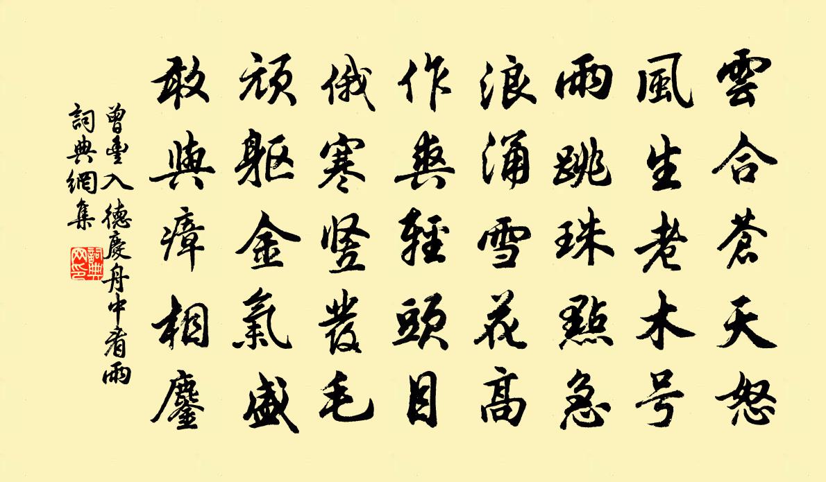 詩詞名句歷史字典書法欣賞書法字典國語詞典說文解字康熙字典古漢語字典標 題 作 者 詩 句 入德慶舟中看雨作者:曾豐 朝代:宋代入德慶舟中看雨原文雲合蒼天怒,風生老木號。雨跳珠點急,浪涌雪花高。作爽輕頭目,俄寒豎發毛。頑軀金氣盛,敢與瘴相鏖。詩詞問答問:入德慶舟中看雨的作者是誰?答:曾豐問:入德慶舟中看雨寫於哪個朝代?答:宋代曾豐入德慶舟中看雨書法欣賞入德慶舟中看雨書法作品詩詞推薦懷白石社尊師道堅仇遠〔宋代〕我思南山陽,穀神何綿綿。松下笑相別,惚恍忘歲年。寄我猶龍經,文字入幽玄。終期白石頂,擊竹歌遊仙。送源中丞充新羅冊立使(侍中之孫)劉禹錫〔唐代〕相門才子稱華簪,持節東行捧德音。身帶霜威辭鳳闕,口傳天語到雞林。煙開鰲背千尋碧,日浴鯨波萬頃金。想見清平樂 此篇促游山劉敏中〔元代〕今晨過望。盡得山形狀。石險路危心欲盪。手撥白雲又上。半空仰見仙庵。山靈許我高探。倦處旋傾春酒,不愁冒【商調】梧葉兒_次韻鴛鴦浦張可久〔元代〕次韻鴛鴦浦,鸚鵡洲,竹葉小漁舟。煙中樹,山外樓,水邊鷗,扇面兒瀟湘暮秋。頌古五十五首釋紹曇〔宋代〕飛騎將軍入虜庭,兵機煉得十分精。誰知敗績緣欺敵,致使凌煙易姓名。秋扇顧逢〔宋代〕明月藏塵篋,曾歸掌握中。得時思酷暑,袖手怯西風。用舍人相似,炎涼心不同。汗流沾背處,蔽日豈無功。和陶答龐參軍三送張中。蘇軾〔宋代〕留燈坐達曉,要與影晤言。下帷對古人,何暇復窺園。使君本學武,少誦《十三篇》。頗能口擊賊,戈戟亦森然。山行孫應時〔宋代〕中年意與山林會。勝日身兼杖屨輕。正有百錢堪獨往,不將一賞負秋晴。和汴州李相公勉人日喜春戴叔倫〔唐代〕年來日日春光好,今日春光好更新。獨獻菜羹憐應節,遍傳金勝喜逢人。煙添柳色看猶淺,鳥踏梅花落已頻。東閤讀改元詔口號戴復古〔宋代〕喜見新除目,焚香洗眼看。老儒居翰苑,正士作台官。有道為時用,非才處位難。寄聲崔與李,催促到長安。聞宜春諸舉子陪郡主登河梁玩月黃頗〔唐代〕一年秋半月當空,遙羨飛觴接庾公。虹影迥分銀漢上,兔輝全寫玉筵中。笙歌送盡迎寒漏,冰雪吟消永夜風。雖向桃花李中〔唐代〕只應紅杏是知音,灼灼偏宜間竹陰。幾樹半開金谷曉,一溪齊綻武陵深。艷舒百葉時皆重,子熟千年事莫尋。誰步清華園劉月房〔宋代〕水光搖入碧窗寒,兩岸斜陽照亂山。才一吟詩便多事,只消靜對綠陰閒。臥病累日羸甚偶復小健戲作陸游〔宋代〕伏枕瀕九死,下床如再生。幸回蒿里駕,猶作越吟聲。拂幾嗟麈積,開書覺眼明。淖糜方自養,未敢憶南烹。句鄭俠〔宋代〕未言路上舟車費,尚欠城中酒藥錢。盜焚浦江龍德寺經藏與捲軸化為玉諸葛亮公談鄭剛中〔宋代〕盜火陳蘭若,一燎無餘屋。獨此龍宮書,入火變為玉。琤然斷甓中,幖帙猶可目。眾謂有哲匠,秘願發心腹。提斧游鼓山喝水岩姜特立〔宋代〕昔聞鼓山名,未到鼓山寺。勝游不易得,一失恐難值。今朝忽勇猛,便作入山計。雖無濟勝具,尚可策疲致。松下減字木蘭花(內子生日)程大昌〔宋代〕距春五日。吉語攙先來飲席。易卦占新。八八周輪又再輪。開年定好。定把笙歌更藥裹。舊怕無孫。今已藍袍擁繡次韻任伯塗中見寄晁說之〔宋代〕命駕關東千里余,拂衣前去未勤渠。自憐病客料秦虎,共學騷人憶郢閭。賦就句奇輕惡道,詩成意遠欲閒居。此生滿江紅呂勝己〔宋代〕往事千端,都笑道、衰翁宦拙。今會得、人情物態,盡皆休說。廣廈盡堪舒笑傲,層樓又見凌空闊。試閒思、畫戟名句推薦治於神者,眾人不知其功;爭於明者,眾人知之。墨子《墨子·50章 公輸》 不惜千金買寶刀,貂裘換酒也堪豪。秋瑾《對酒·不惜千金買寶刀》 綠酒初嘗人易醉。一枕小窗濃睡。晏殊《清平樂·金風細細》 雍雍新雁咽寒聲,愁恨年年長相似。李煜《謝新恩·冉冉秋光留不住》 相顧無相識,長歌懷採薇。王績《野望》 奢侈者鮮有不敗李大師、李延壽《南史·列傳·卷四十五》 一夜嬌啼緣底事,為嫌衣少縷金華。韋莊《與小女》 一蓑煙雨任平生。蘇軾《定風波·莫聽穿林打葉聲》 丈夫為志,窮當益堅,老當益壯。范曄《後漢書·列傳·馬援列傳》 冰簟銀床夢不成,碧天如水夜雲輕。溫庭筠《瑤瑟怨》