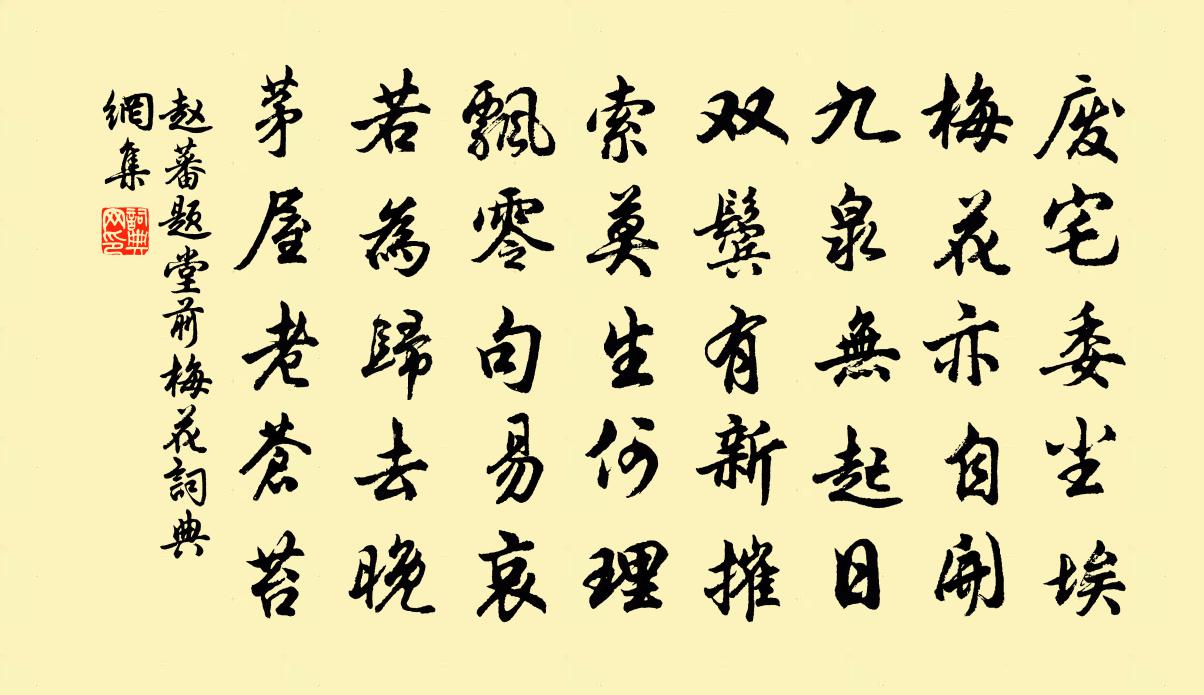 詩詞名句歷史字典書法欣賞書法字典國語詞典說文解字康熙字典古漢語字典標 題 作 者 詩 句 題堂前梅花作者:趙蕃 朝代:宋代題堂前梅花原文廢宅委塵埃,梅花亦自開。九泉無起日,雙鬢有新摧。索莫生何理,飄零句易哀。若為歸去晚,茅屋老蒼苔。詩詞問答問:題堂前梅花的作者是誰?答:趙蕃問:題堂前梅花寫於哪個朝代?答:宋代趙蕃題堂前梅花書法欣賞題堂前梅花書法作品詩詞推薦戲德秀幾道陳棣〔宋代〕小檻新篁脫籜初,依然數軸壁間書。已無塵落清聲外,空有香分素手余。古獄冤銷神劍去,高堂夢破曉雲疏。圜扉同陳秘監諸丈送黃商伯守常州石叔訪守上饒會彭龜年〔宋代〕惠山滋華池,玉山潤百卉。二賢競出守,山水亦 * 。人生別離難,朋舊走相謂。尅期會南湖,肯托簡書畏。敬酌與謝翱贈答詩金車美人〔唐代〕陽台後會杳無期,碧樹煙深玉漏遲。半夜香風滿庭月,花前空賦別離詩。相思無路莫相思,風裡花開只片時。惆悵雪竇顯禪師贊釋智遇〔宋代〕凝而不結,混而常清。挺然岳立,卒乎砥平。擬師這道兮虛空釘橛,美師之德兮色重里膠青。妙高萬疊兮春歸錦鏡摸魚兒·更能消幾番風辛棄疾〔宋代〕淳熙己亥,自湖北漕移湖南,同官王正之置酒小山亭,為賦更能消、幾番風雨。匆匆春又歸去。惜春長恨花開早,李翱參藥山圖贊釋智愚〔宋代〕黑豆數無窮,青松蓋盡。癯然老比丘,即此吾無隱。更提雲水曲周遮,添得傍人眼晨花。黃白菊史鑄〔宋代〕金英鑠樂擅秋芳,中有孤叢色奪霜。手把數枝重疊嗅,兩般顏色一般香。寄洪舍人二絕喻良能〔宋代〕仲氏昔嘗司宥密,長公元已轉洪鈞。紫微豈久承流地,黃合終須報主身。謝徐璣惠茶徐照〔宋代〕建山惟上貢,採擷極艱辛。不擬分奇品,遙將寄野人。角開秋月滿,香入井泉新。靜室無來客,碑黏陸羽真。六月二十八日立秋方回〔宋代〕平生為客太匆匆,已上西江又復東。只信一朝飛舴艋,何知五度落梧桐。絕憐牛女常遭謗,粗足蓴鱸不嘆窮。世外贈吳太博二首宋祁〔宋代〕月轉觚稜玉樹齊,通宵歸夢繞金閨。柔桑密映秦樓騎,溫詔香懷漢署泥。殺簡載書傳祖德,懷金酌水賦新題。丹楓對花微疾不飲呈坐中諸公杜牧〔唐代〕花前雖病亦提壺,數調持觴興有無?盡日臨風羨人醉,雪香空伴白髭鬚。野路見棠梨紅葉為斜日所照尤可愛宋祁〔宋代〕葉葉棠梨戰野風,滿枝哀意為秋紅。無人解賞如丹意,拋在荒城斜照中。句釋惠崇〔宋代〕危溜含清瑟,飛花點玉觴。送宋伯潛宰高安陳傅良〔宋代〕秋風日來諗,役車何時休。有鳴丘中琴,玉瓚懷黃流。此腰不可折,此笏未忍抽。亦入雁鶩行,而為稻粱謀。四海普州鐵山福濟廟祀神曲送神李新〔宋代〕伐鼓兮隆隆,風雨時兮歲豐。刲羊炰羔兮旨酒清潔,相與答神兮繼日以月。肉掩豆兮中禮,盞斝酢兮告終。神之福聽雨宋伯仁〔宋代〕凍雨瀟瀟未肯晴,灑窗聲似煮茶聲。山童酤得鄰家酒,炒栗爐頭獨自傾。夜過洞庭殷堯藩〔唐代〕笙歌只解鬧花天,誰是敲冰掉小船。為覓瀟湘幽隱處,夜深載月聽鳴泉。擬玉台體七首坐領邊繡歐陽修〔宋代〕雙鴛刺繡領,粲爛五文章。暫近已復遠,猶持歌扇障。頌古五十五首釋紹曇〔宋代〕飛騎將軍入虜庭,鑰旗未動死生分。戰酣馳入中軍寨,且聽元戎議賞勛。名句推薦春風春雨花經眼,江北江南水拍天。黃庭堅《次元明韻寄子由》 古人忠孝,不離心頭,今人忠孝,不離口頭,此是何等志量。王永彬《圍爐夜話·第二三則》 人學始知道,不學亦徒然。佚名《增廣賢文·上集》 夜寒茅店不成眠,殘月照吟鞭。吳激《訴衷情·夜寒茅店不成眠》 解釋春風無限恨,沉香亭北倚闌乾。李白《清平調·其三》 草秀故春色,梅艷昔年妝。李世民《元日》 山高月小,水落石出。蘇軾《後赤壁賦》 和戎詔下十五年,將軍不戰空臨邊。陸游《關山月》 世有伯樂,然後有千里馬。千里馬常有,而伯樂不常有。韓愈《雜說四·馬說》 細讀離騷還痛飲,飽看修竹何妨肉。辛棄疾《滿江紅·山居即事》