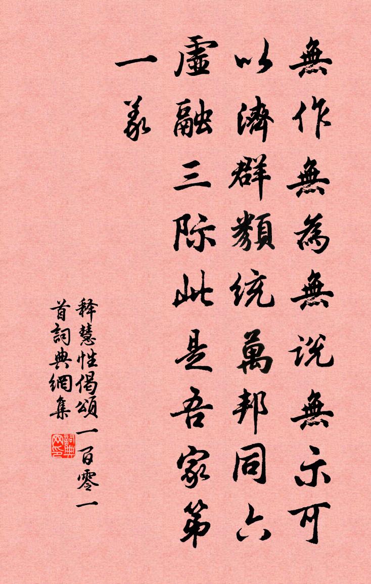 詩詞名句歷史字典書法欣賞書法字典國語詞典說文解字康熙字典古漢語字典標 題 作 者 詩 句 偈頌一百零一首作者:釋慧性 朝代:宋代偈頌一百零一首原文無作無為,無說無示。可以濟群,類統萬邦。同六虛,融三際,此是吾家第一義。詩詞問答問:偈頌一百零一首的作者是誰?答:釋慧性問:偈頌一百零一首寫於哪個朝代?答:宋代釋慧性偈頌一百零一首書法欣賞偈頌一百零一首書法作品詩詞推薦朝中措賈逸祖〔宋代〕青山隱隱水斜斜。修竹兩三家。又是水寒山瘦,依然行客遍天涯。天教流落,東西南北,不恨年華。只恨夜來風雨桃源憶故人 五台月長老來點茶馬鈺〔元代〕五台月老通三要。便把三彭除剿。運用三車皎皎。般載三乘妙。龍華三會心明曉。頓覺三光並照。個內三壇設醮。遊仙詞三十三首王鎡〔宋代〕金鐘三響紫微宮,玉樹煙飄輦路風。彩鳳已銜仙詔去,九天朝罷五雲中。阮郎歸張掄〔宋代〕誰言無處避炎光。山中有草堂。安然一枕即仙鄉。竹風穿戶涼。名不戀,利都忘。心閒日自長。不須辛苦覓瓊漿。去年秋偶游寶山上方入一小院闃然無人有僧隱蘇軾〔宋代〕此雲闍黎也不出十五年矣今年六月自常潤還復至其室則死葬數月矣作詩題其壁雲師來寶山,一住十五秋。讀書常閉游洞霄宮張巽〔宋代〕新晴草木翠光流,麥隴清和四月秋。巽二風來山發冷,阿香雷過馨聲幽。杜鵑閧枕催歸去,丁鶴攀轅欲借留。半夜挽周宣教宗沂二首廖行之〔宋代〕子職勤勞眾莫攀,巴丘高節世尤難。一官未抵琴書樂,三釜何如菽水歡。儻有軒裳存妙句,平居豐儉只儒酸。音容次韻起岩喜雪范成大〔宋代〕吹成一雪便吹殘,風伯無端豈坐慳。夜報飛花平瓦壟,曉驚疏雨落檐間。休教凍解魚龍水,更待誠通虎豹關。準擬滿江紅吳泳〔宋代〕嘉定甲申之秋,七月良夜,夢歸家山,過鶴林之下。見老鶴翩躚,從西南來,方瞳而朱頂,玉立而長身,其色內白在金日作宇文虛中〔金代〕遙夜沉沉滿幕霜,有時歸夢到家鄉。傳聞已筑西河館,自許能肥北海羊。回首兩朝俱草莽,馳心萬里絕農桑。人生過大哥宅探得歌字韻李隆基〔唐代〕魯衛情先重,親賢愛轉多。冕旒豐暇日,乘景暫經過。戚里申高宴,平台奏雅歌。復尋為善樂,方驗保山河。送楊少府貶郴州王維〔唐代〕明到衡山與洞庭,若為秋月聽猿聲。愁看北渚三湘遠,惡說南風五兩輕。青草瘴時過夏口,白頭浪里出湓城。長沙聽雨軒四首李洪〔宋代〕脫帽風檐迎晚吹,催詩急雨喚輕雷。祗應荷氣薰人醉,不用輪囷象鼻杯。高士詠荷莜晨門吳筠〔唐代〕荷莜隱耕藝,晨門潛抱關。道尊名可賤,理愜心彌閒。混跡是非域,縱懷天地間。同譏孔宣父,匿景杳不還。南鄉子晏幾道〔宋代〕何處別時難,玉指偷將粉淚彈。記得來時樓上燭,初殘。待得清霜滿畫闌。不慣獨眠寒,自解羅衣襯枕檀。百媚也長干行陸游〔宋代〕裙腰綠如草,衫色石榴花,十二學彈箏,十三學琵琶。寧嫁與商人,夫婦各天涯,朝朝問水神,夜夜夢三巴。聘金奉和驪山高頂寓目應制李嶠〔唐代〕步輦陟山巔,山高入紫煙。忠臣還捧日,聖后欲捫天。迥識平陵樹,低看華岳蓮。帝鄉應不遠,空見白雲懸。題德范弟三香圖牟巘五〔宋代〕水仙侑食老逋家,更著江南小白花。三雅如渠好兄弟,眾芳未許以肩差。偈頌一百六十首釋宗杲〔宋代〕一二三四五,五四三二一。返覆數千回,總不出今日。霜風颳地來,法身赤骨{左骨右歷}。題尊信齋陸游〔宋代〕於虖蓋孔孟何其蓋卓,如天蓋日月地海岳。正令舉世皆楊墨,邪正豈復勞商搉?雖然此道久橫流,執熱其誰不思濯名句推薦謝公最小偏憐女,自嫁黔婁百事乖。元稹《遣悲懷三首·其一》 舉大事必有所資李大師、李延壽《南史·列傳·卷五十三》 人學始知道,不學非自然。孟郊《勸學》 凡戰,所謂攻者,知彼者也。佚名《百戰奇略·第四卷·攻戰》 去年花里逢君別,今日花開已一年。韋應物《寄李儋元錫》 不說自己井繩短,反說他人箍井深。佚名《增廣賢文·下集》 步從容,立端正。揖深圓,拜恭敬。李毓秀《弟子規·謹》 眾生必死,死必歸土:此之謂鬼。戴聖《禮記·祭義》 道狹草木長,夕露沾我衣。陶淵明《歸園田居·其三》 天涯海角悲涼地,記得當年全盛時。趙鼎《鷓鴣天·建康上元作》